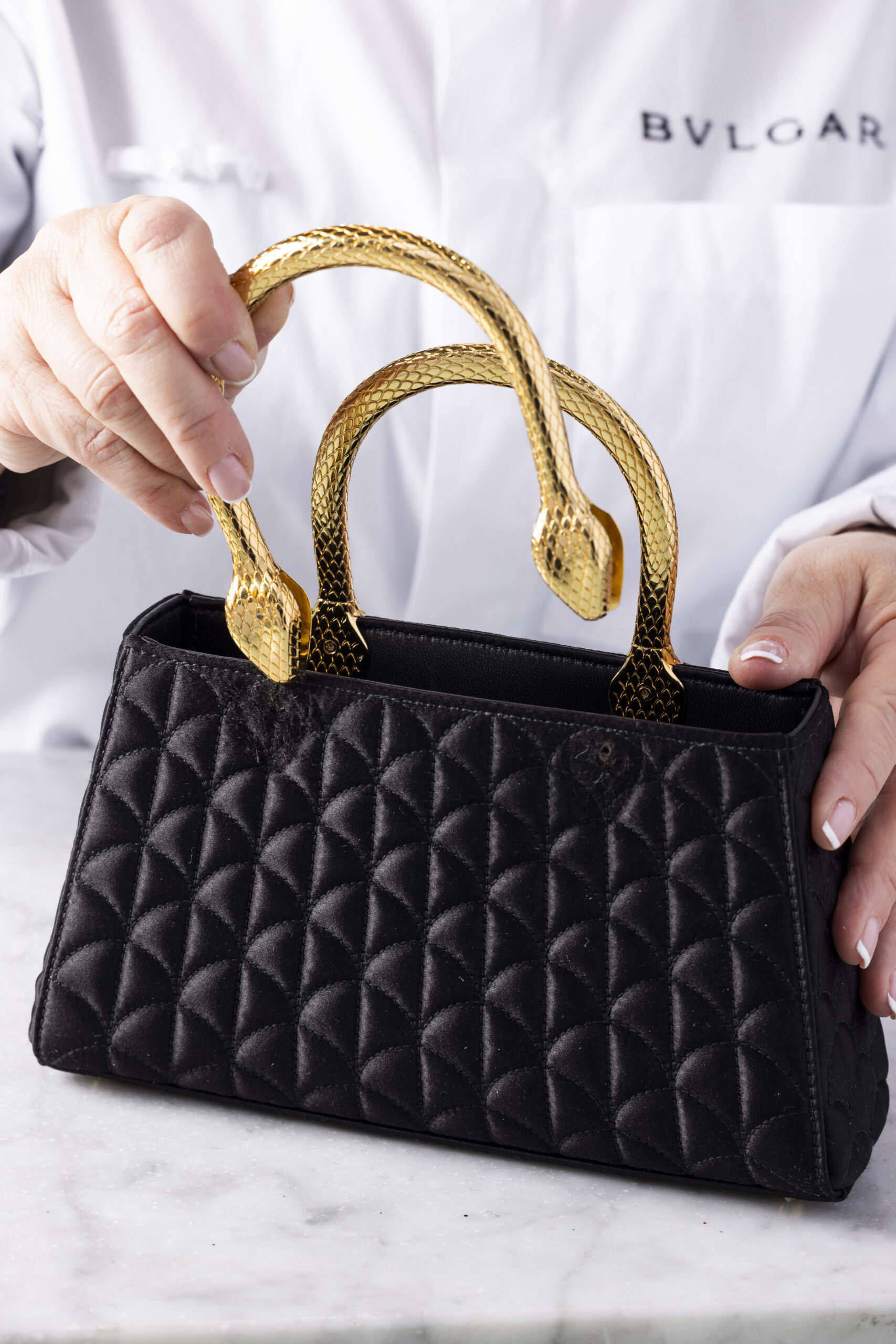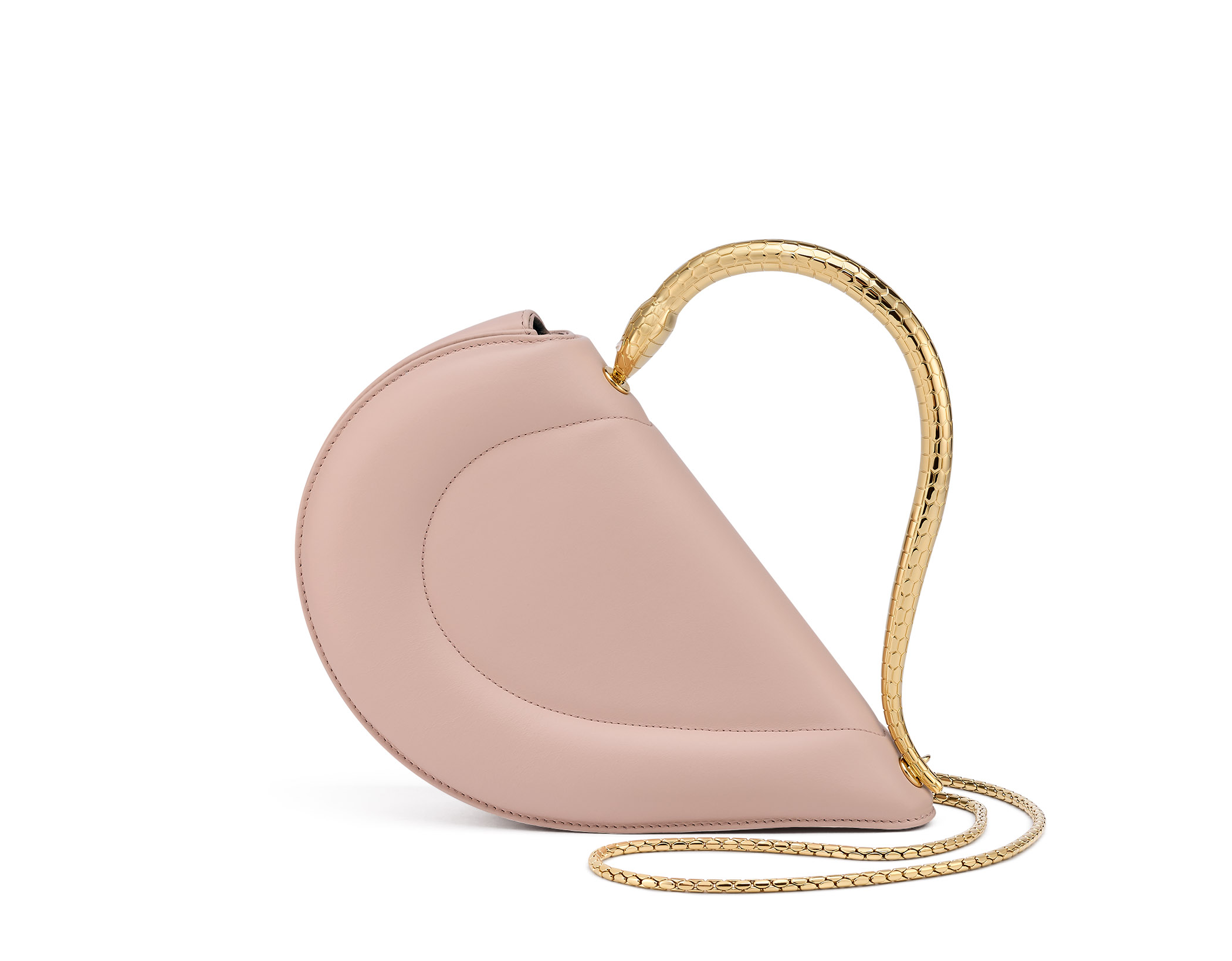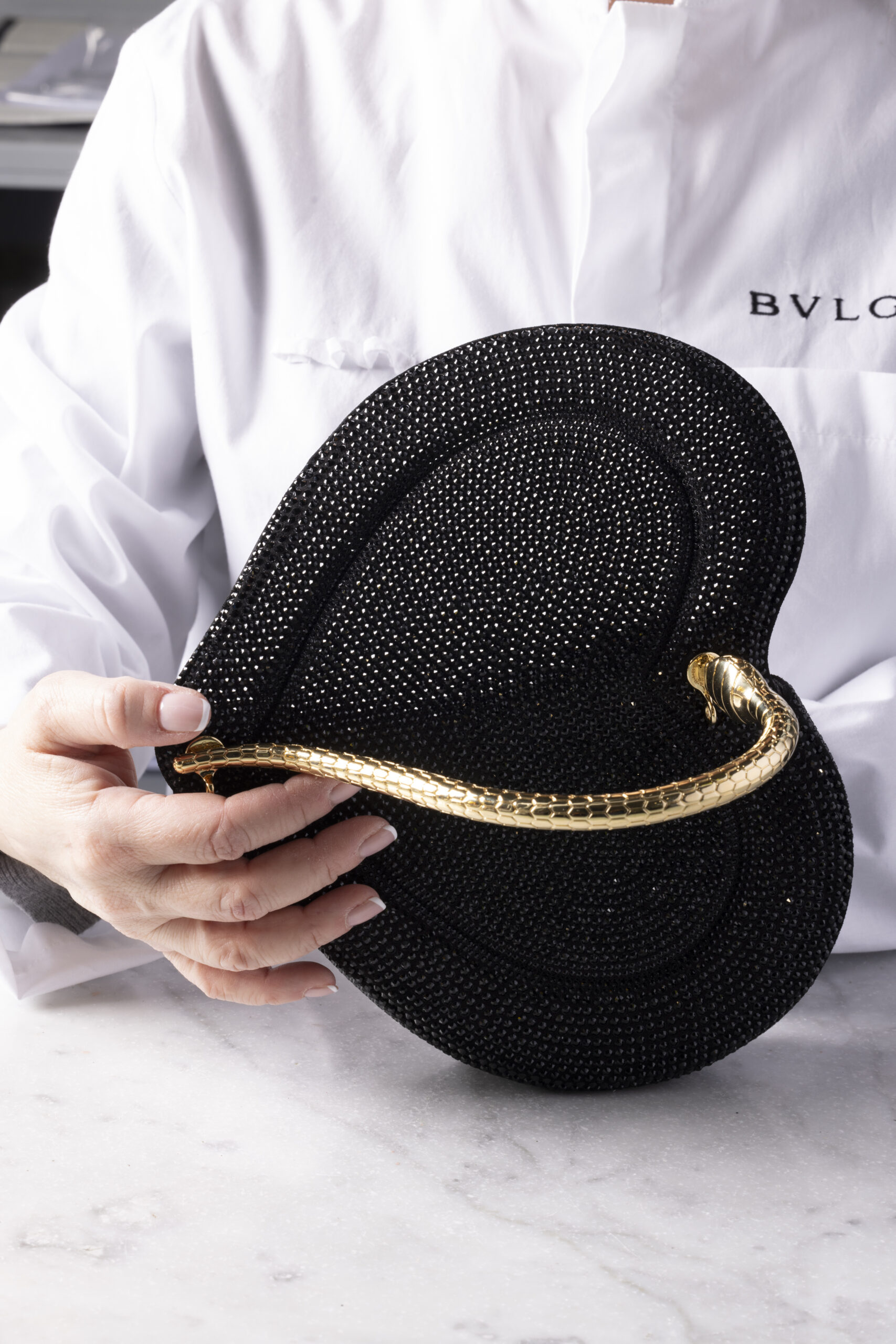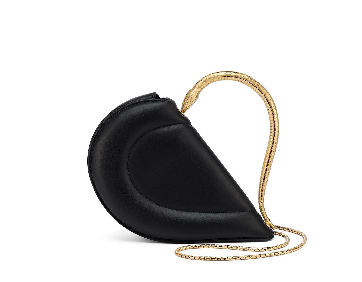 Le sac Serpenti Cuore 1968, par exemple, est une déclaration d’amour à l’icône Serpenti. Inspiré par la montre joaillière Bvlgari Serpenti Harlequin de 1968, ce sac en forme de cœur symbolise les métamorphoses infinies et le charme magnétique de la Maison. La poignée métallique en forme de serpent, ornée d’émaux multicolores, est un véritable chef-d’œuvre d’artisanat, réalisé grâce à la technique de la « cire perdue », une tradition profondément ancrée dans le savoir-faire joaillier de Bvlgari.