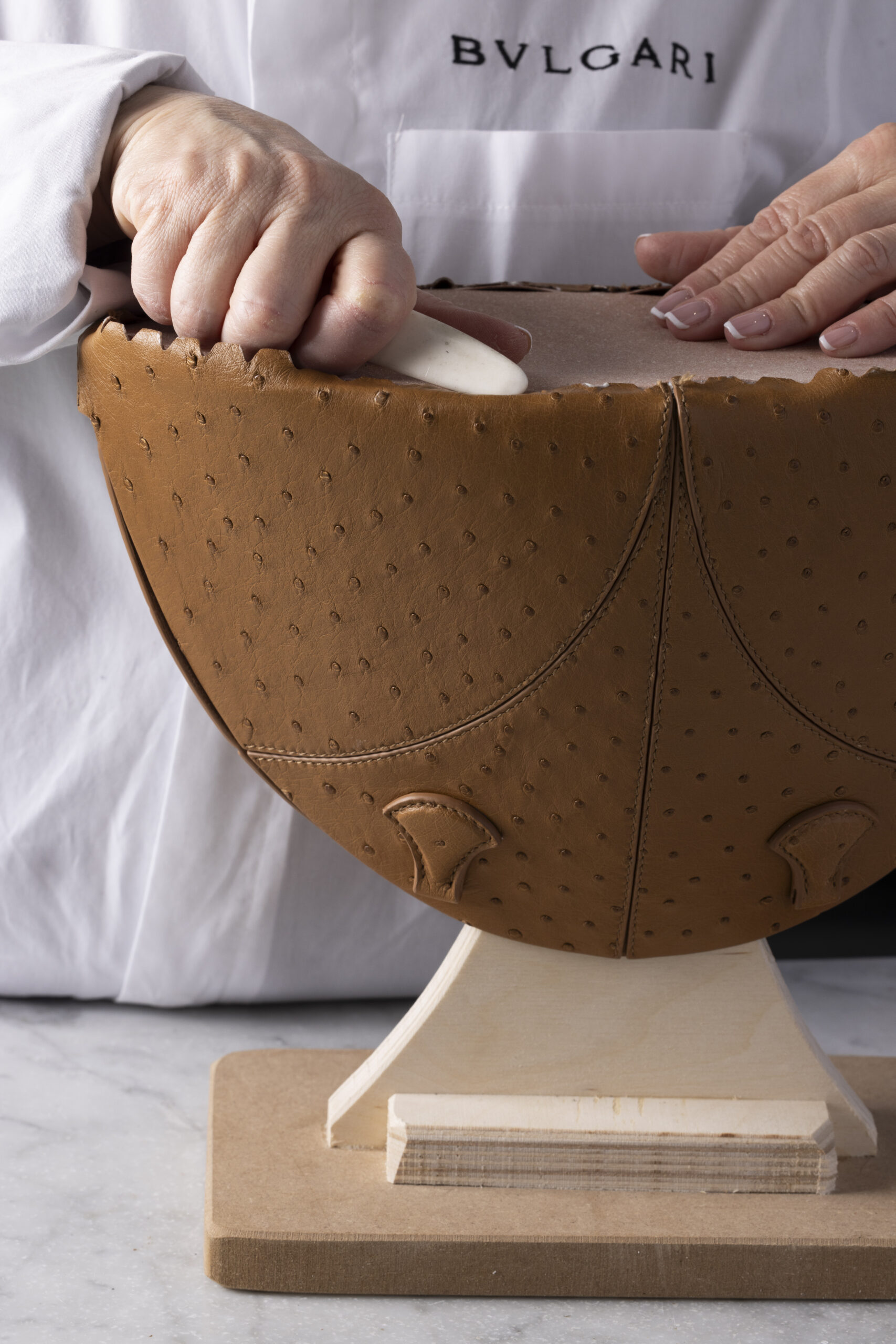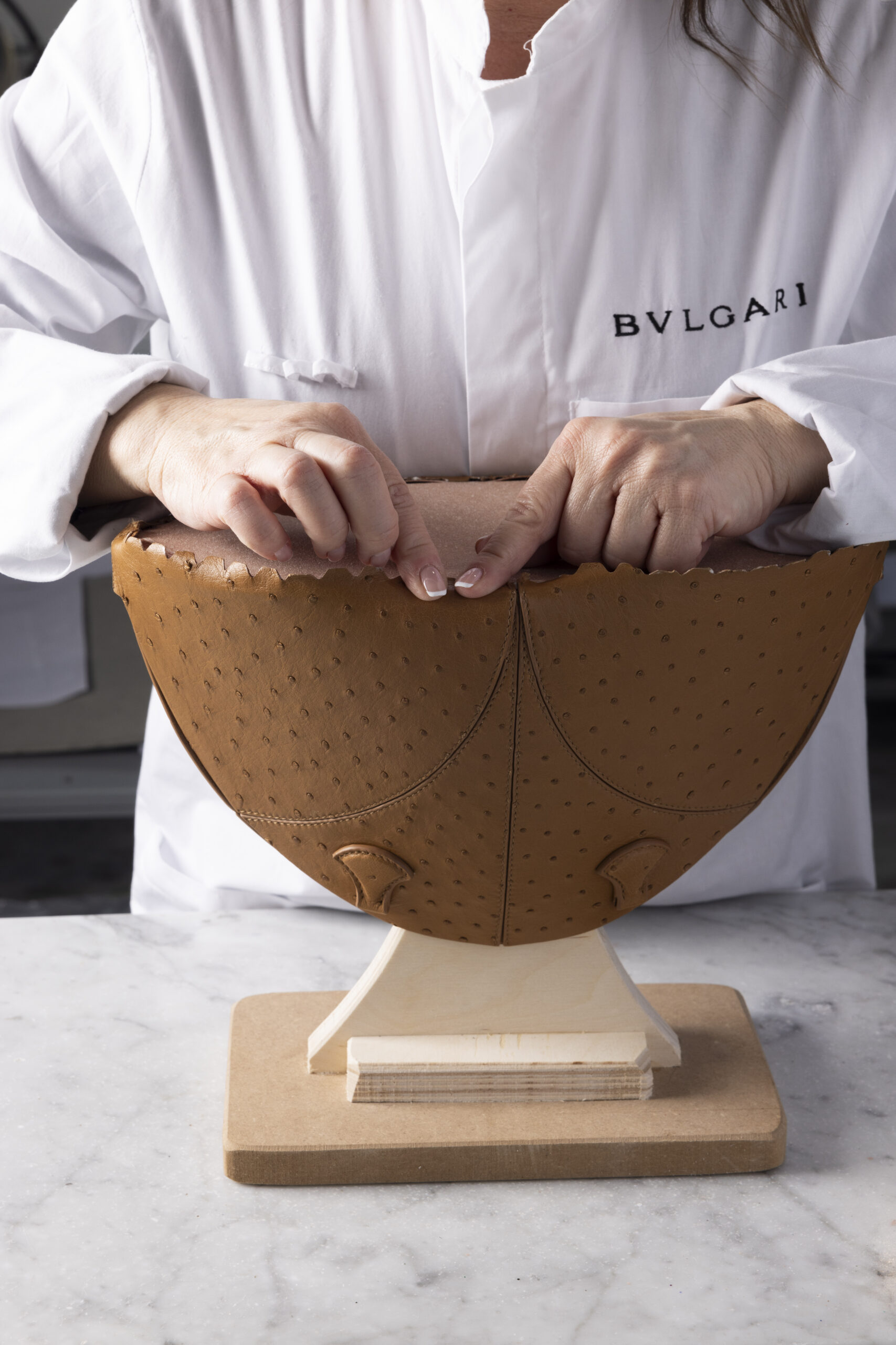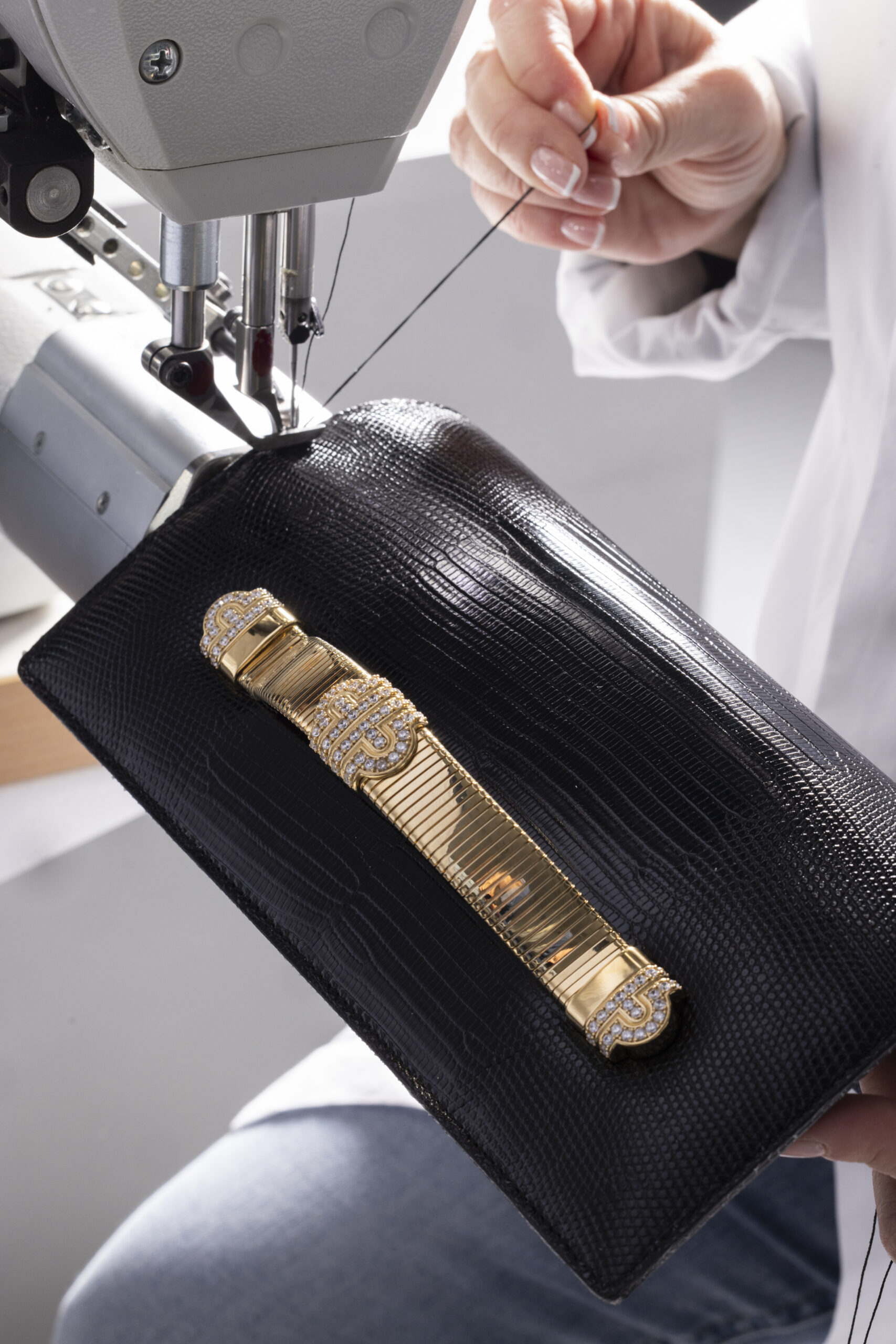 La collection Automne-Hiver 2025 est un véritable hommage à l’excellence et à l’artisanat d’art. Chaque pièce est le fruit d’un savoir-faire d’exception, où les techniques complexes de joaillerie fusionnent avec l’art du travail du cuir. La pochette Bvlgari Tubogas, par exemple, est conçue avec une poignée métallique reproduisant fidèlement les spires flexibles d’inspiration industrielle de Tubogas, une technique d’orfèvrerie signature de la Maison depuis les années 1940.