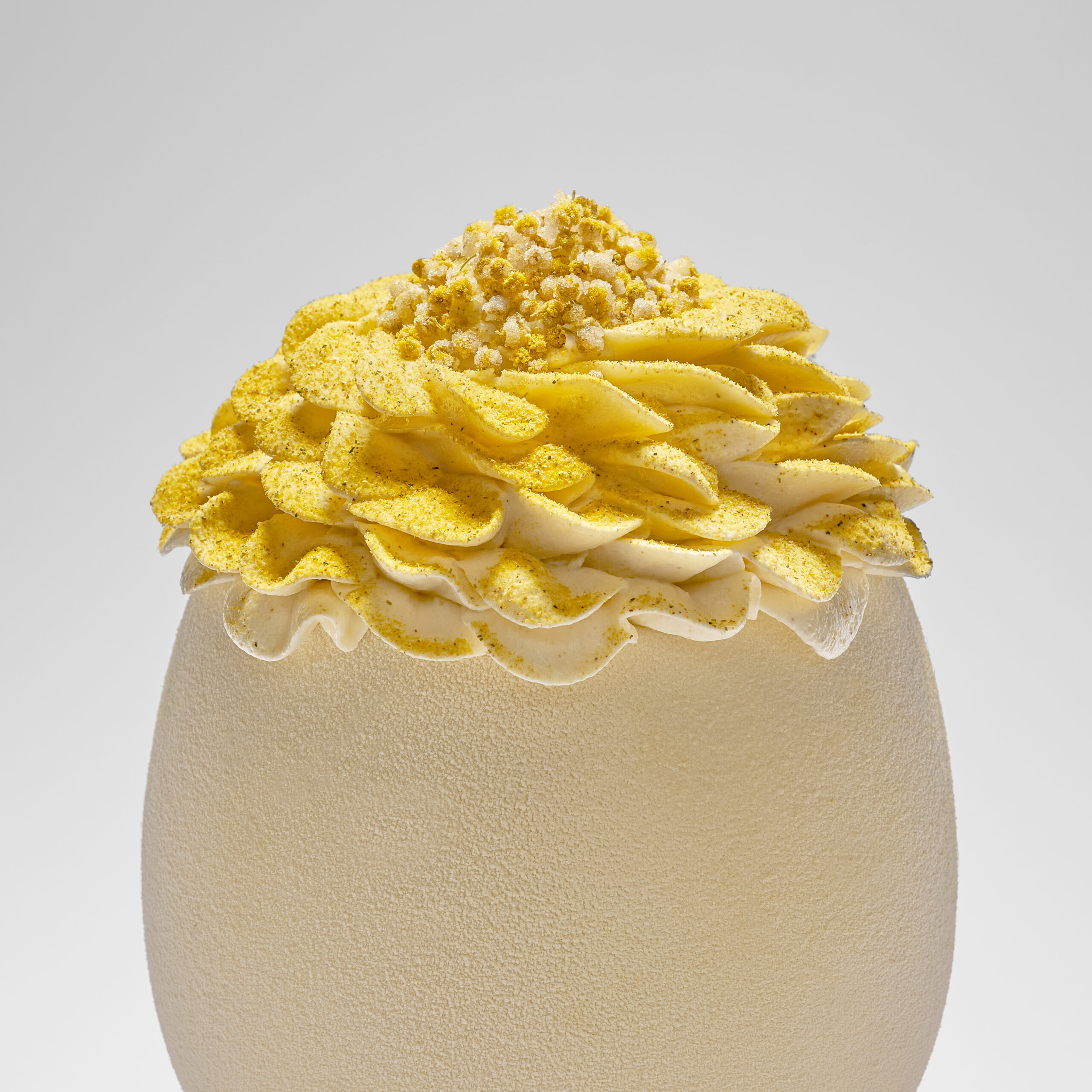 Éphémère et éclatante, la fleur de mimosa s’impose comme la muse de cette création. Symbole du renouveau et de la lumière, elle habille l’Œuf Mimosa de sa parure jaune d’or. Les fleurs, récoltées en pleine floraison, sont cristallisées avec minutie, capturant ainsi leur essence et leur éclat naturel.