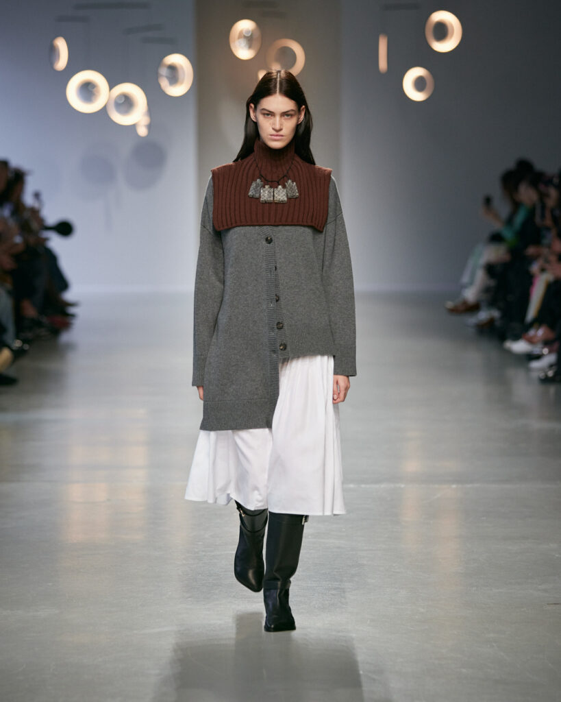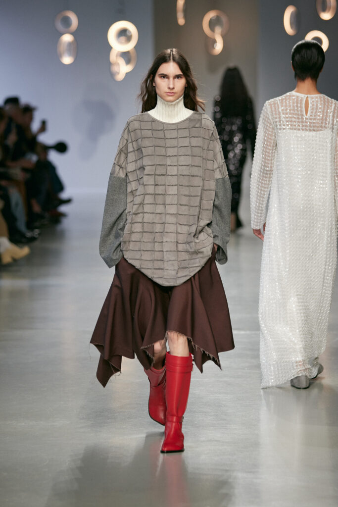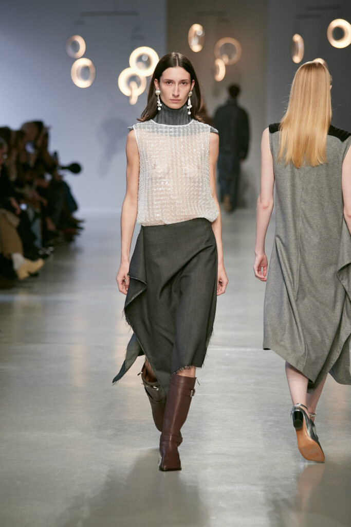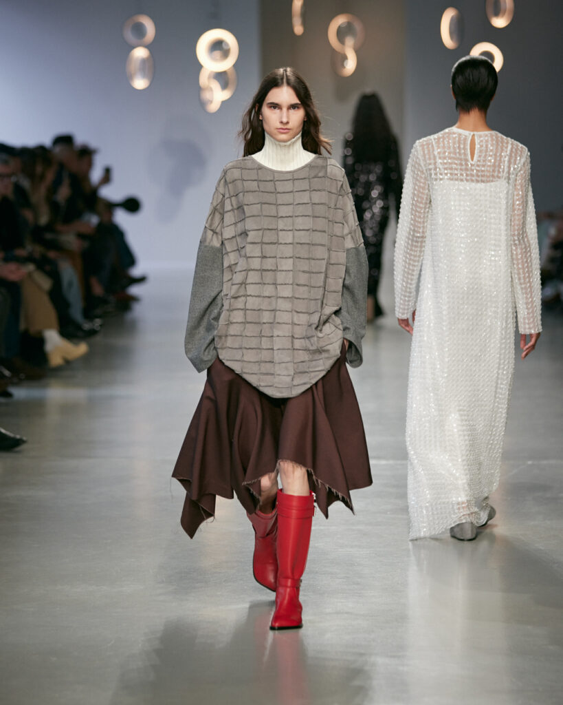 Dans une palette neutre et minérale, ponctuée de rouge cerise et d’argent vieilli, la collection joue sur les tensions entre matières solides et textures délicates.