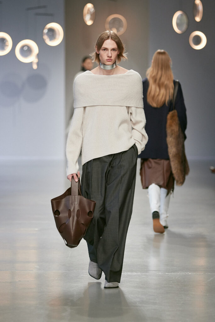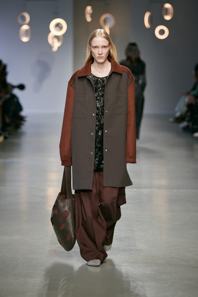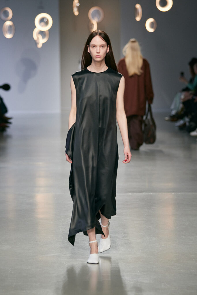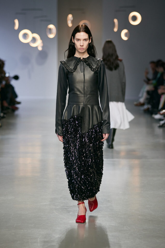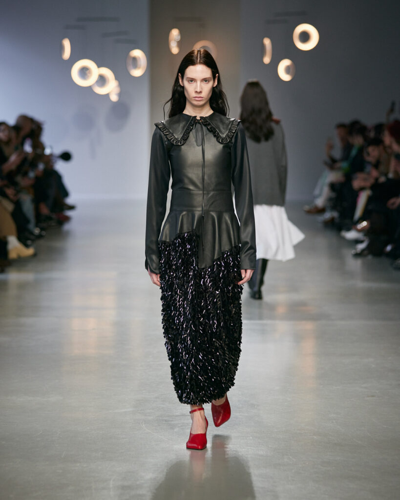 Dans une palette neutre et minérale, ponctuée de rouge cerise et d’argent vieilli, la collection joue sur les tensions entre matières solides et textures délicates.