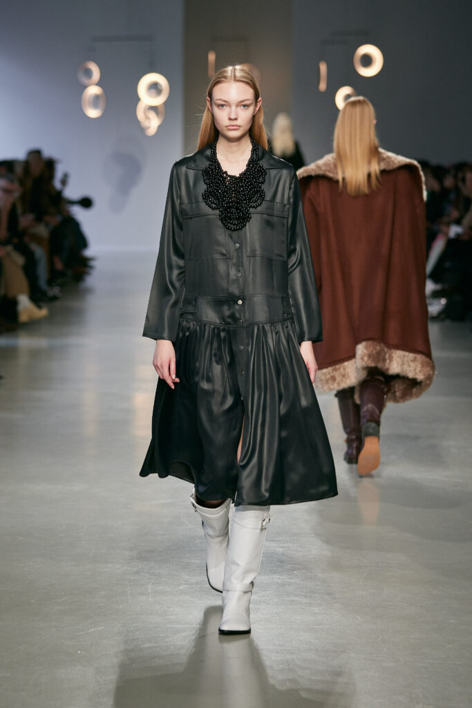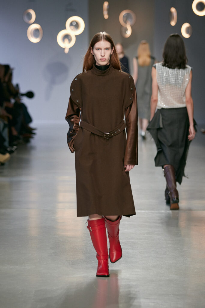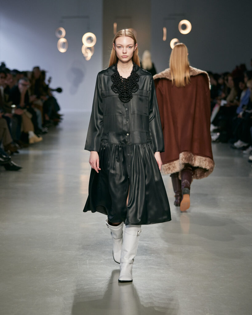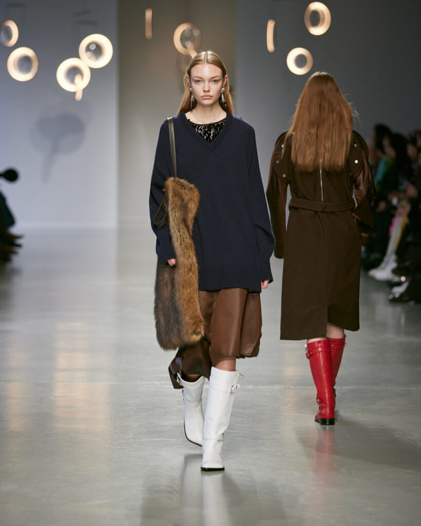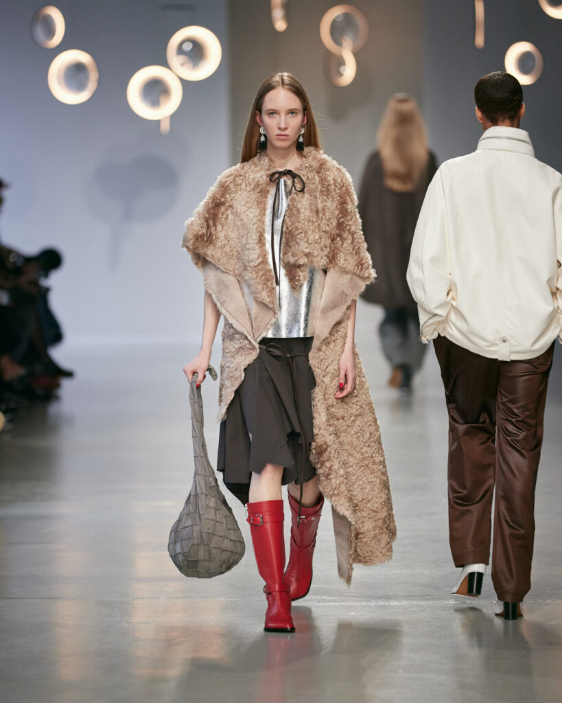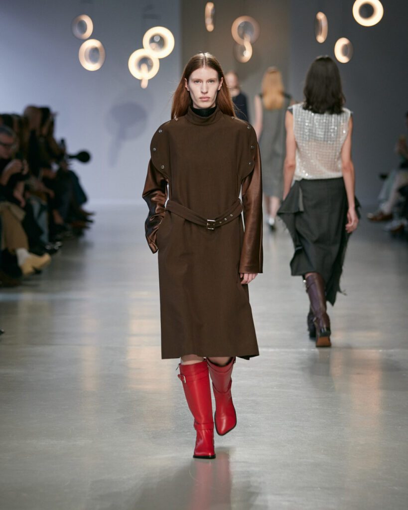 - Des boots d’équitation ancrent la silhouette, entre élégance aristocratique et instinct nomade.