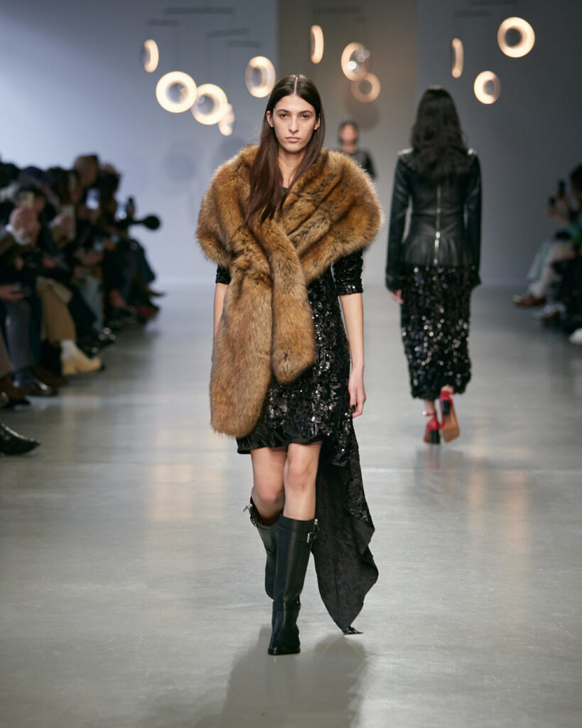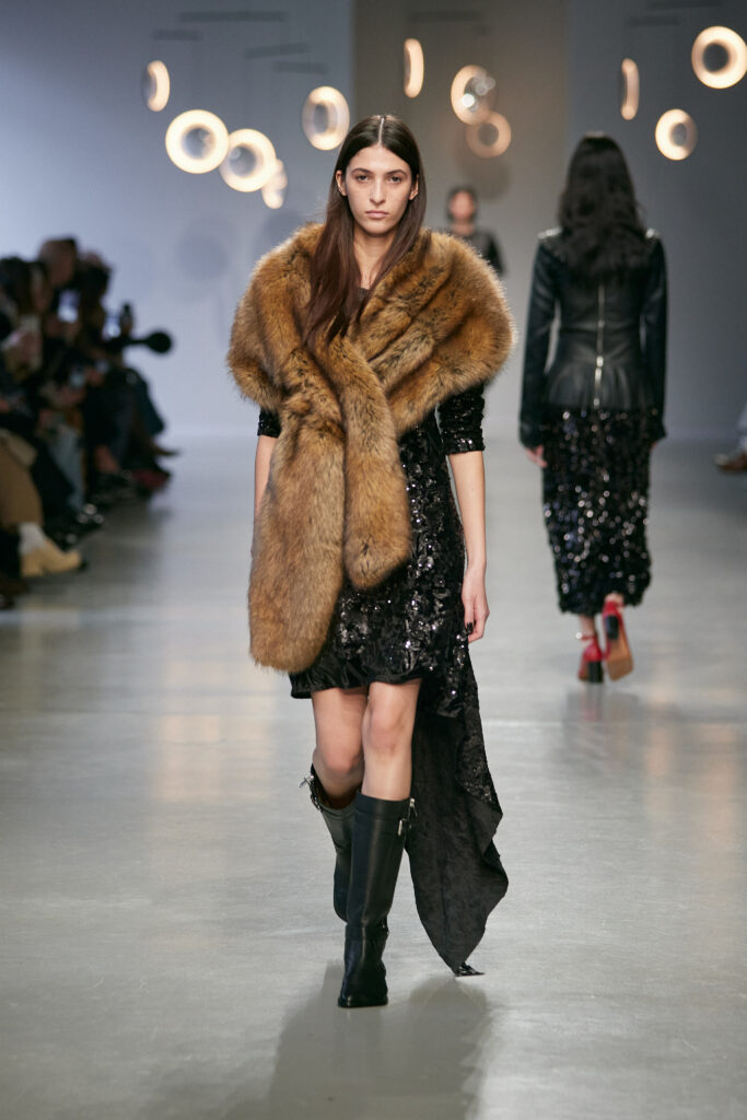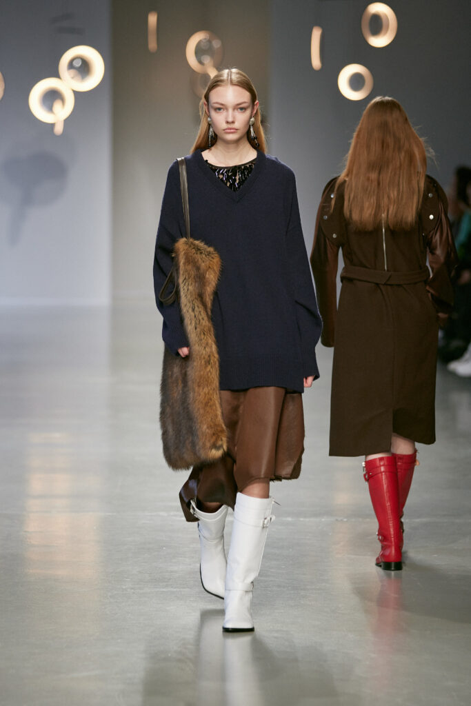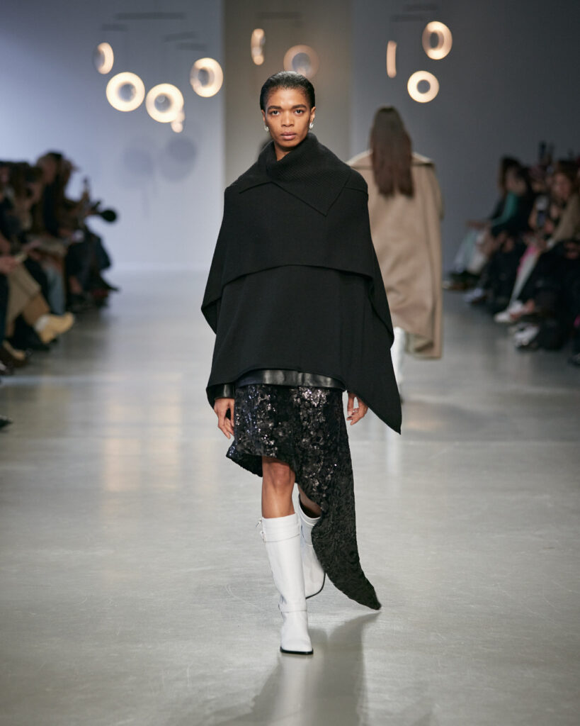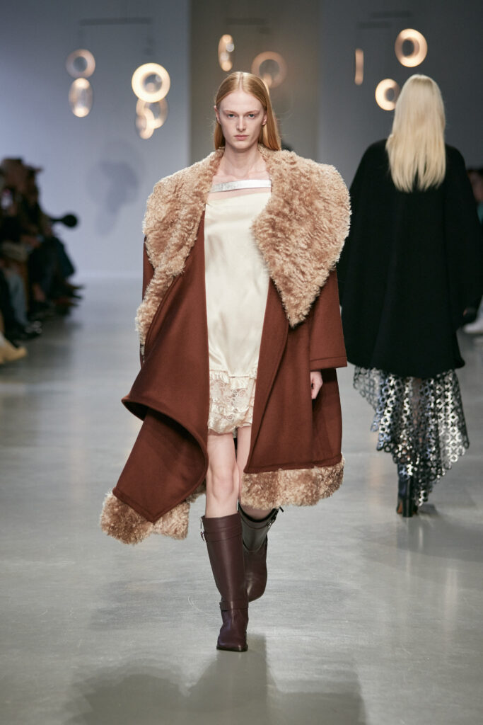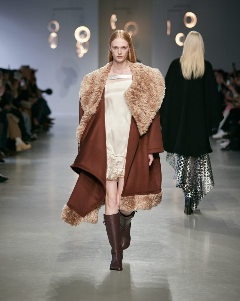 - Des boots d’équitation ancrent la silhouette, entre élégance aristocratique et instinct nomade.