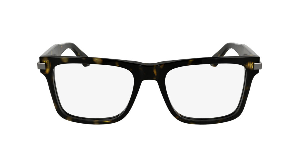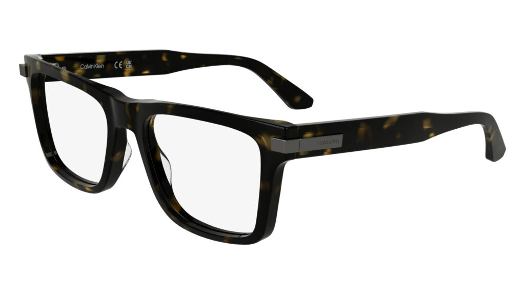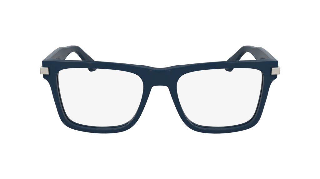 Dans l’univers optique, le CK25513 réinvente l’élégance du cat-eye avec une touche ultra-moderne : une plaque métallique affleurant les extrémités extérieures, amplifiant son allure graphique. Quant au CK25514, son minimalisme rectangulaire joue sur des nuances de Blue et Khaki, confirmant la signature intemporelle de Calvin Klein.