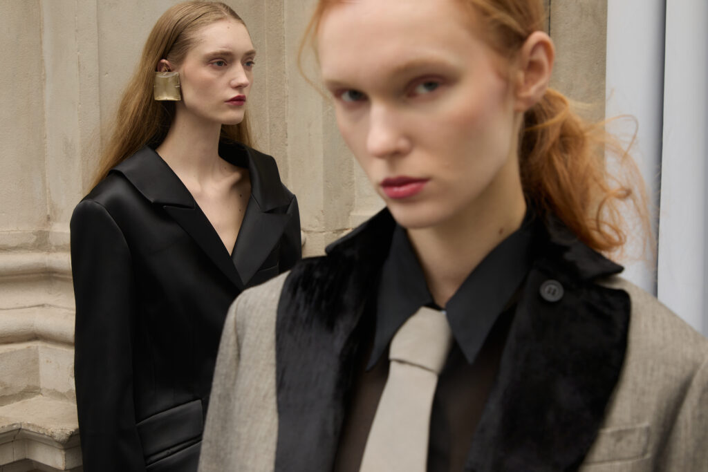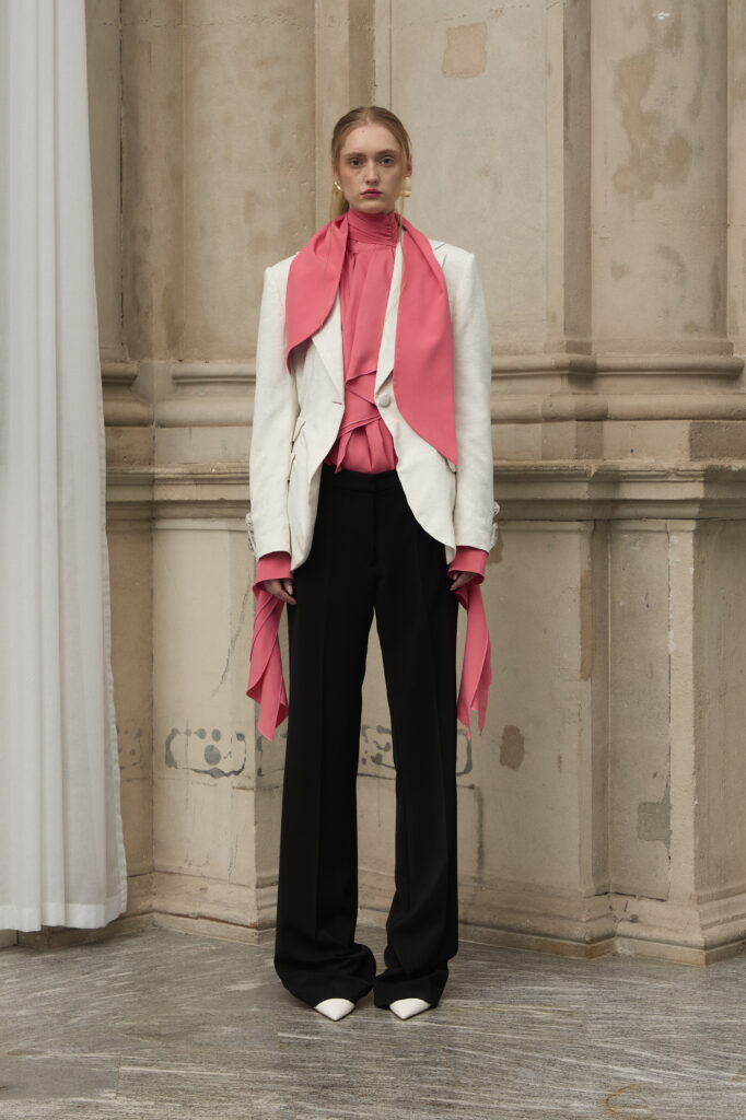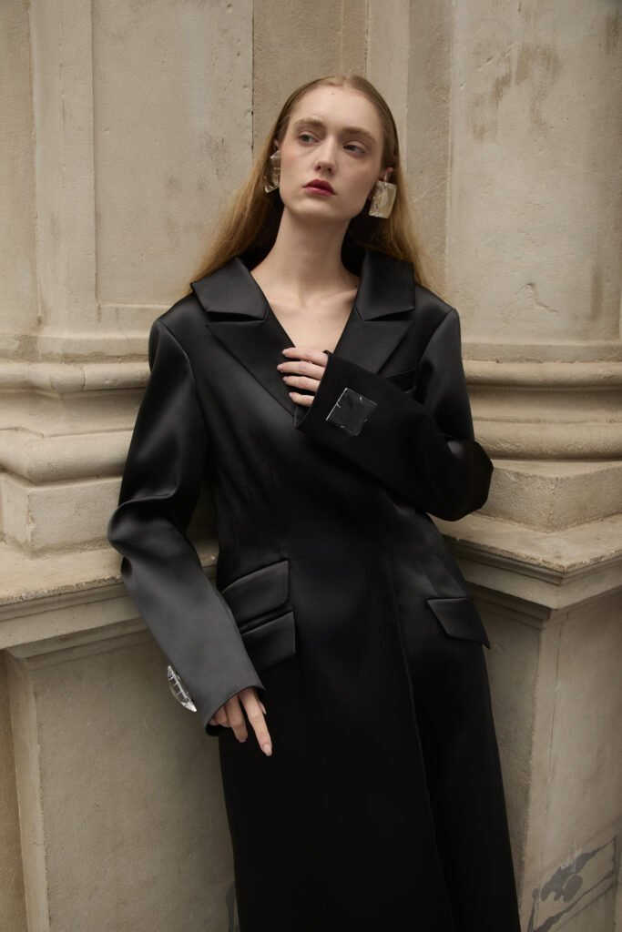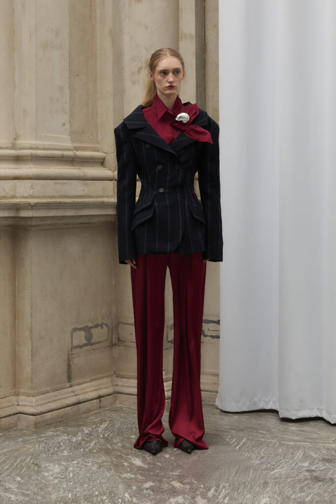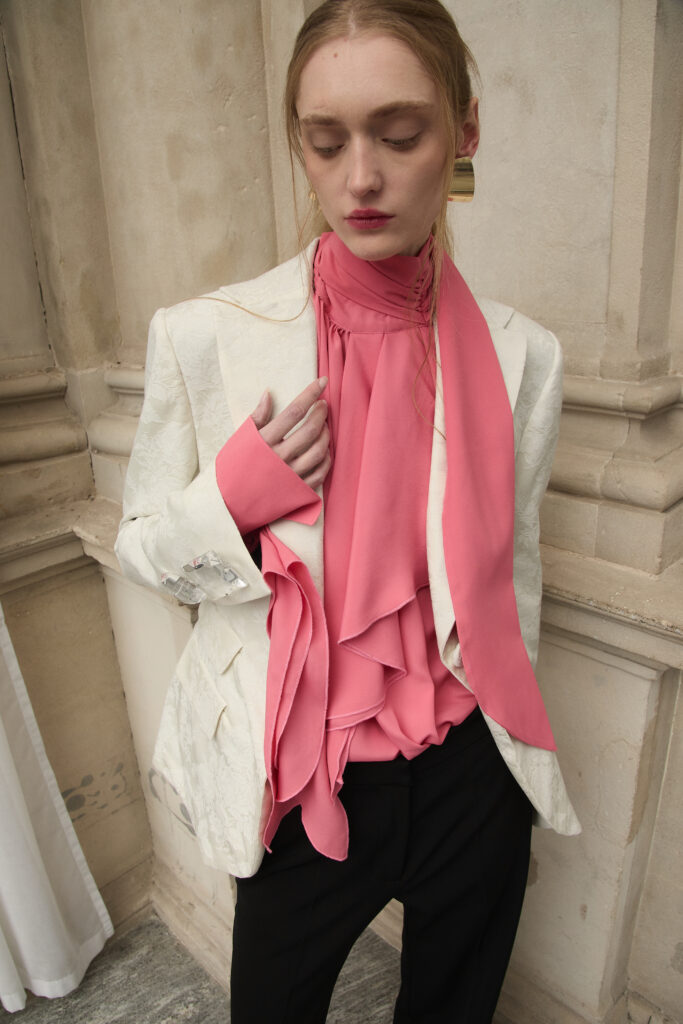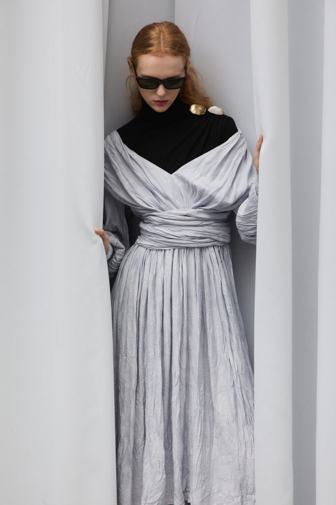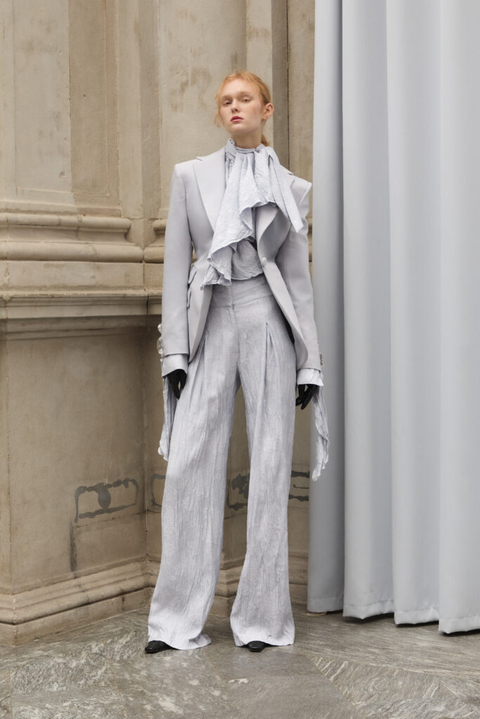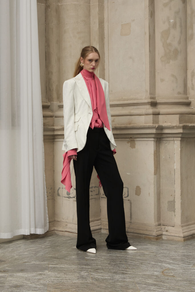 Inspirée par les héroïnes glaciales d’Alfred Hitchcock et l’élégance bohème de Paul Verlaine, la collection réinvente les frontières du tailoring classique, adoucissant la rigueur masculine avec des drapés sculpturaux et des textures mouvantes.
