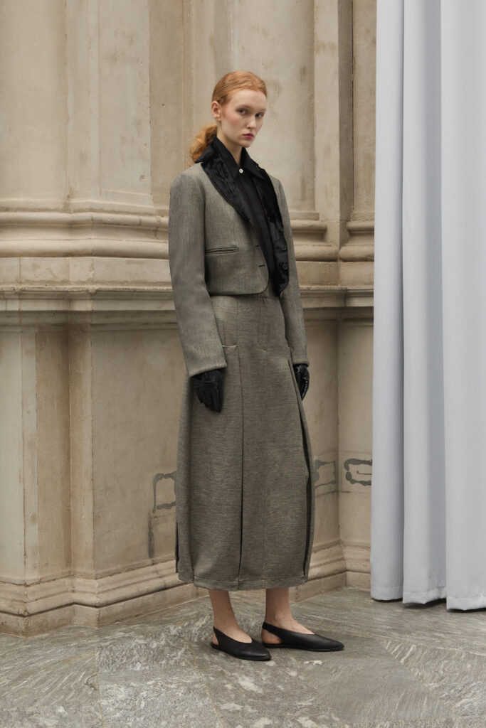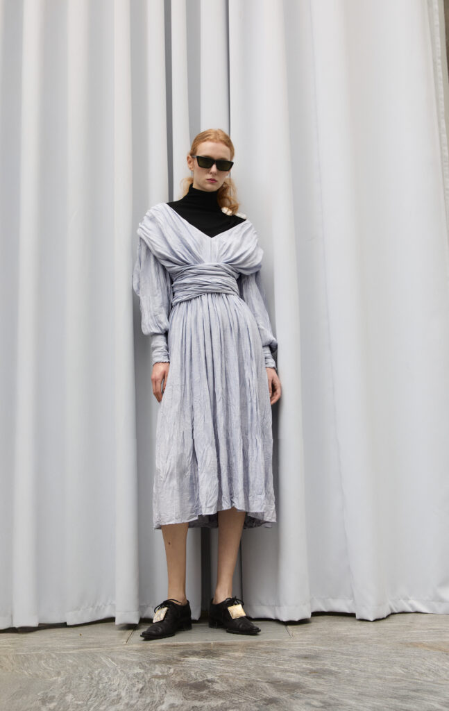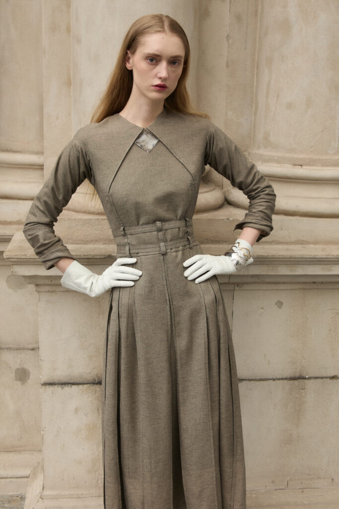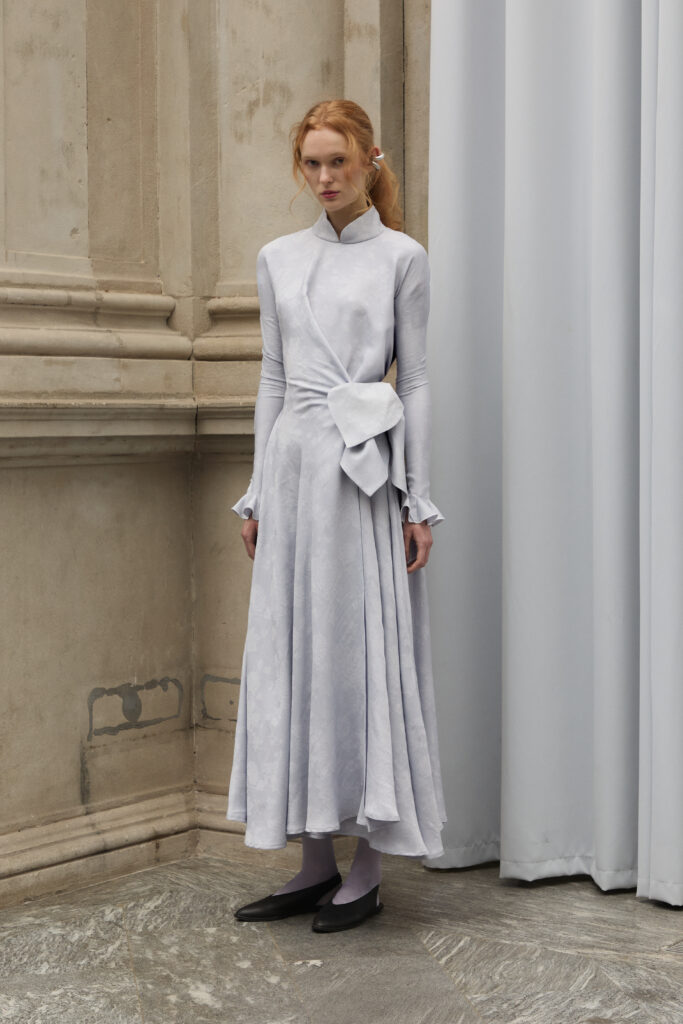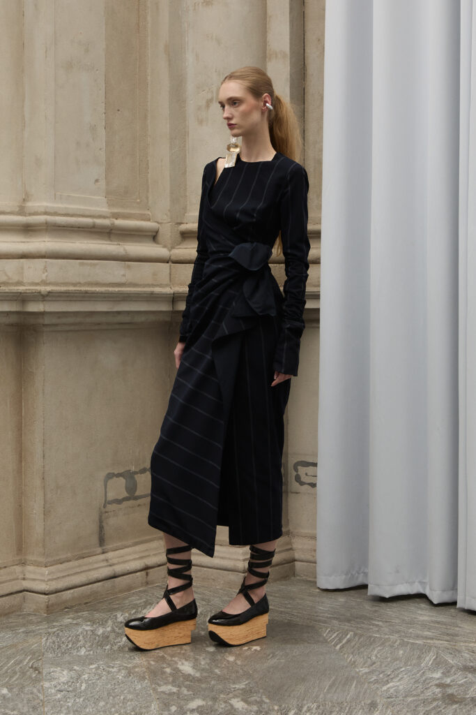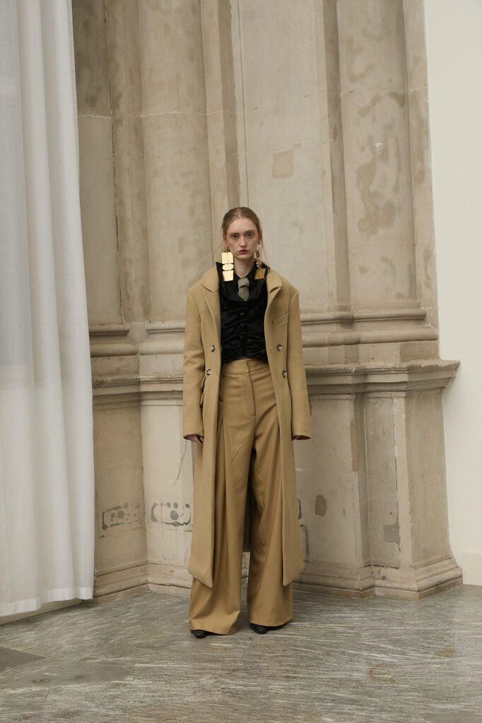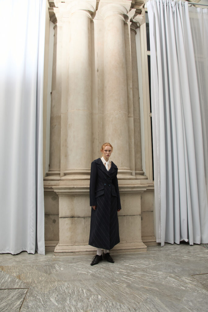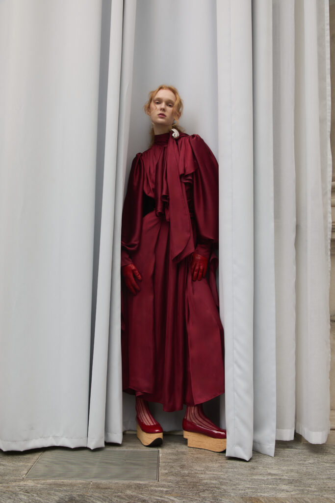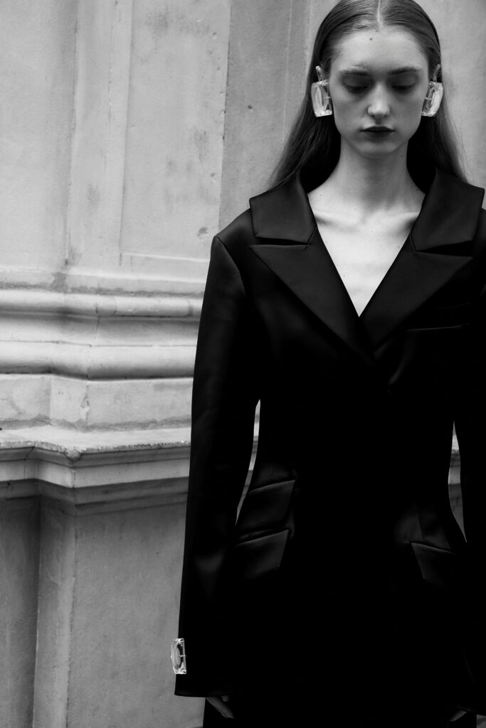 Inspirée par les héroïnes glaciales d’Alfred Hitchcock et l’élégance bohème de Paul Verlaine, la collection réinvente les frontières du tailoring classique, adoucissant la rigueur masculine avec des drapés sculpturaux et des textures mouvantes.