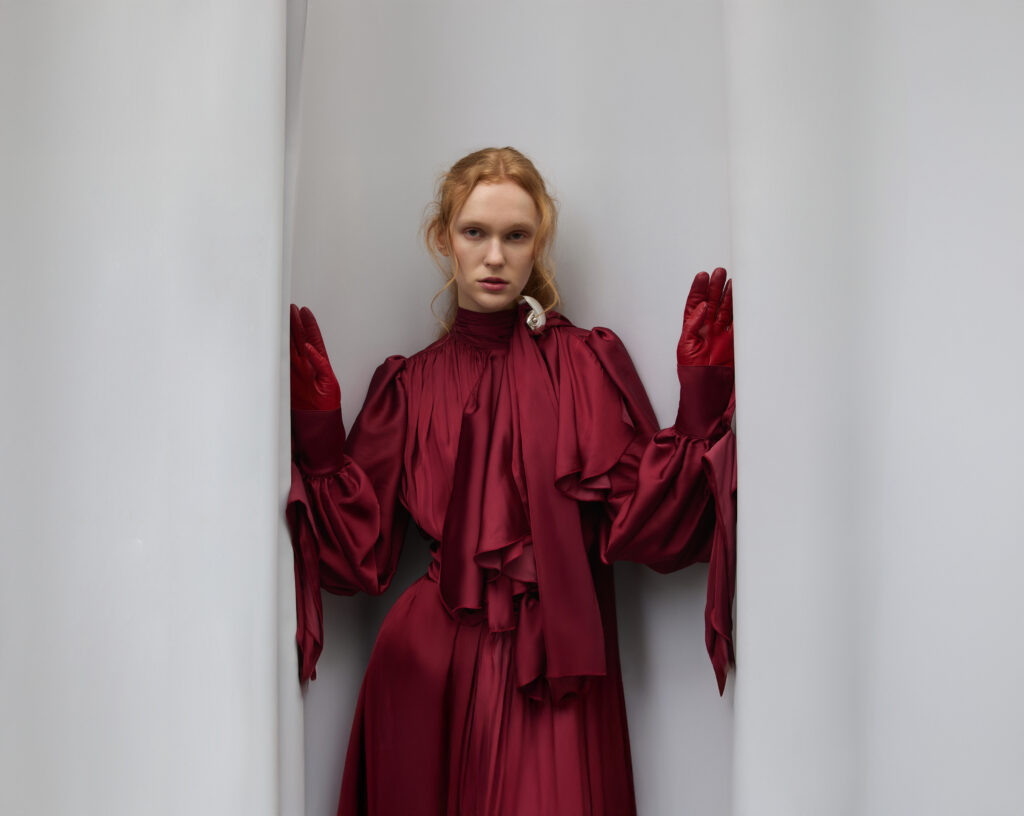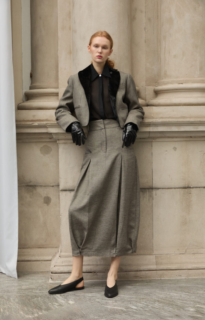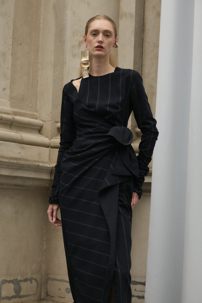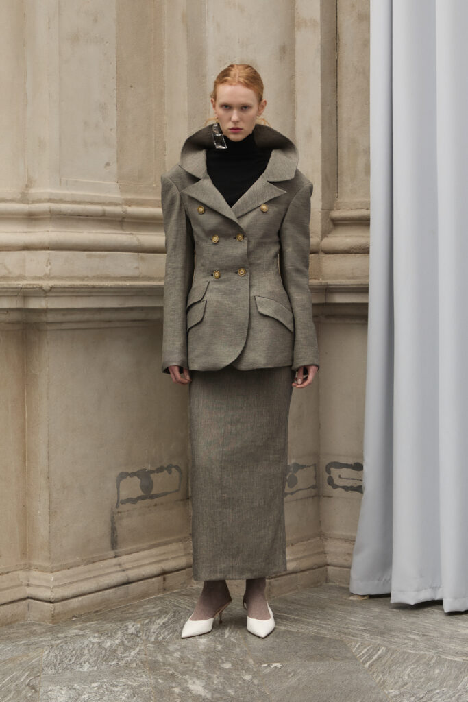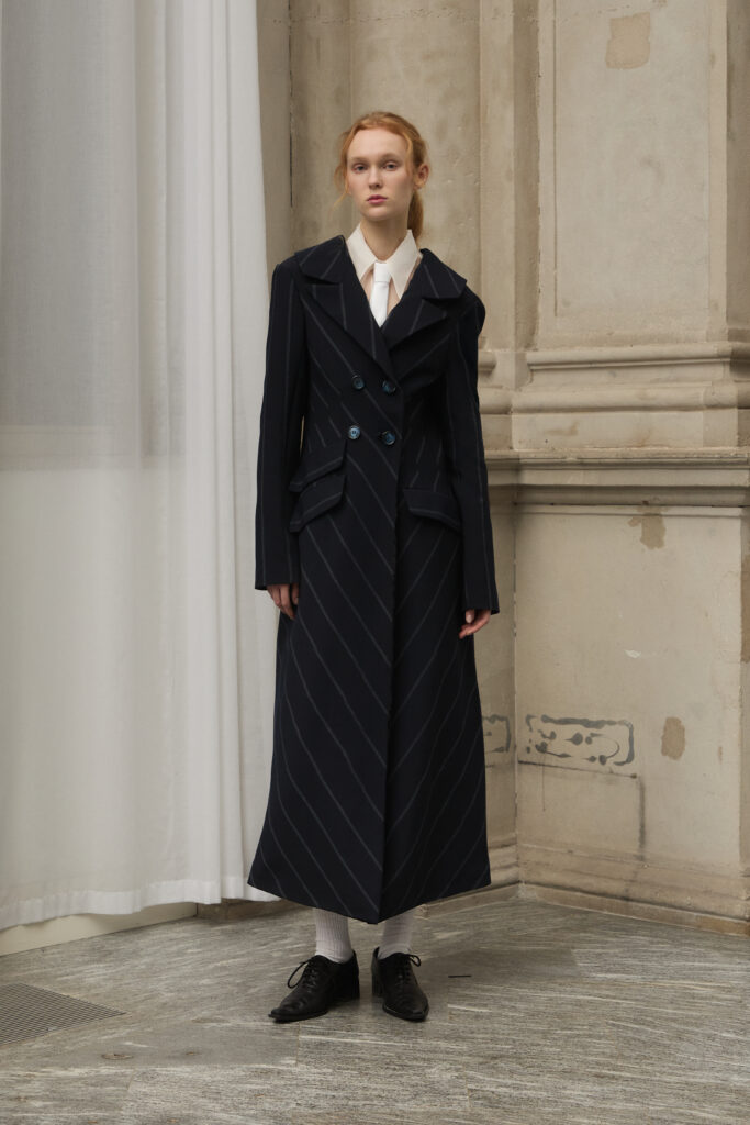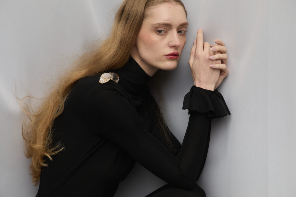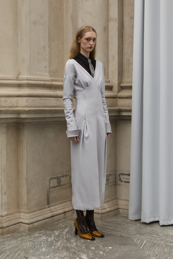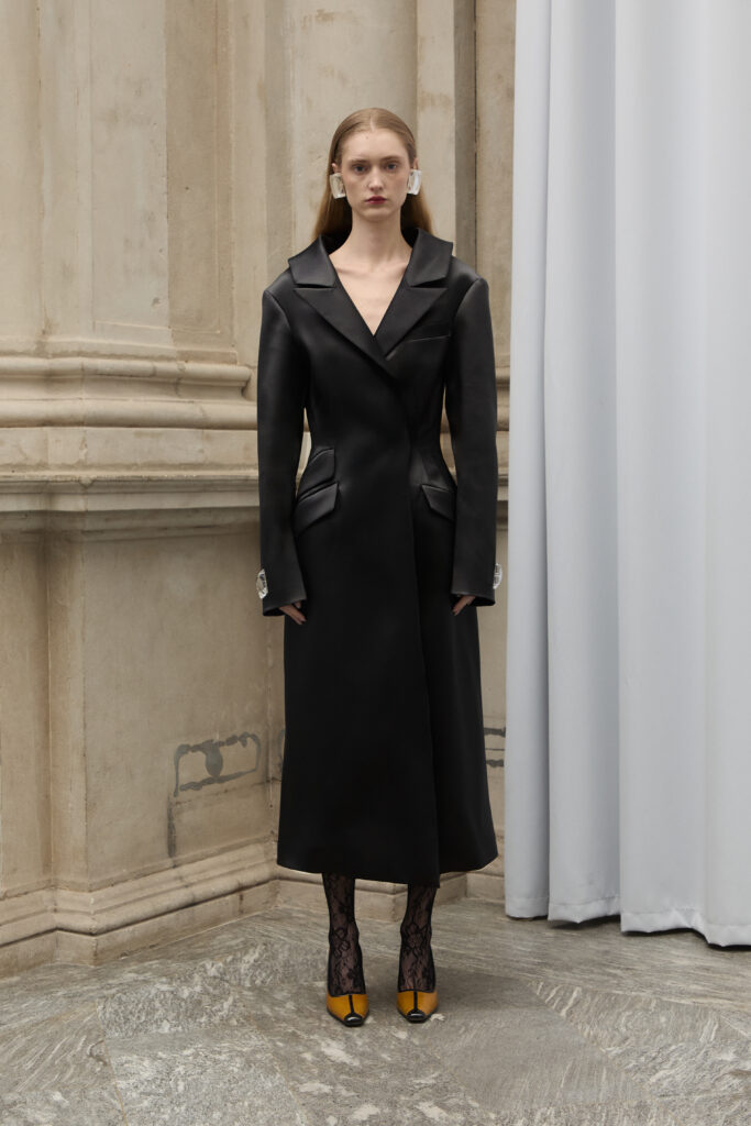 Inspirée par les héroïnes glaciales d’Alfred Hitchcock et l’élégance bohème de Paul Verlaine, la collection réinvente les frontières du tailoring classique, adoucissant la rigueur masculine avec des drapés sculpturaux et des textures mouvantes.