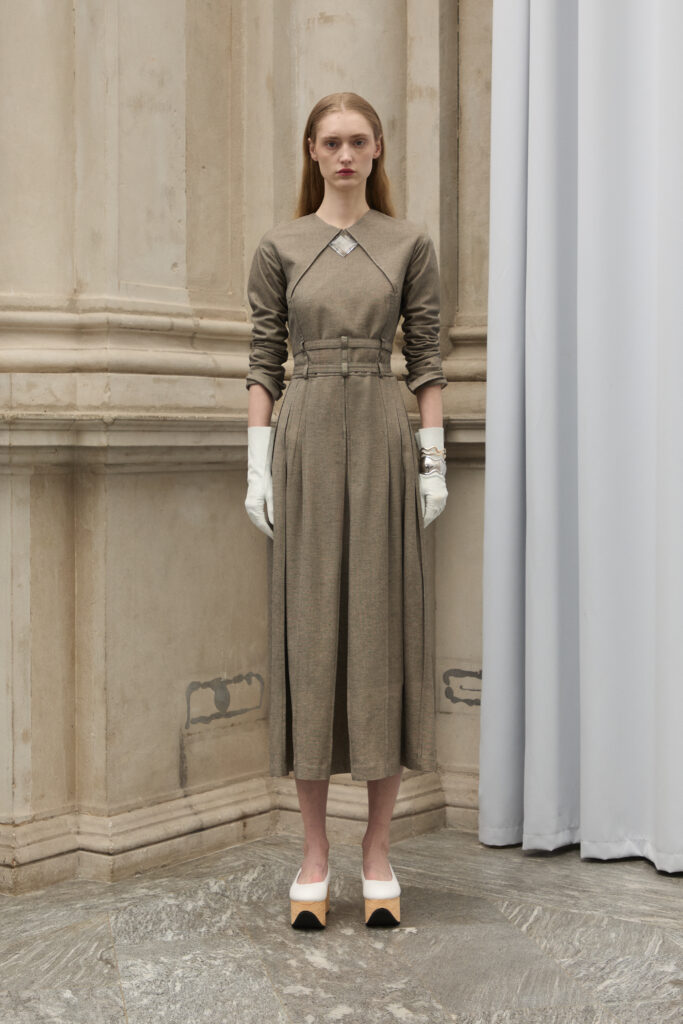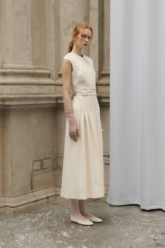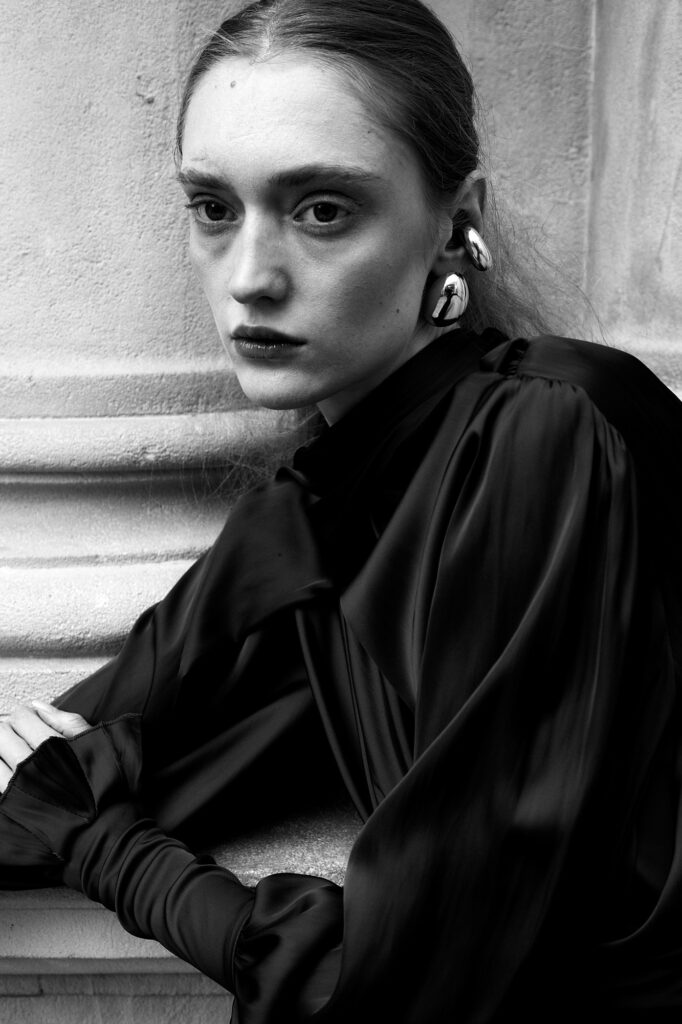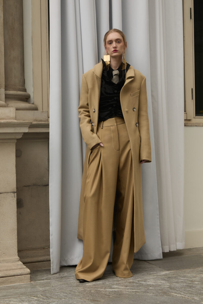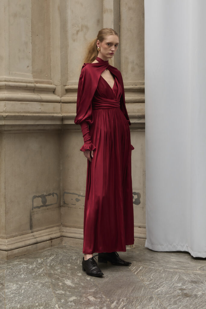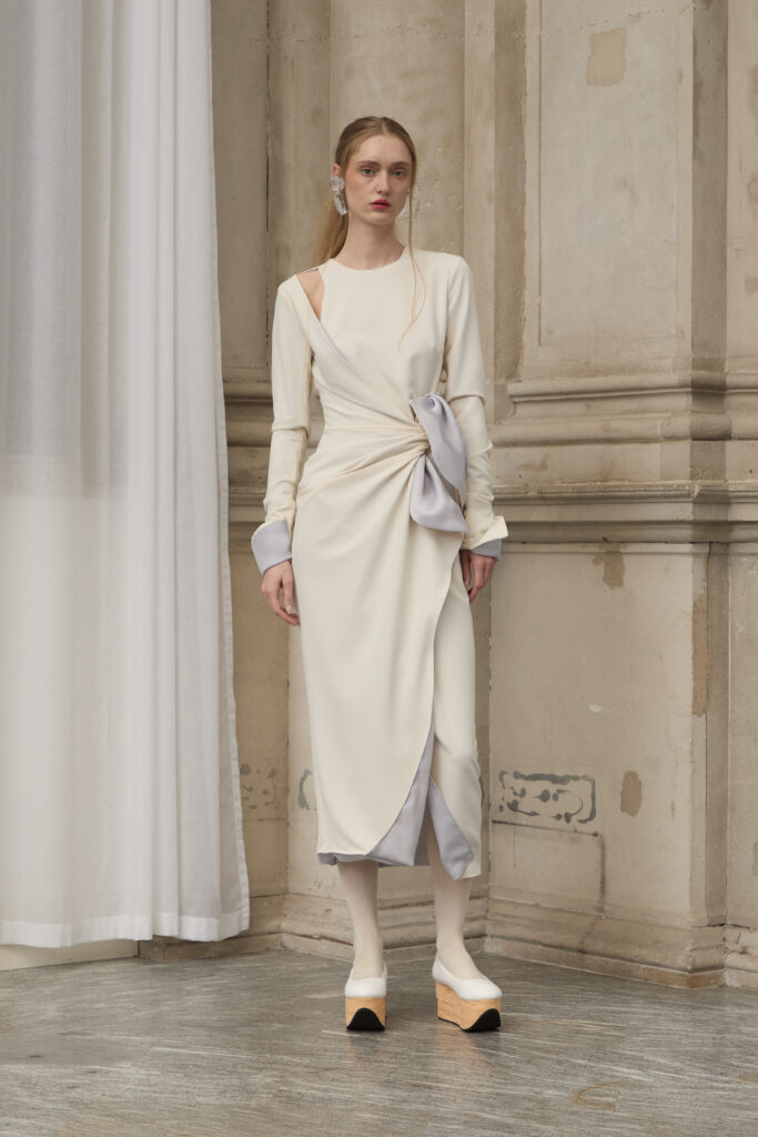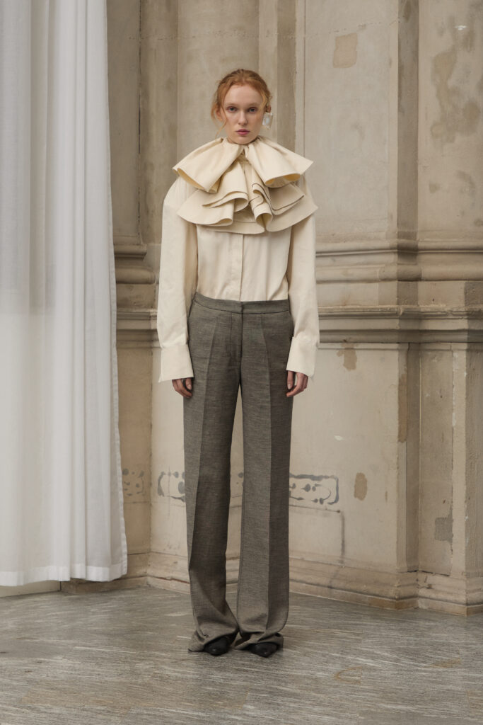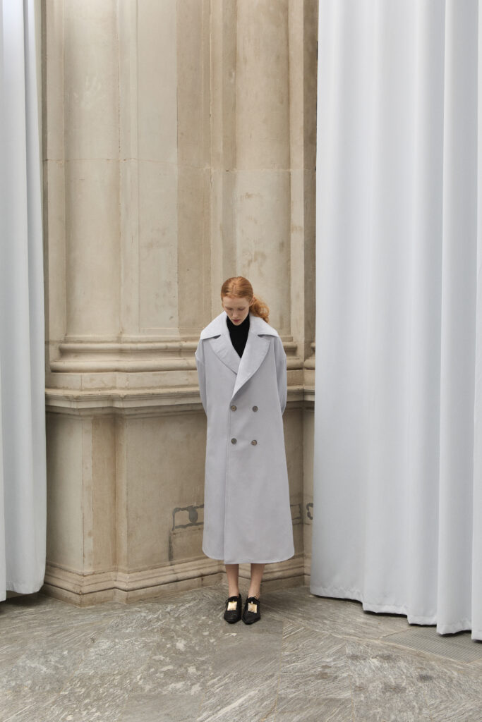 Inspirée par les héroïnes glaciales d’Alfred Hitchcock et l’élégance bohème de Paul Verlaine, la collection réinvente les frontières du tailoring classique, adoucissant la rigueur masculine avec des drapés sculpturaux et des textures mouvantes.