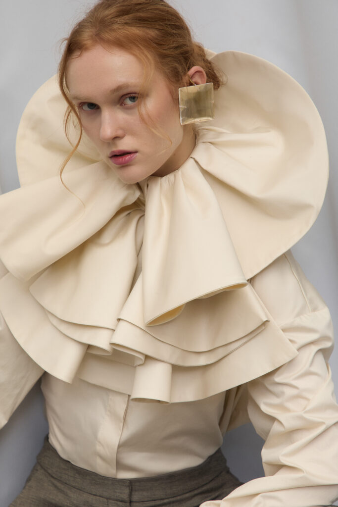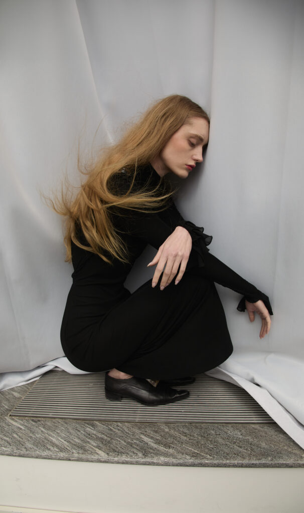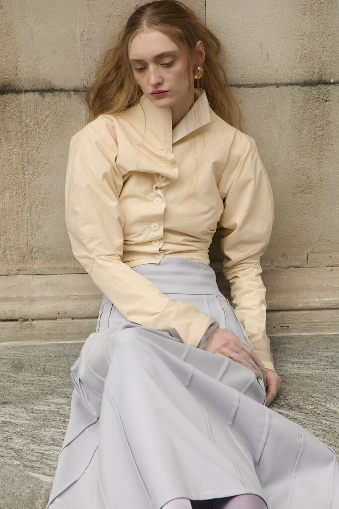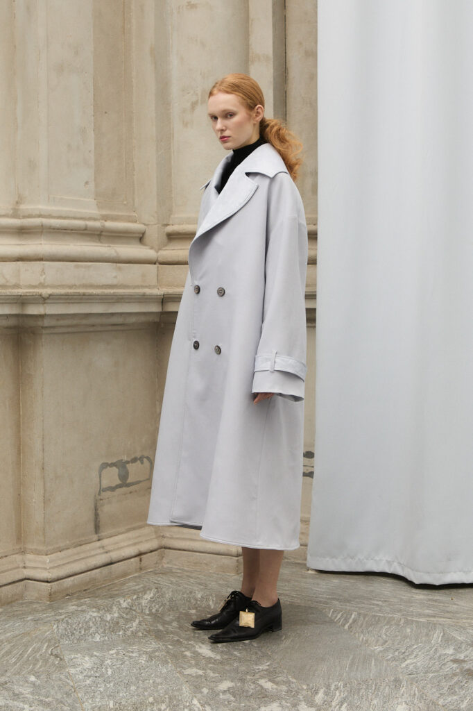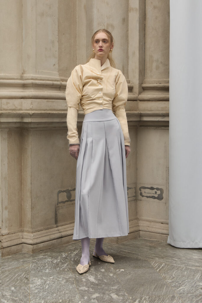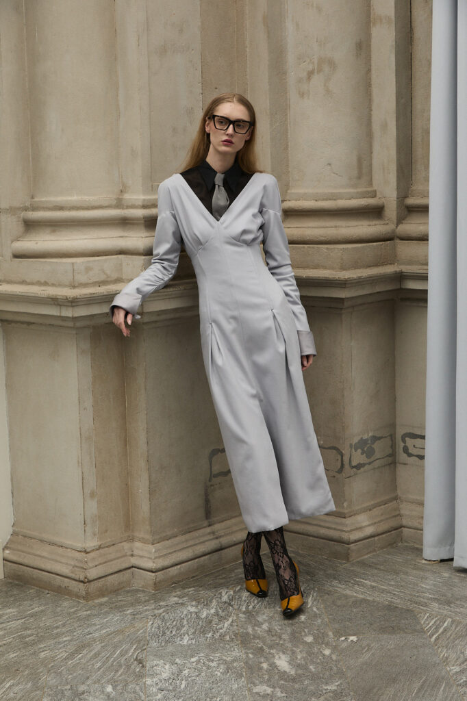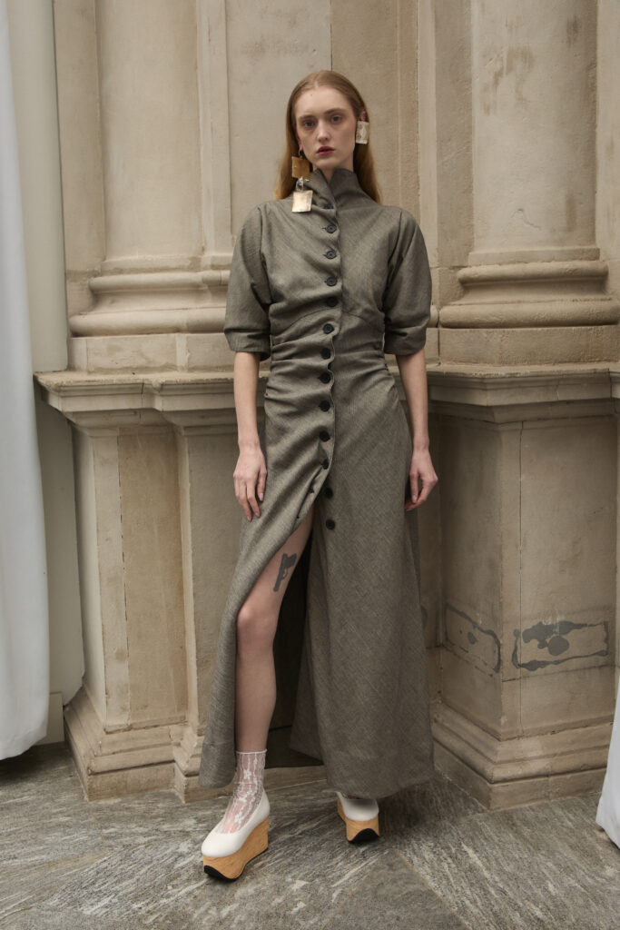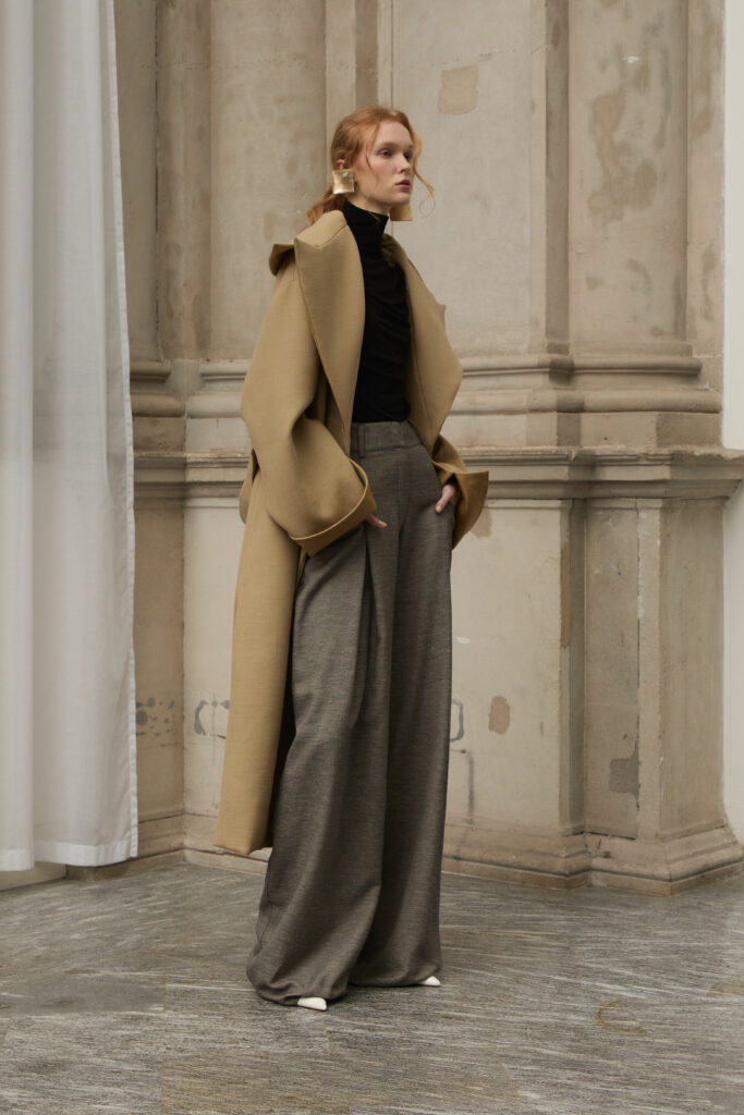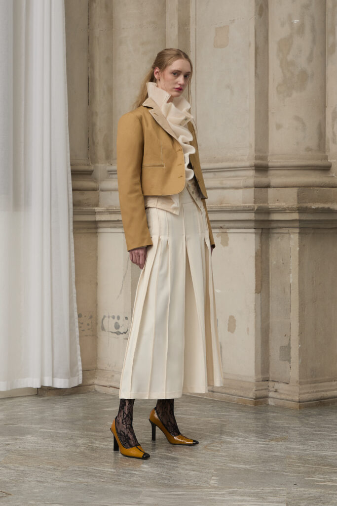 Inspirée par les héroïnes glaciales d’Alfred Hitchcock et l’élégance bohème de Paul Verlaine, la collection réinvente les frontières du tailoring classique, adoucissant la rigueur masculine avec des drapés sculpturaux et des textures mouvantes.