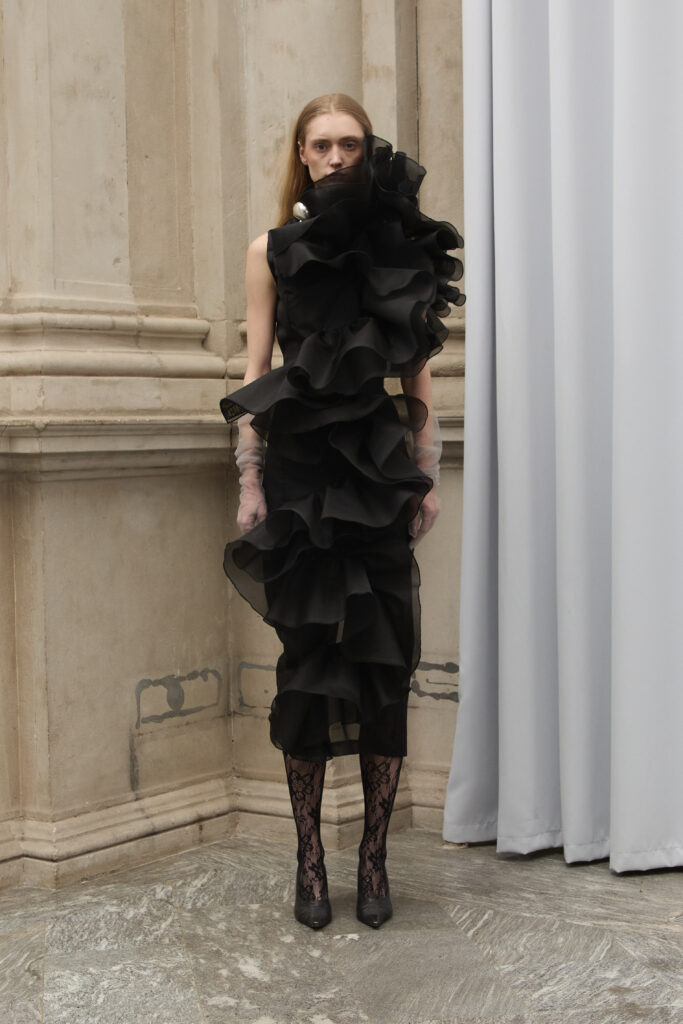 - La robe Nocturna, énigmatique et sophistiquée, en tundra noire, un organza de soie vaporeux, où des spirales de ruchés flottent autour du corps, comme un écho aux sous-jupes couture des années 50.