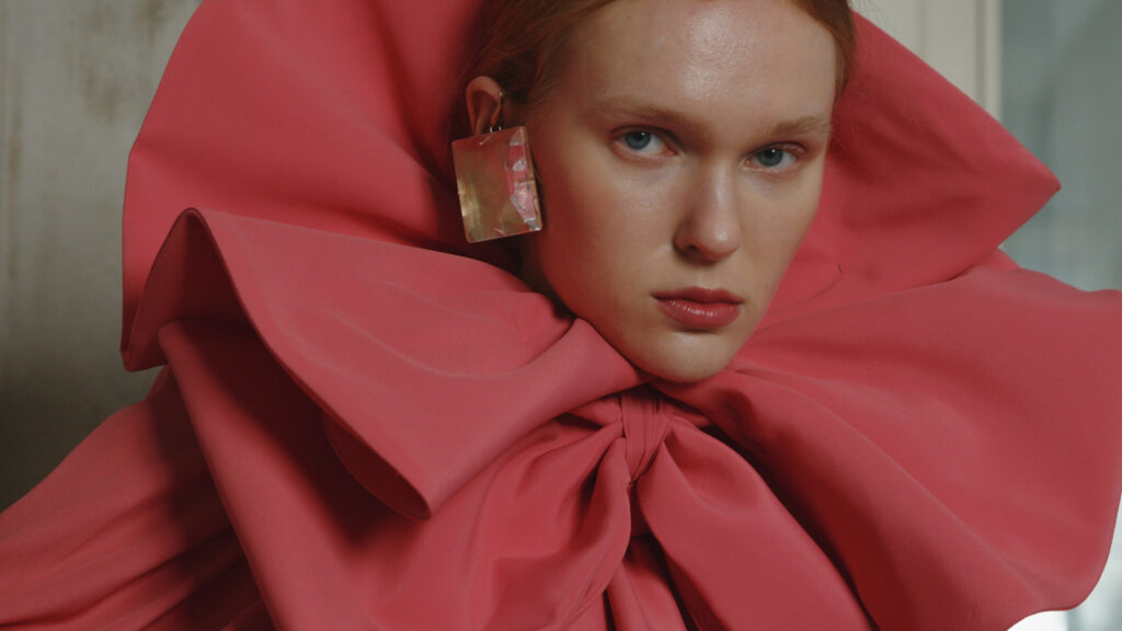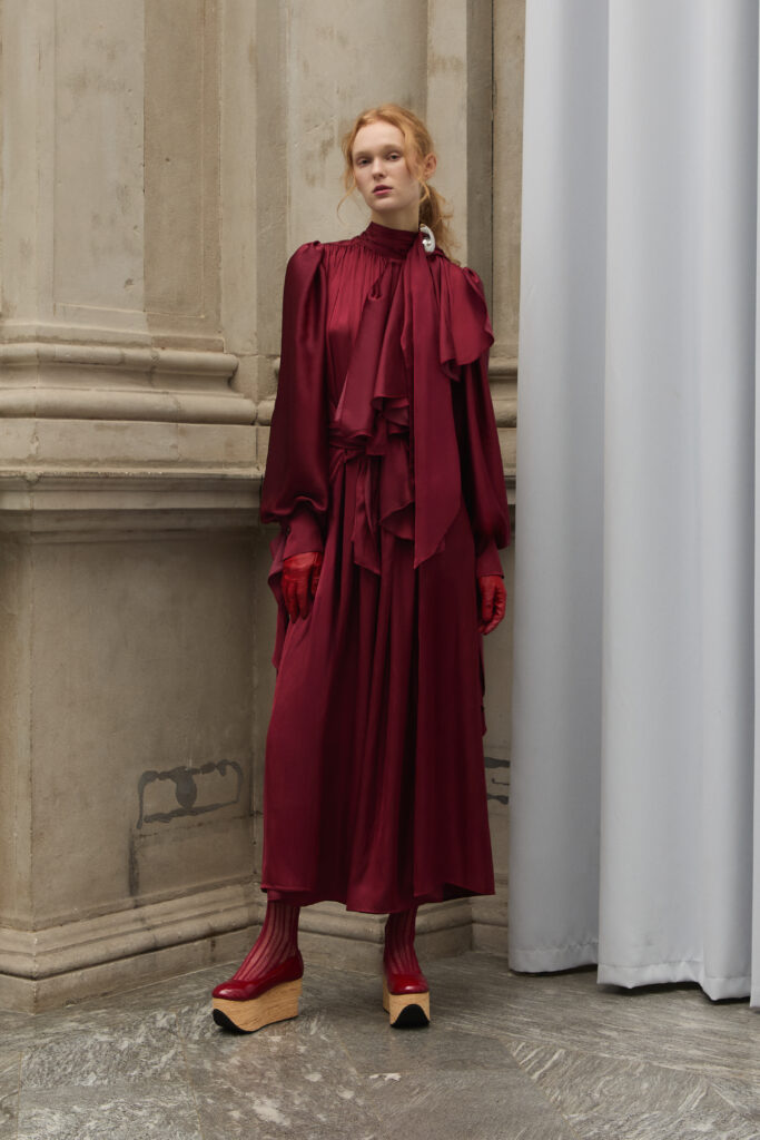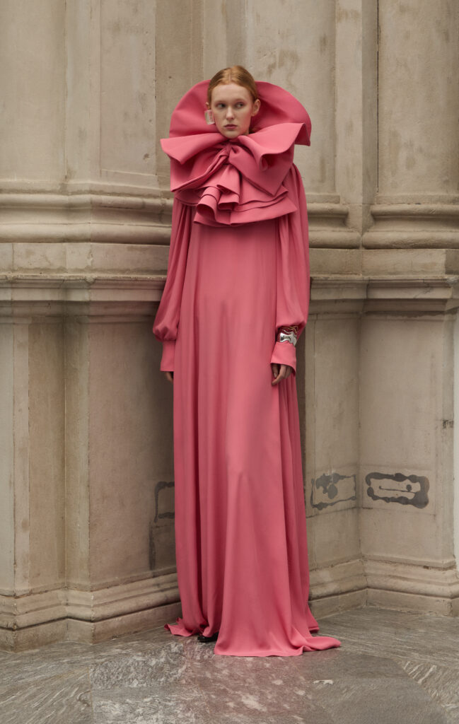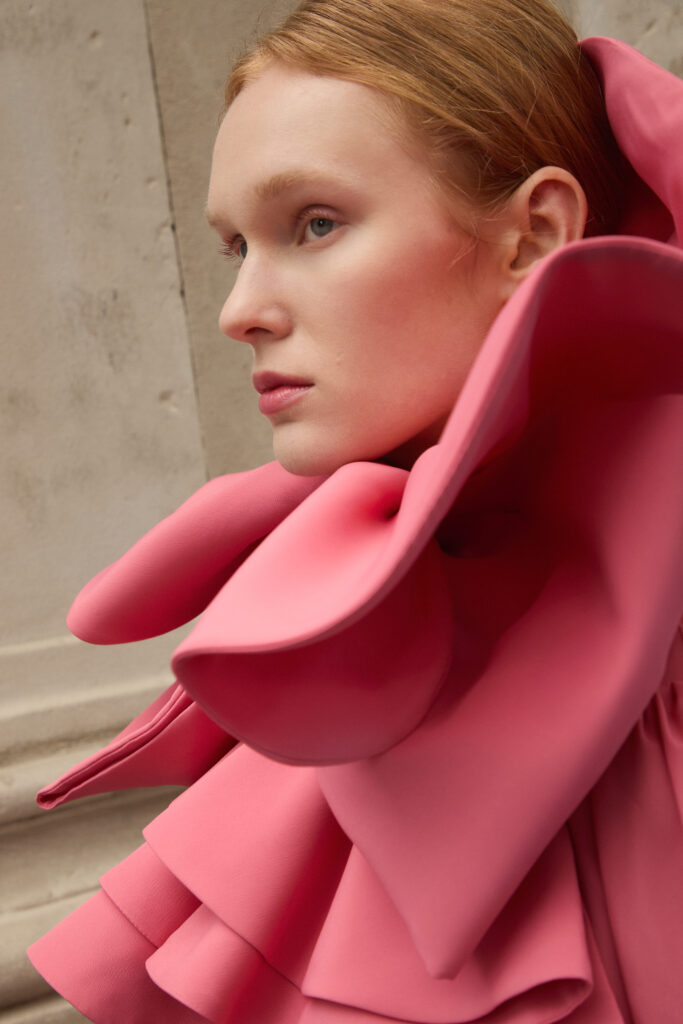 - La robe Cannibal Rose, en soie rose géranium, caresse le corps avec une légèreté impalpable, son col en pétales doppié de crinoline évoquant une « Fleur du Mal » cinématographique.
