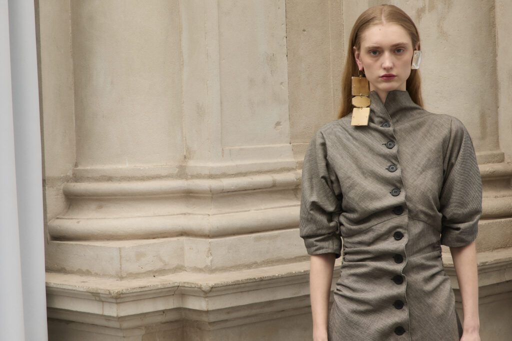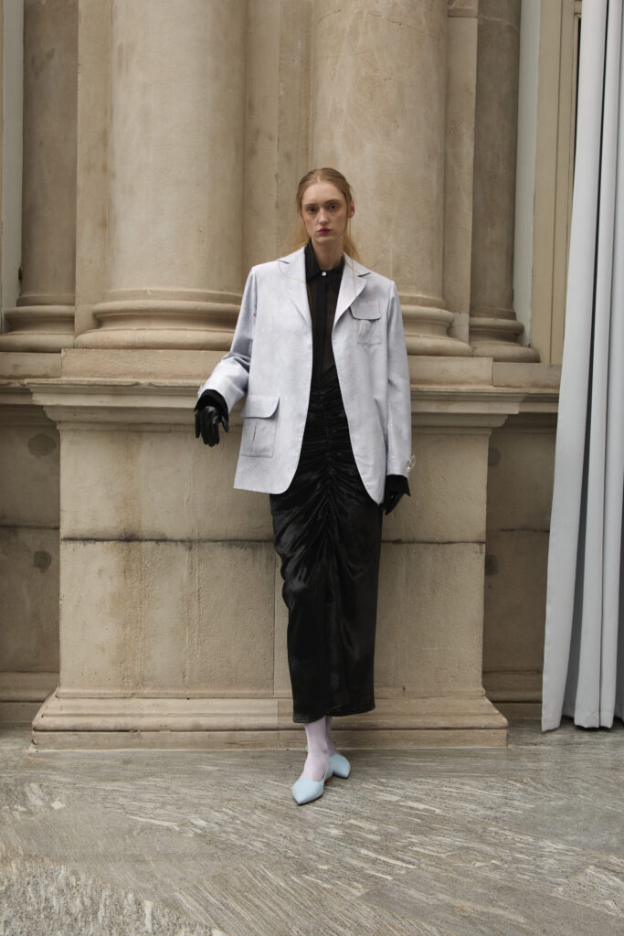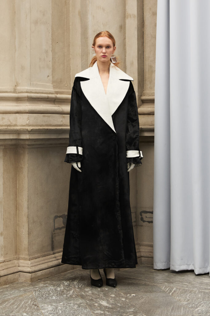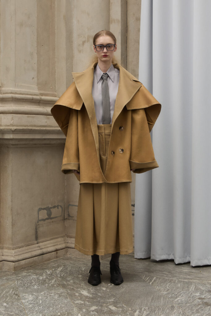 Une silhouette suspendue entre structure et légèreté, entre ombre et lumière. Pour l’automne-hiver 2025/26, Romeo Gigli signe un vestiaire en constante métamorphose, où chaque pièce naît d’une tension entre précision sartoriale et liberté fluide.