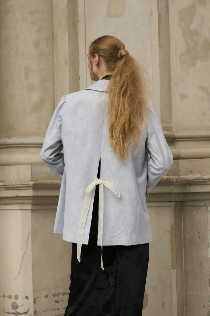 - Le blazer Sakura, en gessato bleu nuit, réinvente le tailoring avec un corset-bustier interne sculptant la silhouette.