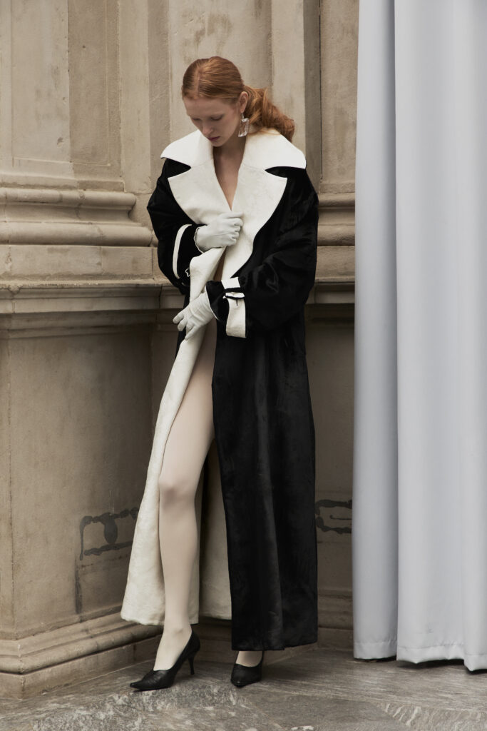 - Le trench Londonderry, réversible, alterne le lustre du jacquard de soie ivoire et la profondeur tactile du velours effet fourrure.
