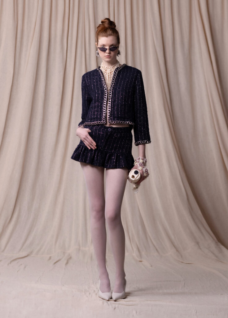 - Varsity jacket en tweed, fusionnant l’héritage du sportswear américain avec l’élégance européenne.