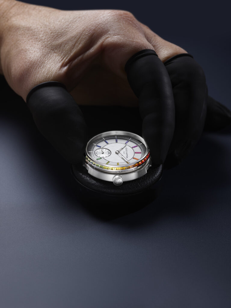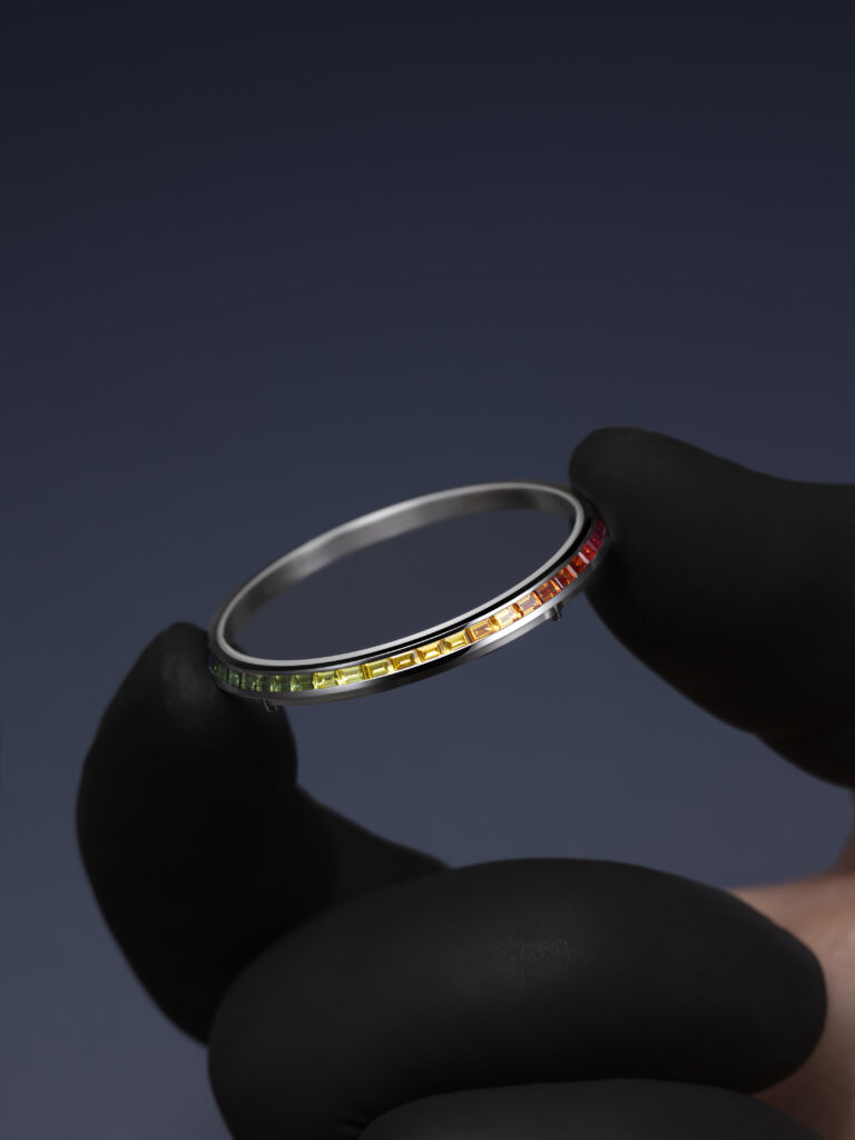 La lunette et les index sont pavés de 59 corindons (saphirs et rubis), méticuleusement sélectionnés pour composer un dégradé parfait de couleurs. Chaque pierre, provenant du Sri Lanka et du Mozambique, a été triée avec soin afin d’assurer une transition chromatique d’une fluidité inégalée. La rareté des saphirs verts et violets a imposé une quête minutieuse, mais le rendu final confère à cette montre un éclat envoûtant.