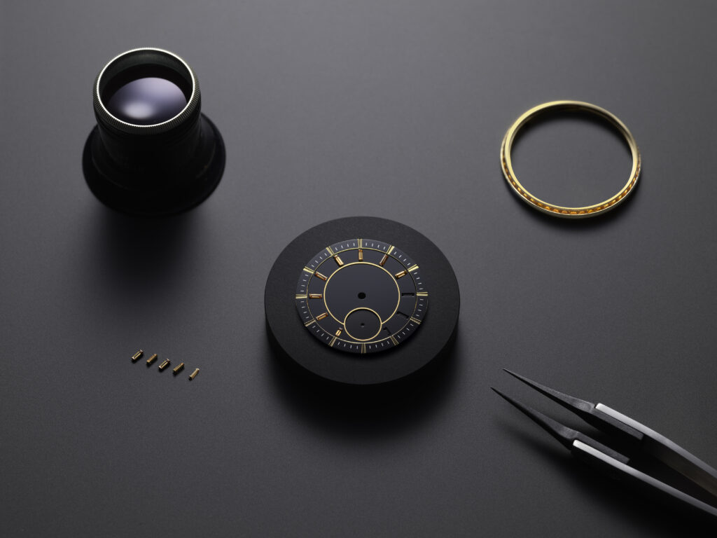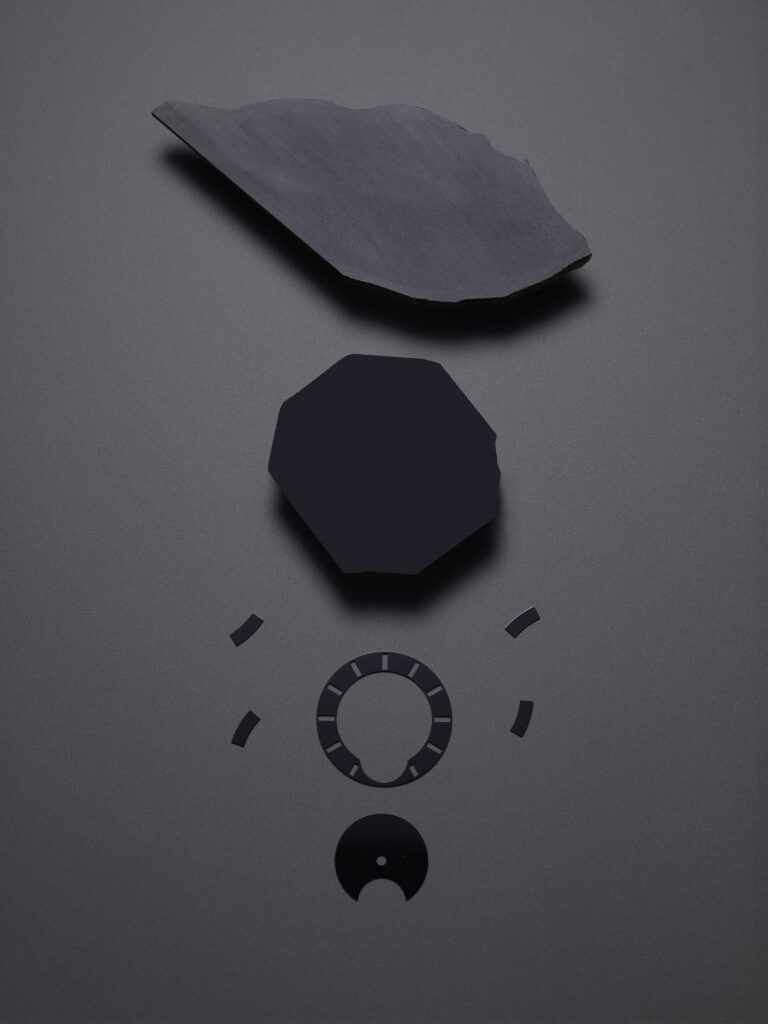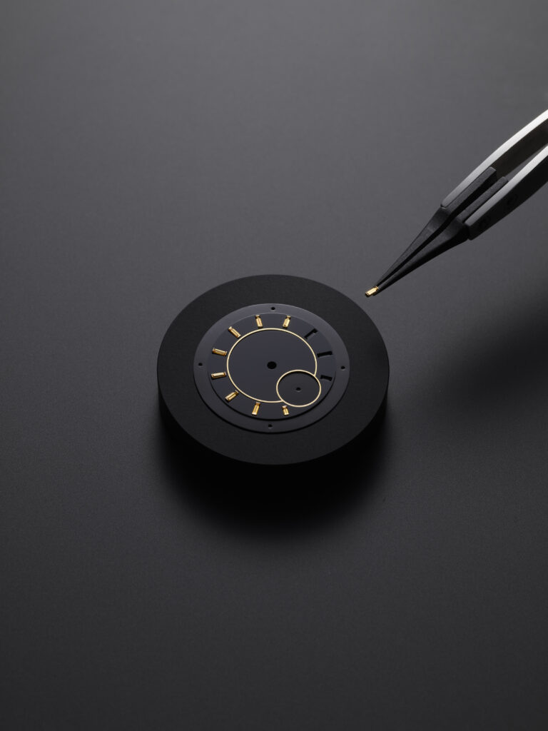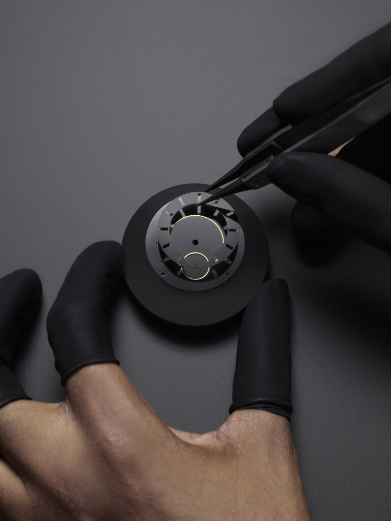 L’or jaune et l’onyx composent une alliance rare, où le mysticisme du noir profond s’oppose à la chaleur solaire du métal précieux. Le cadran, sculpté dans de l’onyx du Brésil, est une prouesse technique en soi. Sa fabrication exige un travail minutieux : après un perçage précis dans un bloc brut, les artisans découpent des couches d’une finesse extrême, adaptées aux composants du cadran. L’assemblage requiert une précision absolue, notamment pour l’incrustation des onze saphirs safran taillés en baguette.