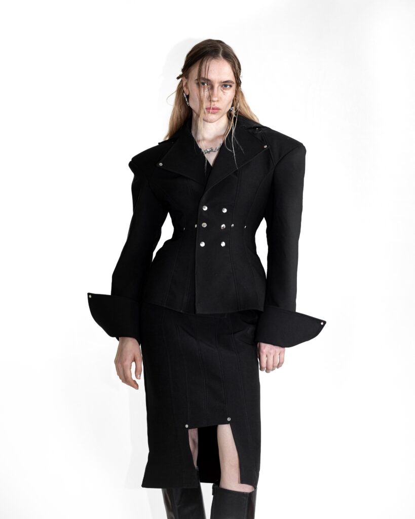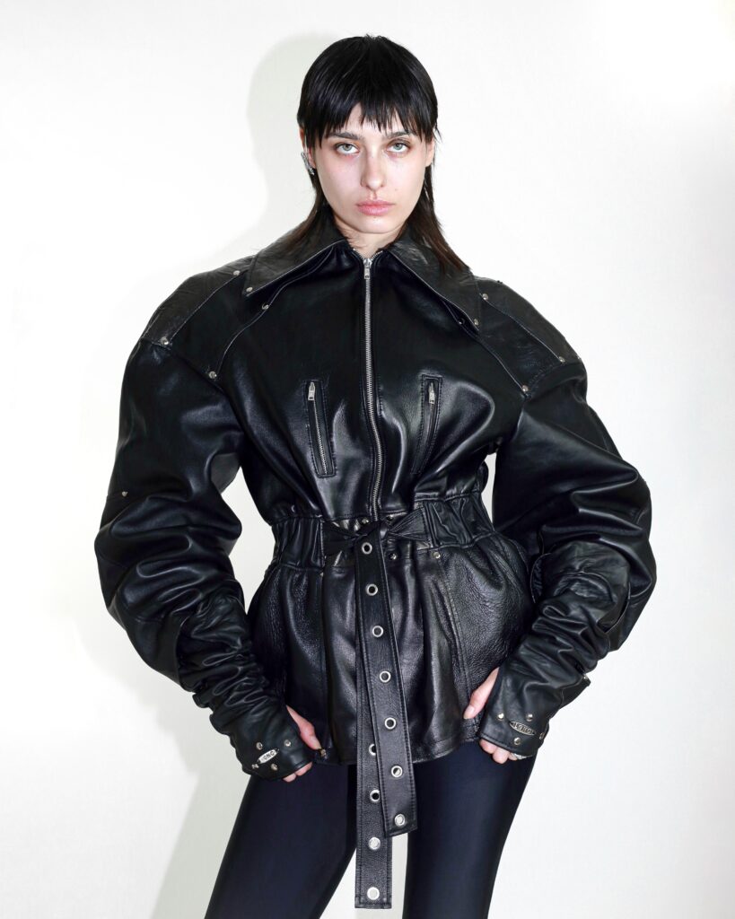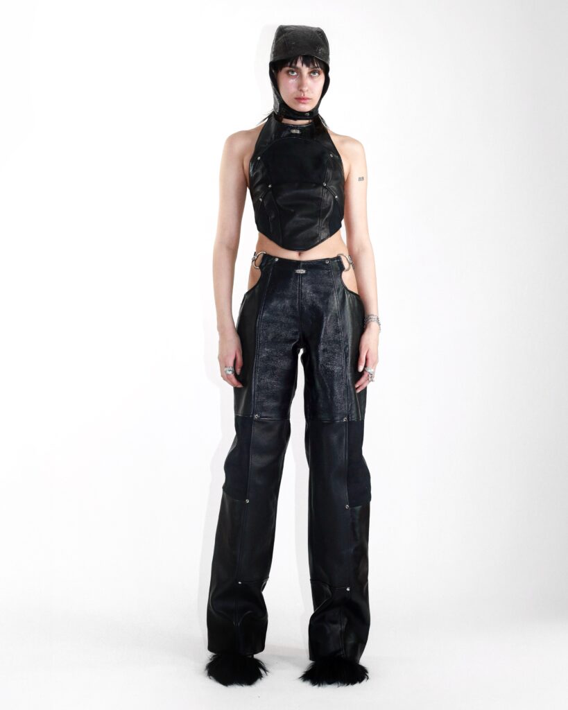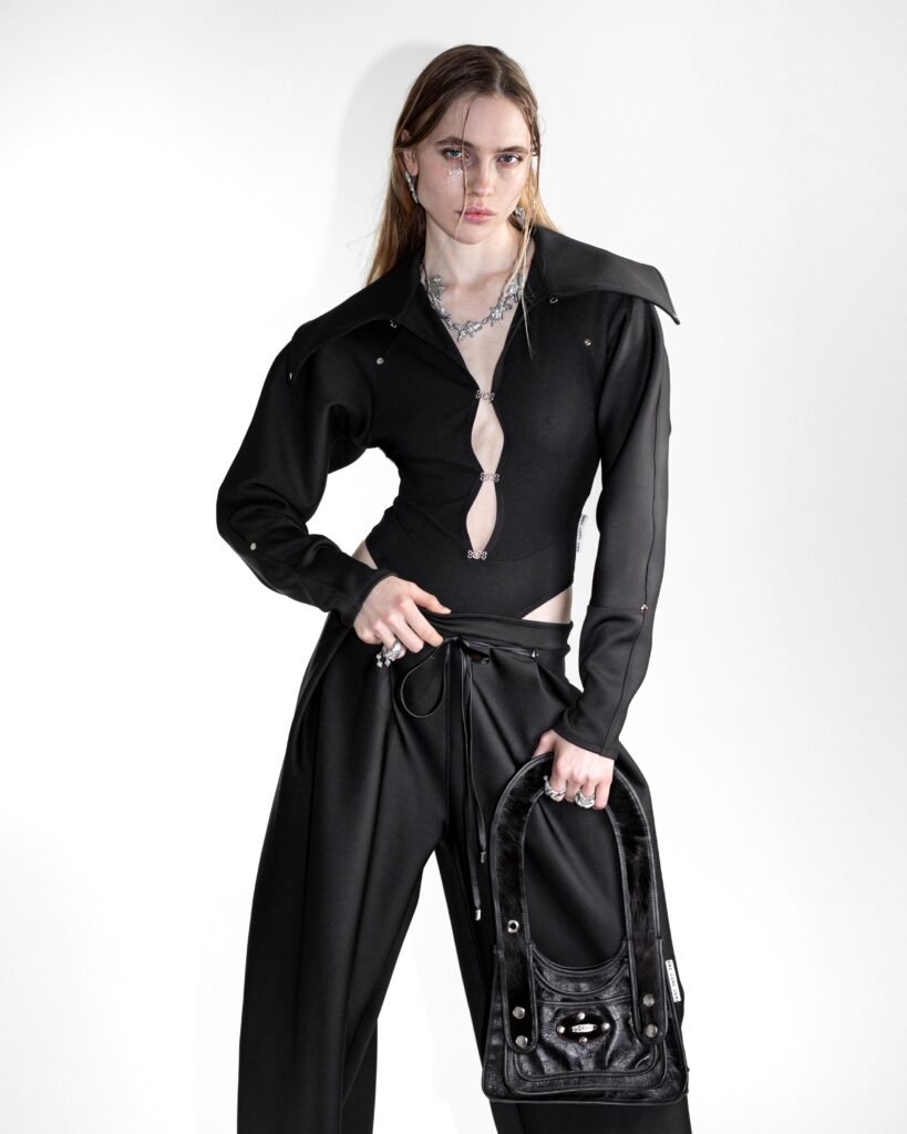 Dans ce vestiaire de combat, les manteaux longs et capes structurées s’imposent comme des pièces maîtresses, tout comme les pantalons à ceinture haute et boucles métalliques, qui soulignent la silhouette tout en affirmant une présence forte.