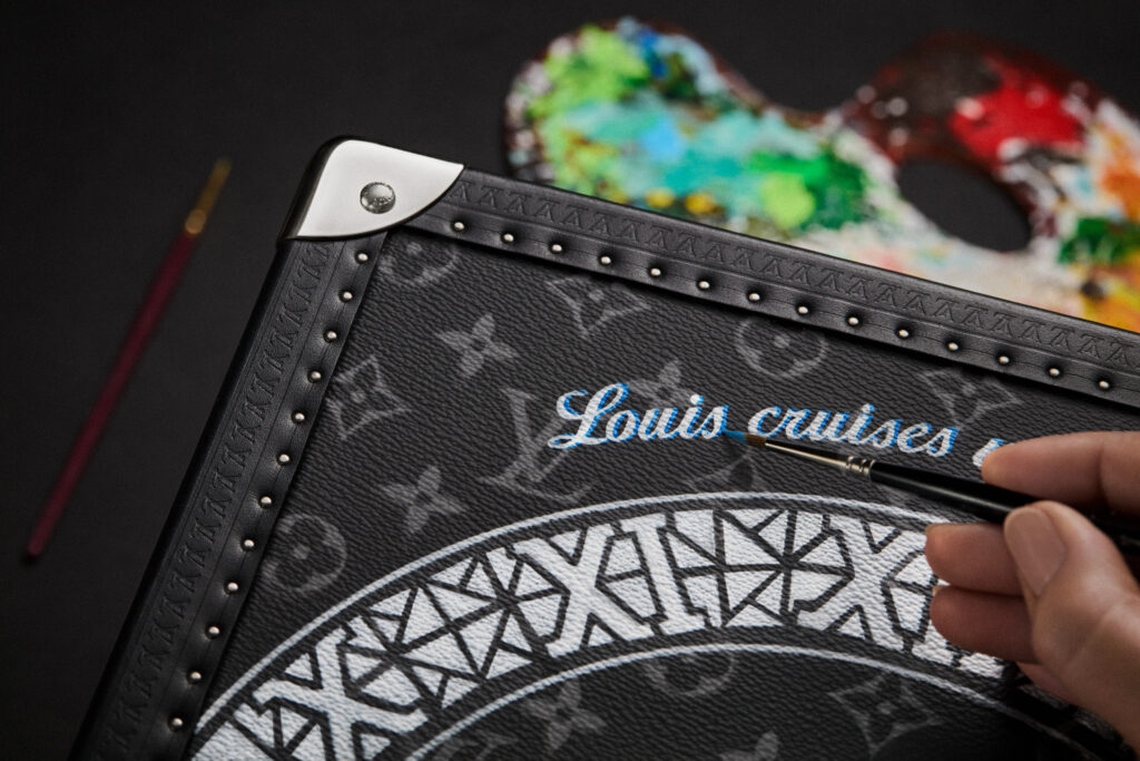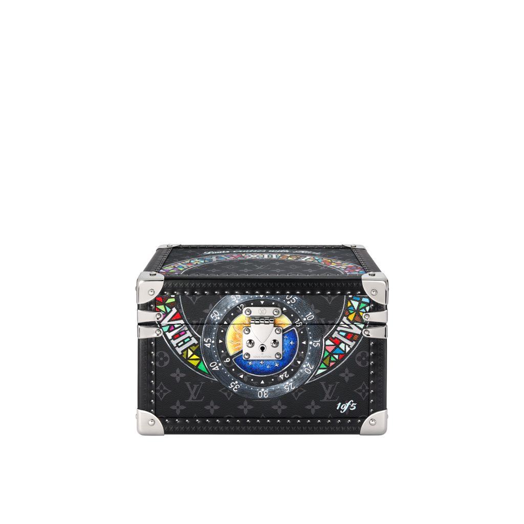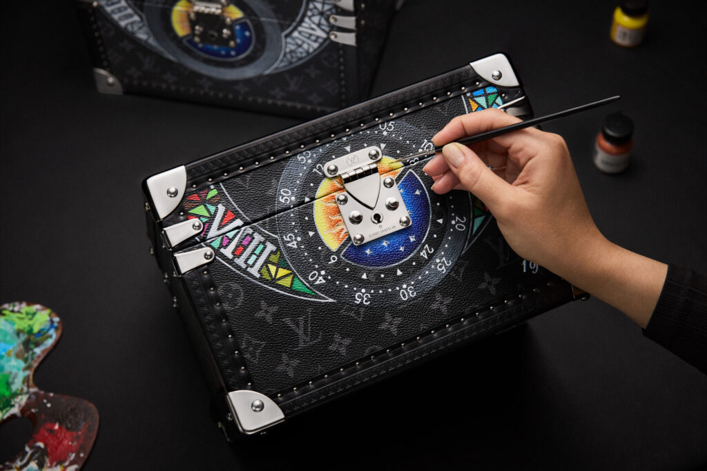 – Écrin : malle Louis Vuitton en toile Monogram Eclipse peinte à la main