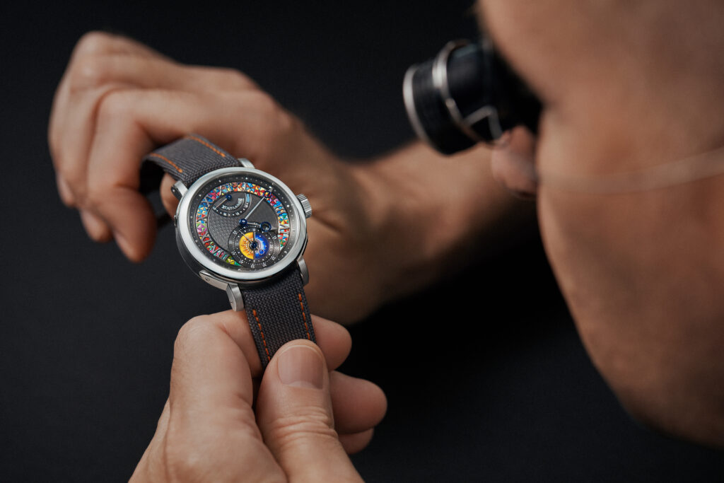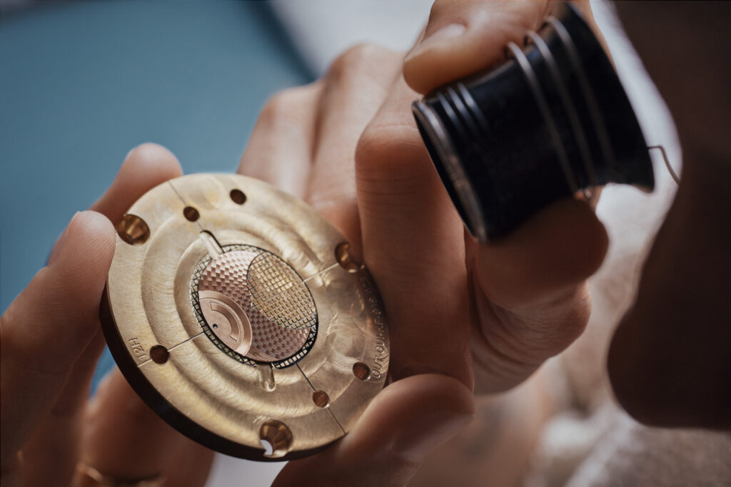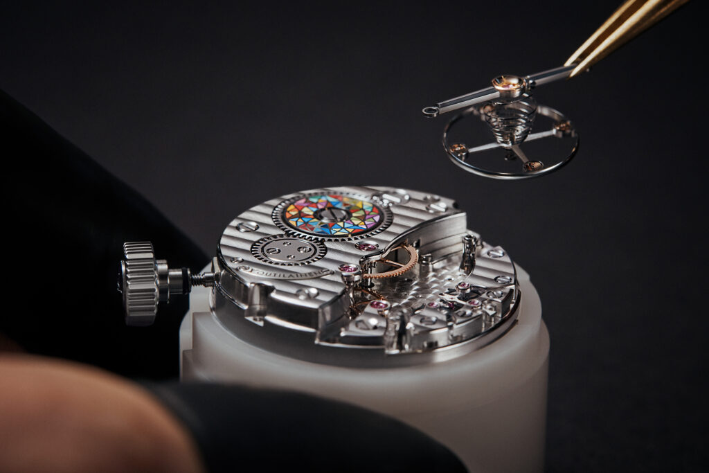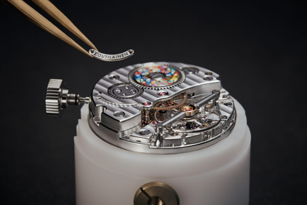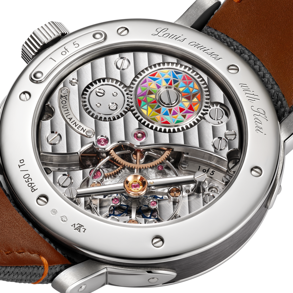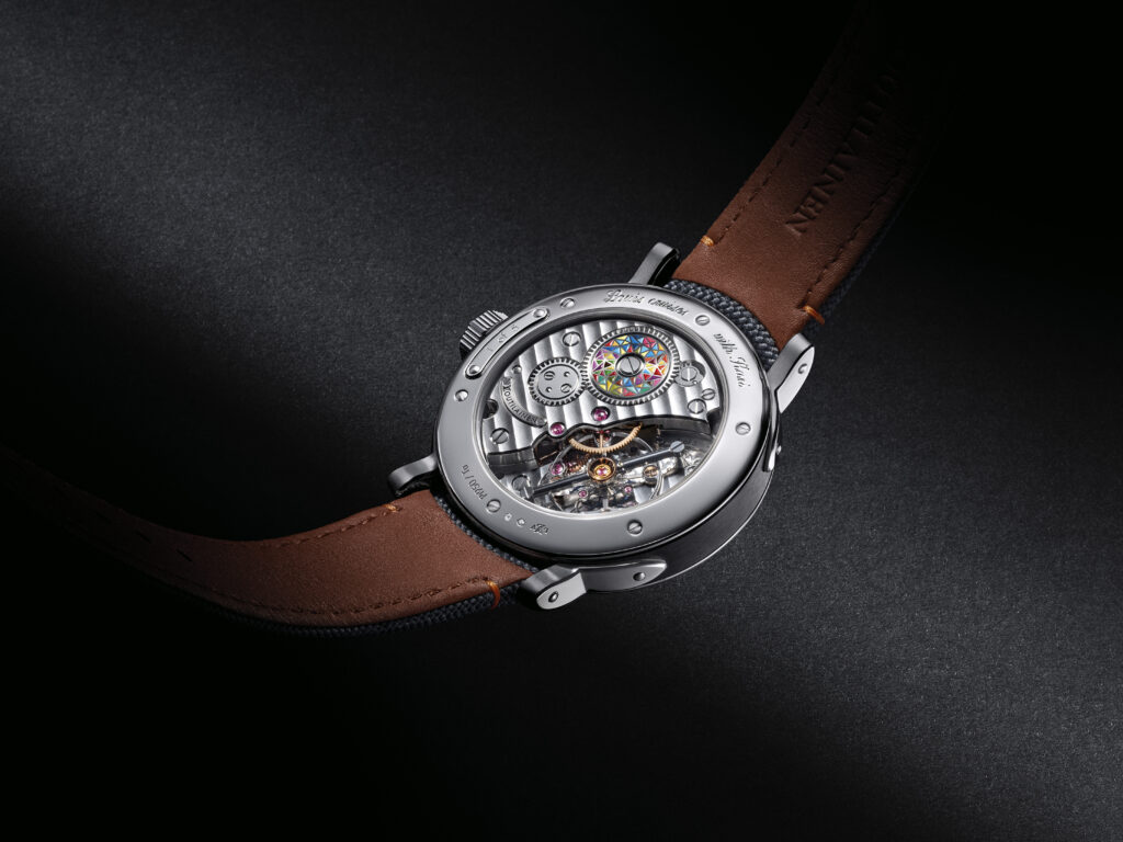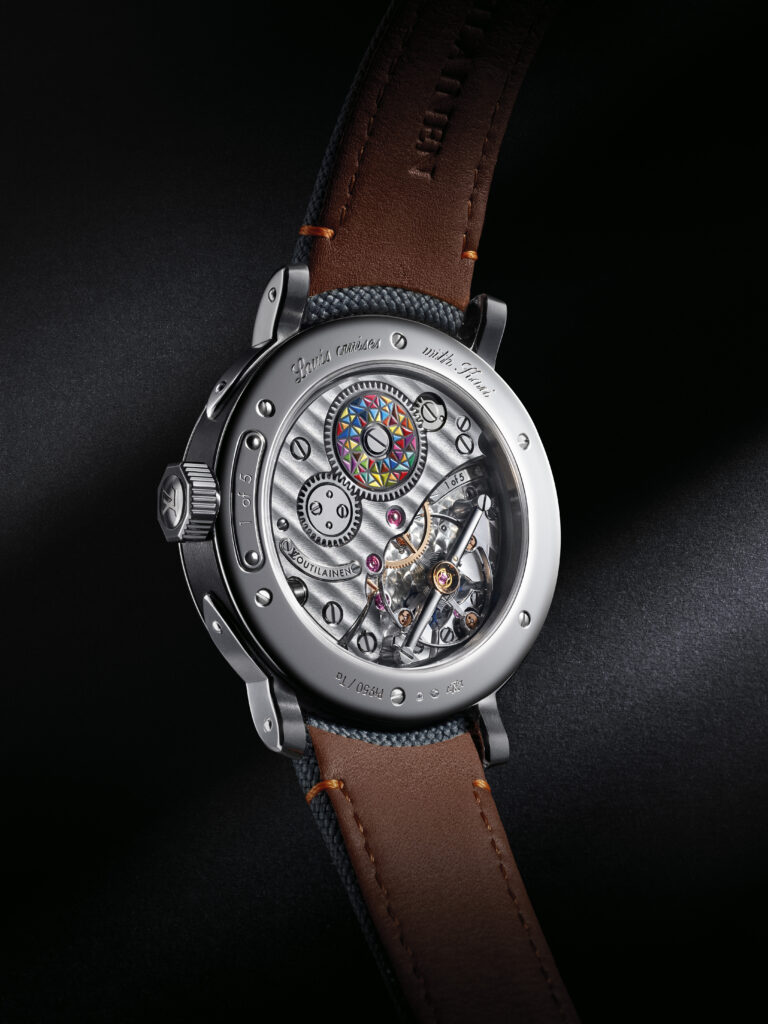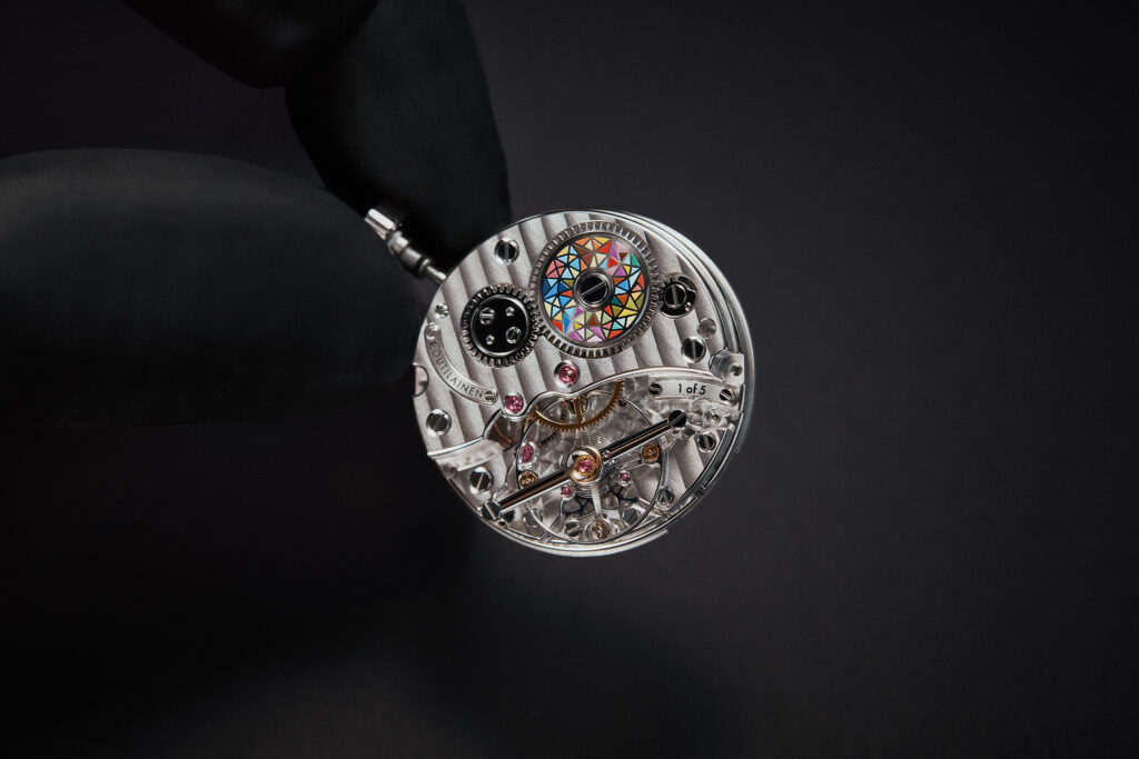 Au dos du boîtier, un saphir révèle le calibre GMR 6 : un mouvement mécanique manuel composé de 254 composants, conçu et assemblé entièrement à l’atelier Voutilainen. Avec ses deux roues d’échappement à impulsion directe, son balancier à courbes Phillips et Grossmann, ses 65 heures de réserve de marche et ses ponts en maillechort, il conjugue esthétique classique et performance contemporaine. Le barillet est orné d’une peinture miniature kaléidoscopique, tandis que le cliquet en or blanc est peint à la main en 27 couleurs, après 27 opérations distinctes et huit heures de cuisson.