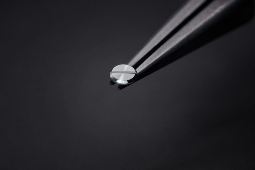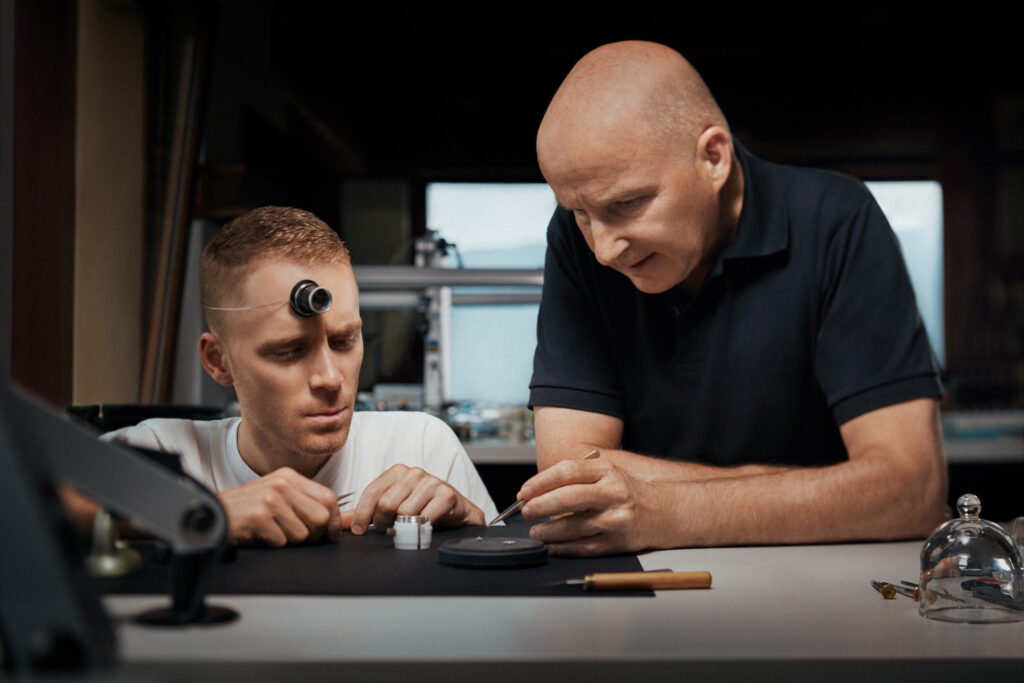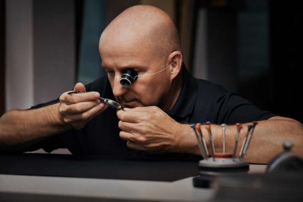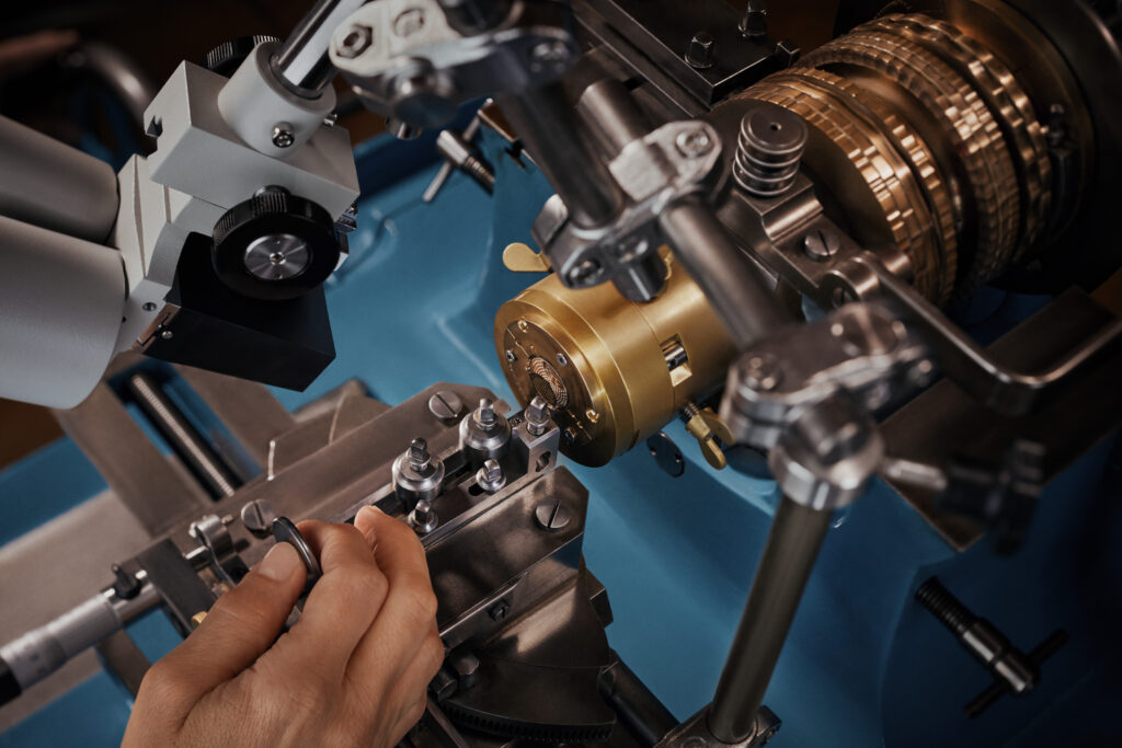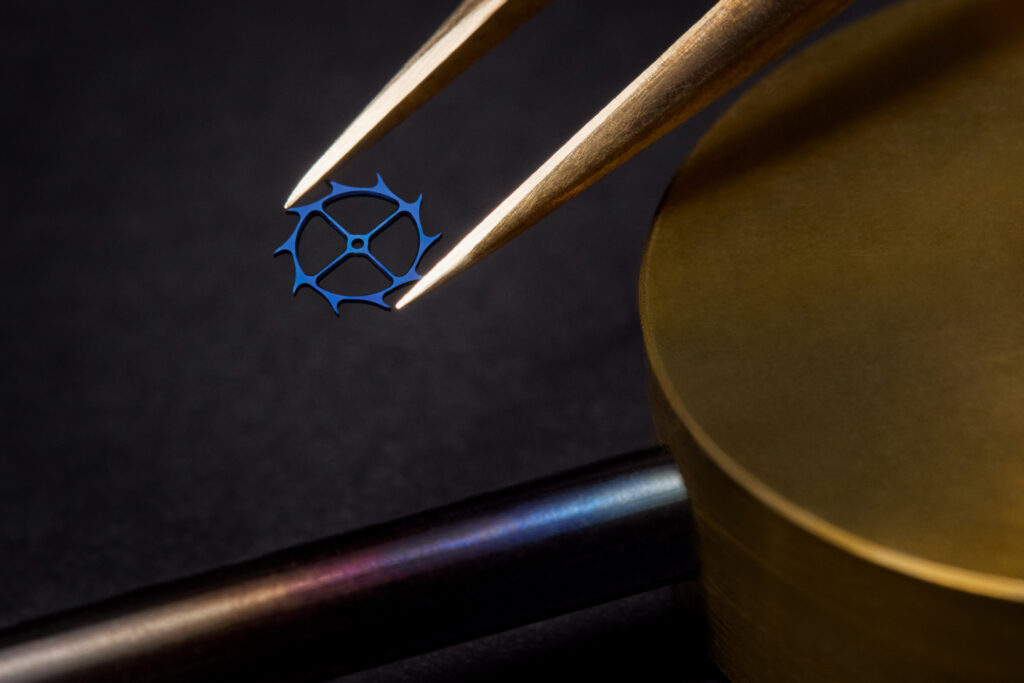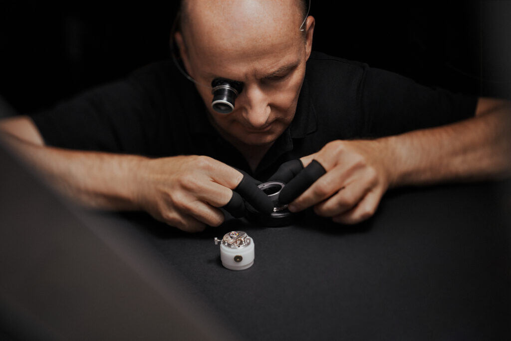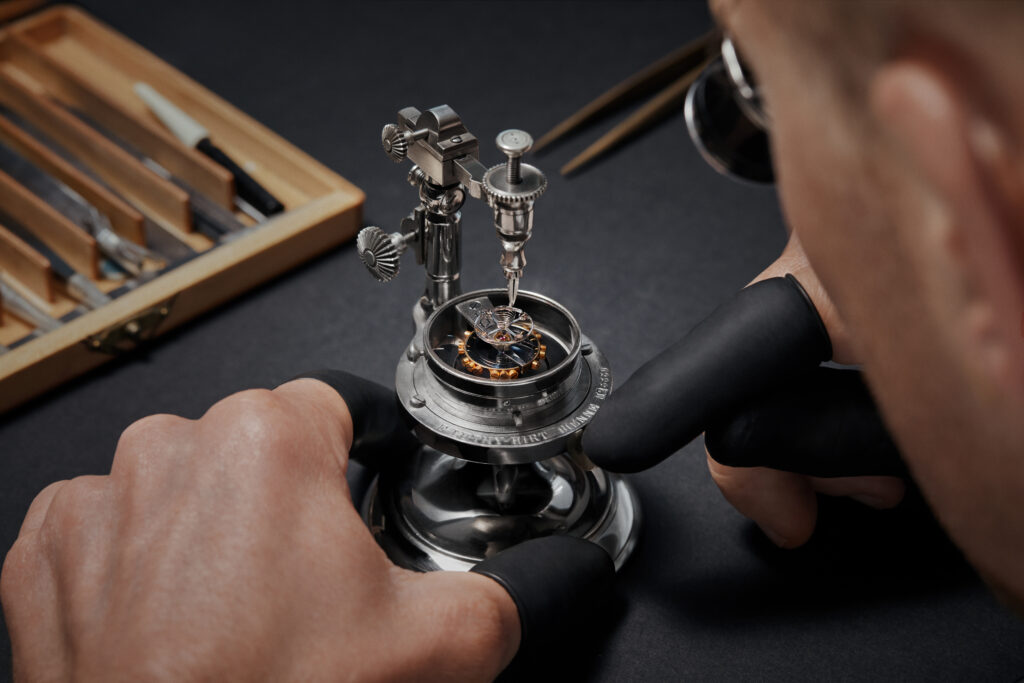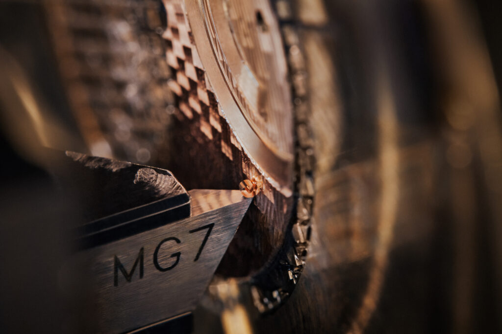 Au dos du boîtier, un saphir révèle le calibre GMR 6 : un mouvement mécanique manuel composé de 254 composants, conçu et assemblé entièrement à l’atelier Voutilainen. Avec ses deux roues d’échappement à impulsion directe, son balancier à courbes Phillips et Grossmann, ses 65 heures de réserve de marche et ses ponts en maillechort, il conjugue esthétique classique et performance contemporaine. Le barillet est orné d’une peinture miniature kaléidoscopique, tandis que le cliquet en or blanc est peint à la main en 27 couleurs, après 27 opérations distinctes et huit heures de cuisson.