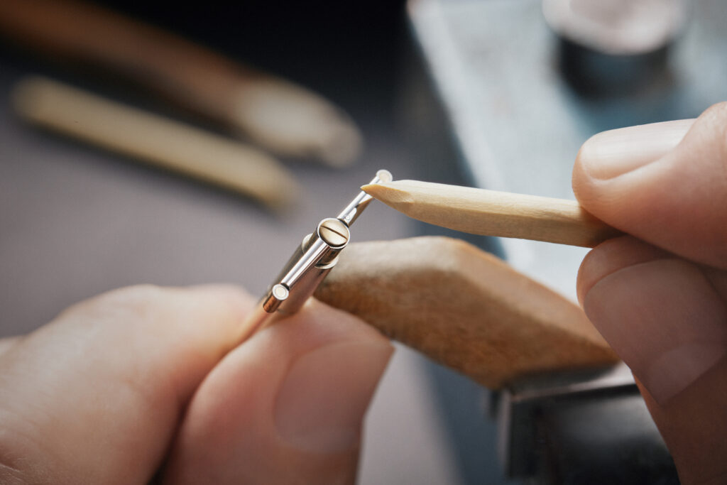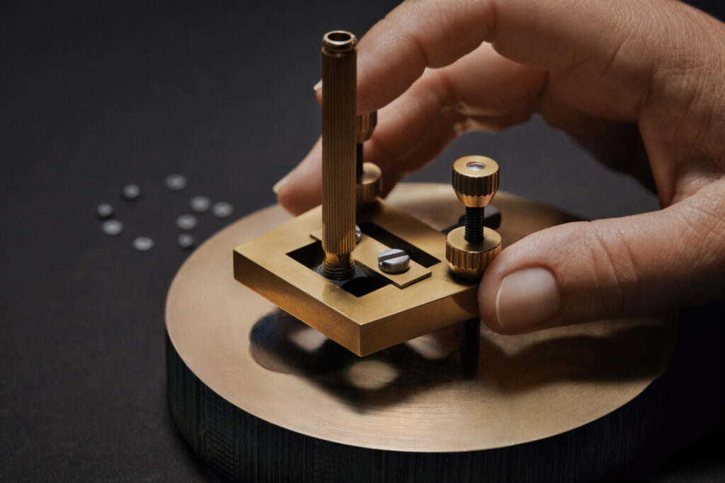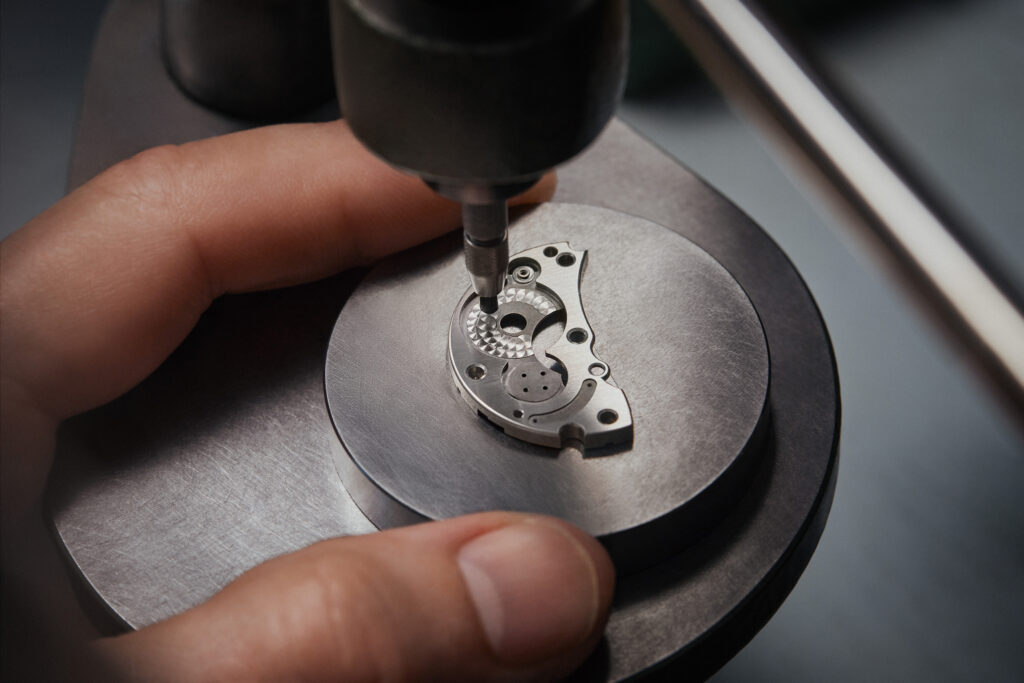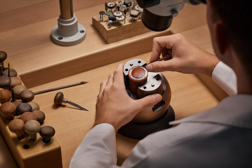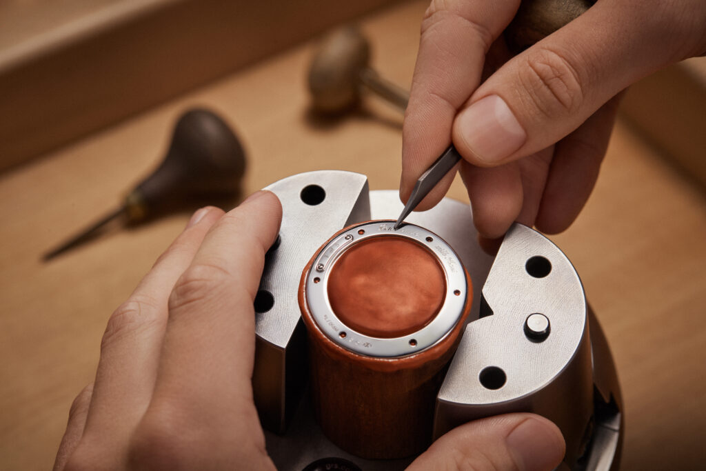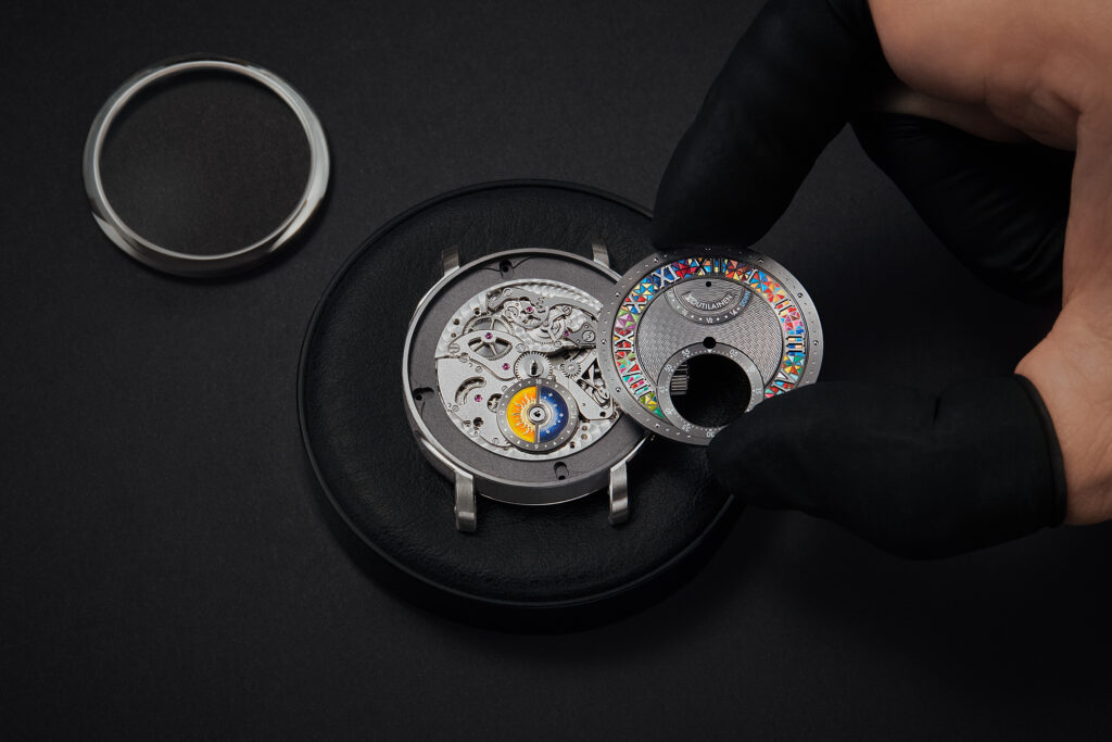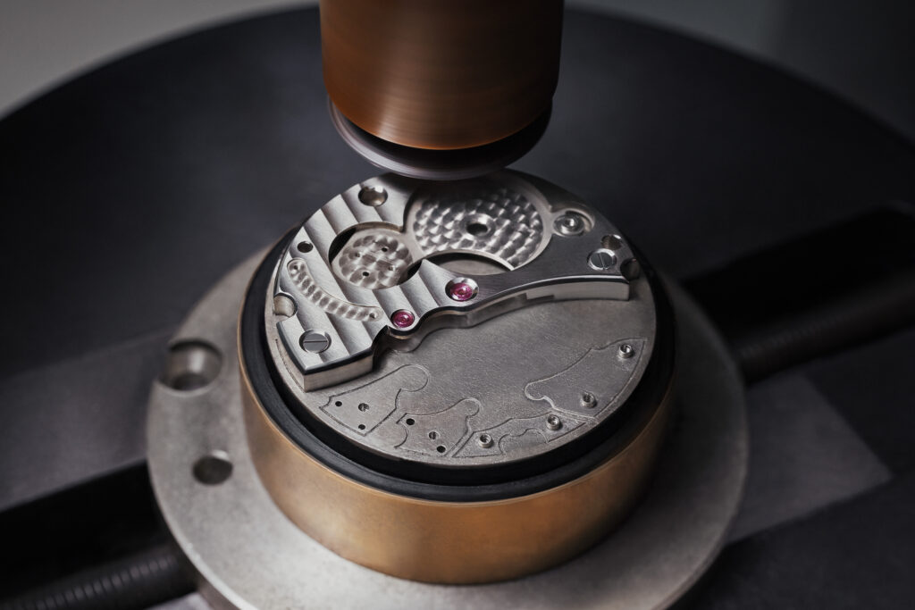 Le boîtier en tantale et platine — 40,5 mm de diamètre, 12,54 mm d’épaisseur — reprend le design iconique de la collection Escale, référence directe aux malles de la Maison. Les cornes évoquent les coins rivetés des valises historiques, et chaque élément — cornes, couronne, boucle ardillon — est façonné en platine puis minutieusement poli ou satiné à la main. Une seule corne requiert une heure de travail manuel, chaque boîtier près de quatre heures pour un satiné parfait sur tantale, métal aussi rare que capricieux. L’ensemble exhale la rigueur extrême du métiers d’art horloger.