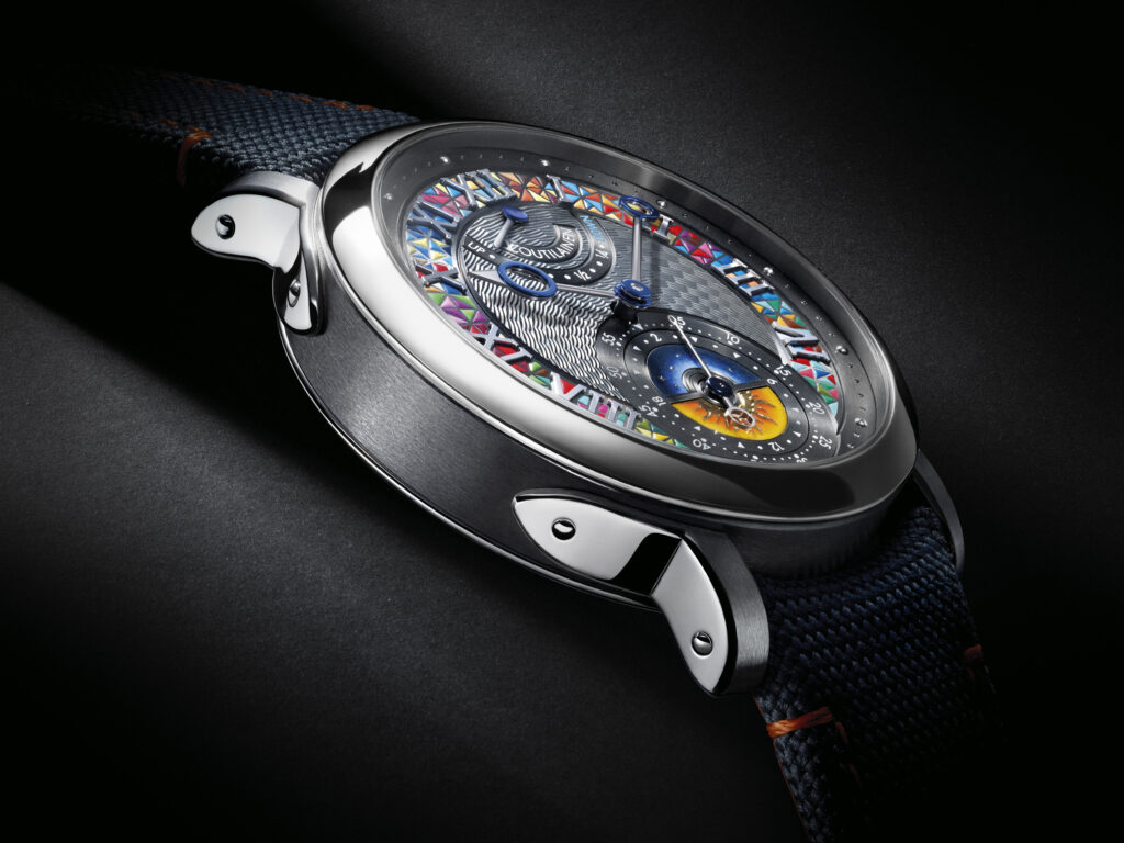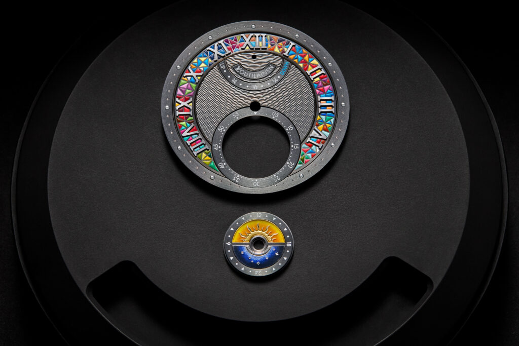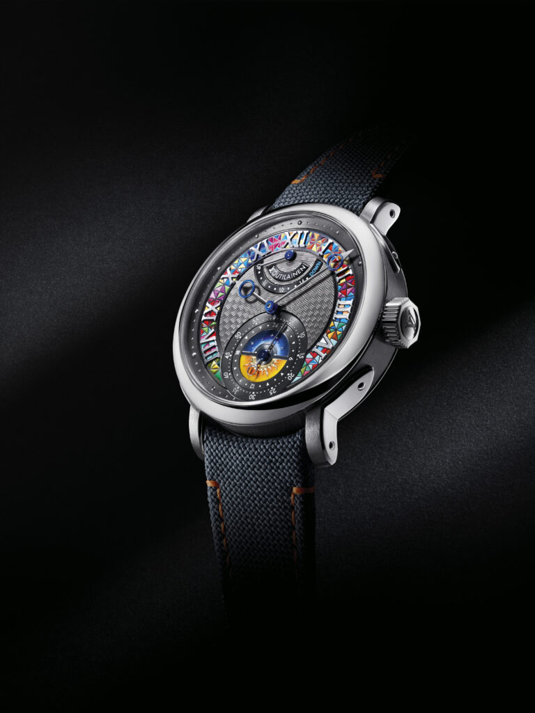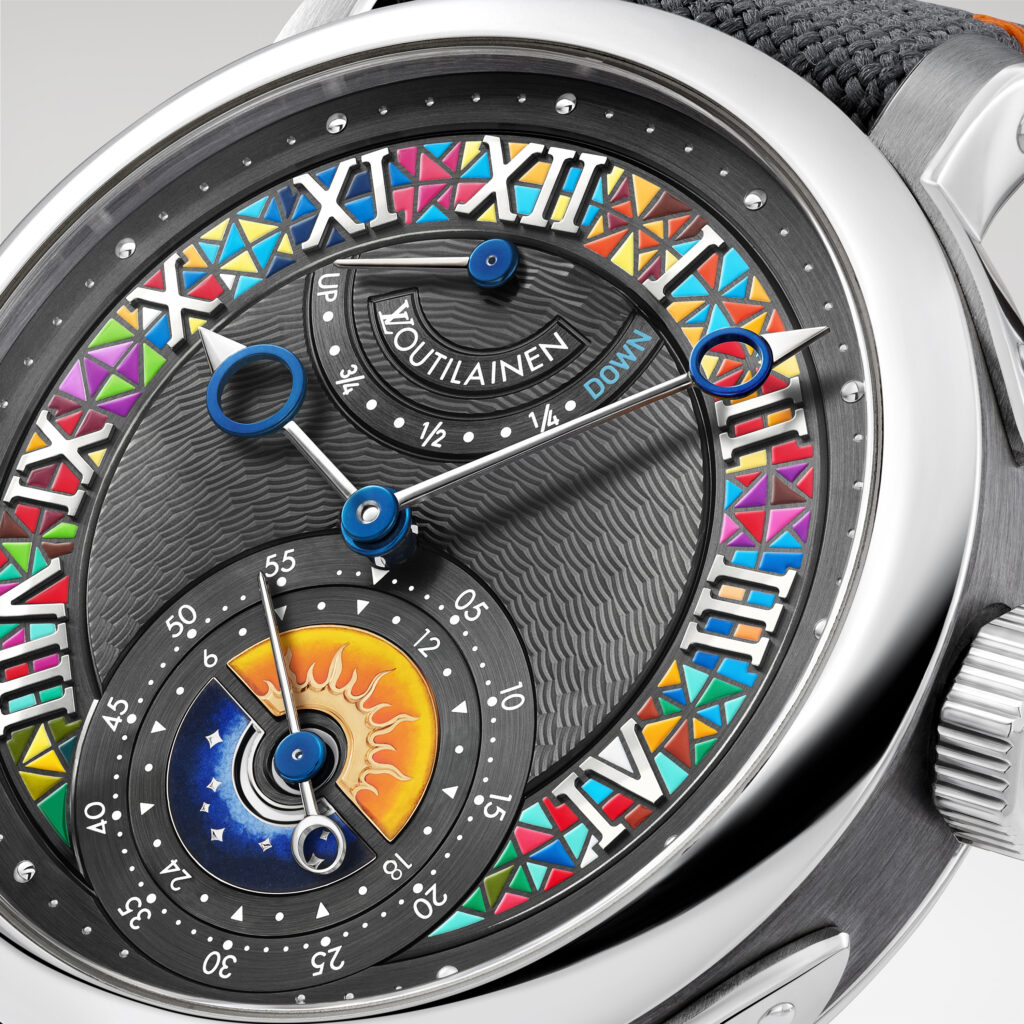 La LVKV-02 GMR 6 présente un cadran en or guilloché à la main, orné d’un motif inspiré du Damier Louis Vuitton. Le cercle des heures, décoré de 28 couleurs différentes sur peinture miniature signée Maryna Bossy, exige à lui seul 32 heures de travail et huit heures de cuisson. Un disque GMT en or à 6h indique un second fuseau horaire, enrichi d’un jour/nuit peint et émaillé à la main, où se cachent les fleurs du Monogram, dans une alchimie de bleu et safran. Chaque détail, jusqu’au logo fusionné « LVoutilainen », incarne la symbiose de deux univers : la fantaisie codifiée de Louis Vuitton et la précision intemporelle de Voutilainen.