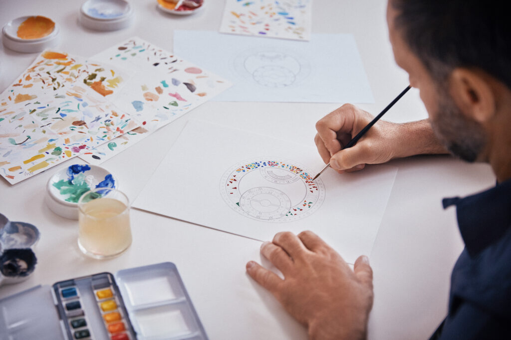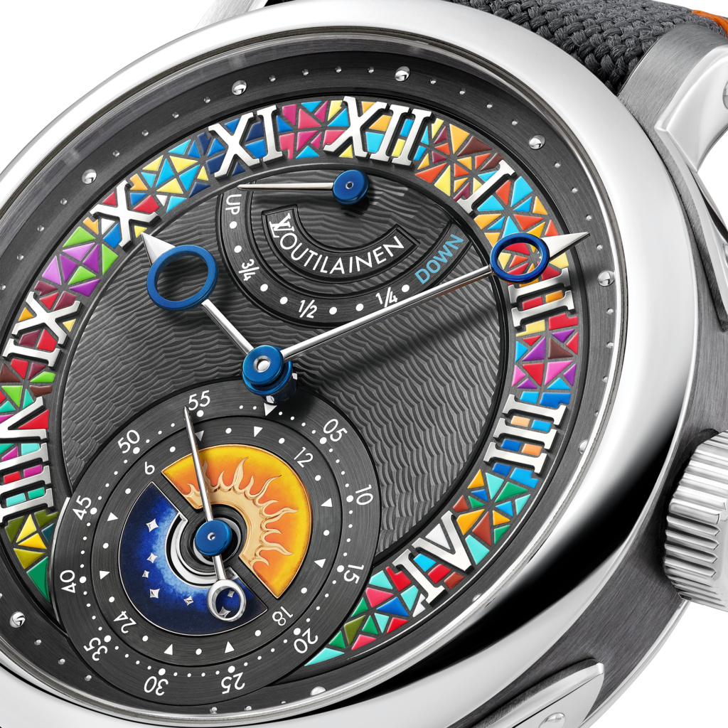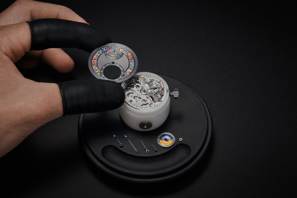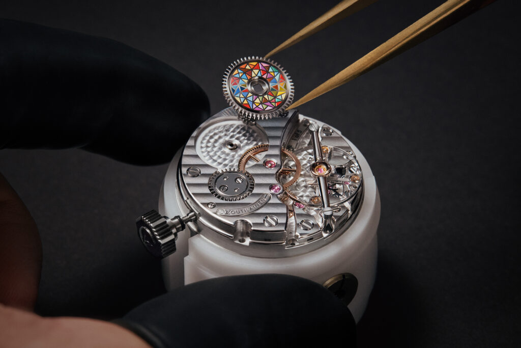 La LVKV-02 GMR 6 présente un cadran en or guilloché à la main, orné d’un motif inspiré du Damier Louis Vuitton. Le cercle des heures, décoré de 28 couleurs différentes sur peinture miniature signée Maryna Bossy, exige à lui seul 32 heures de travail et huit heures de cuisson. Un disque GMT en or à 6h indique un second fuseau horaire, enrichi d’un jour/nuit peint et émaillé à la main, où se cachent les fleurs du Monogram, dans une alchimie de bleu et safran. Chaque détail, jusqu’au logo fusionné « LVoutilainen », incarne la symbiose de deux univers : la fantaisie codifiée de Louis Vuitton et la précision intemporelle de Voutilainen.
