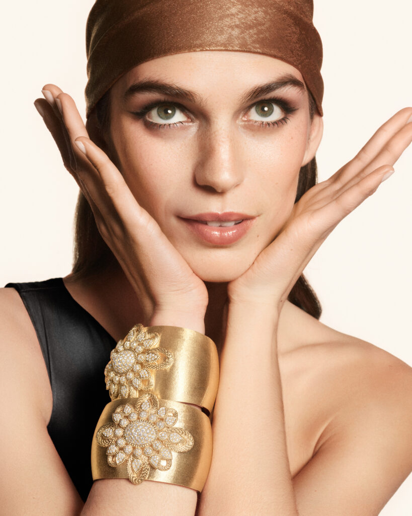 L’un des temps forts de cette ligne est la version monochrome de la Haute Joaillerie : des pièces en or blanc entièrement serties de diamants. Le bracelet-manchette imposant, orné d’un motif floral inspiré du collier originel, capte immédiatement l’attention. Sa finition mate souligne l’esprit vintage de la création.