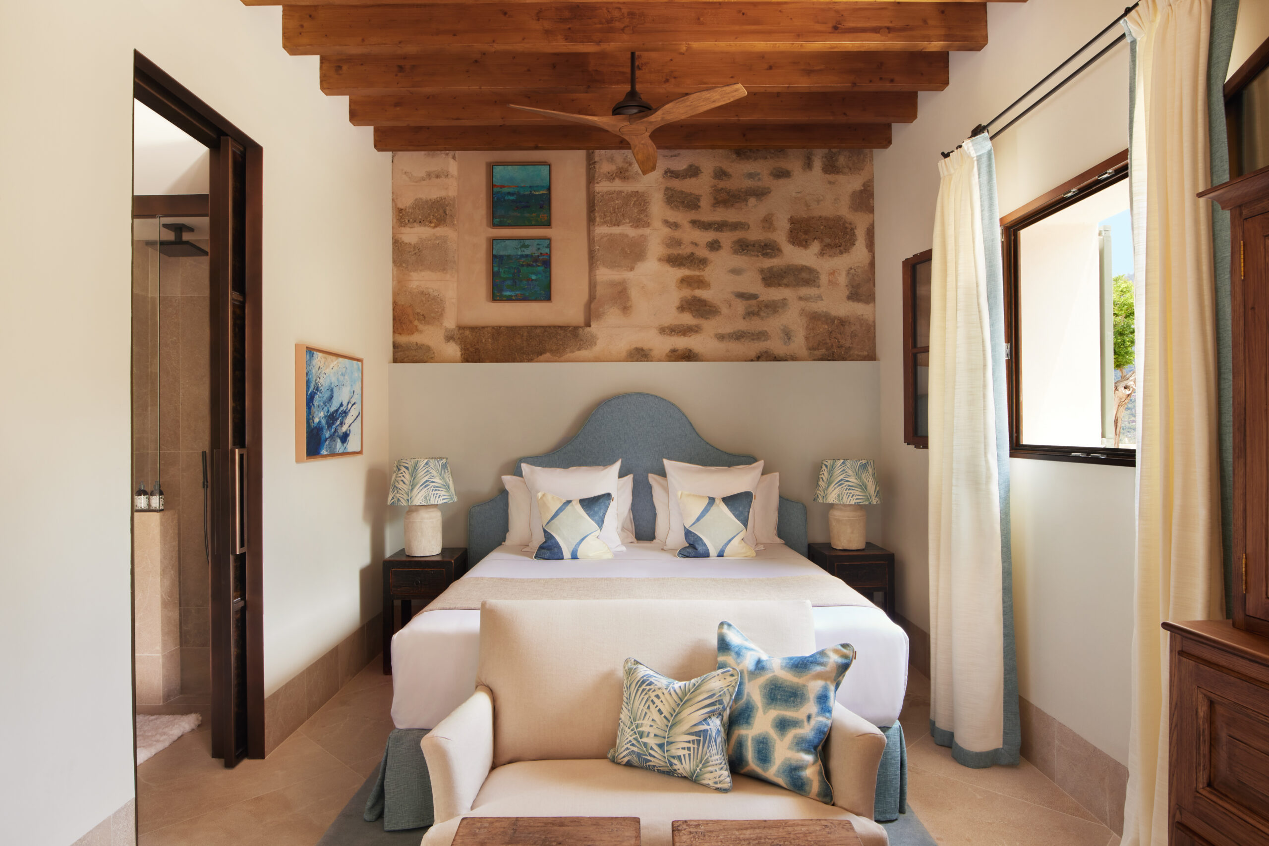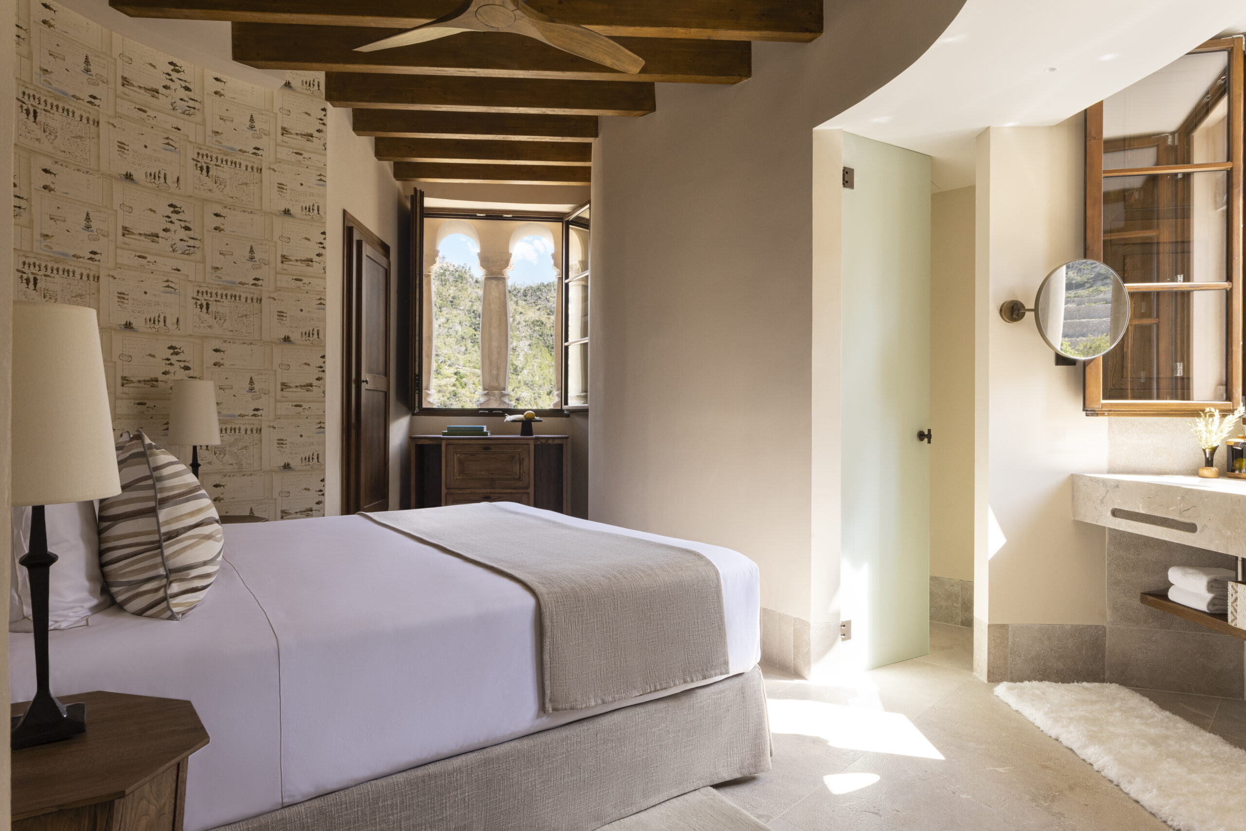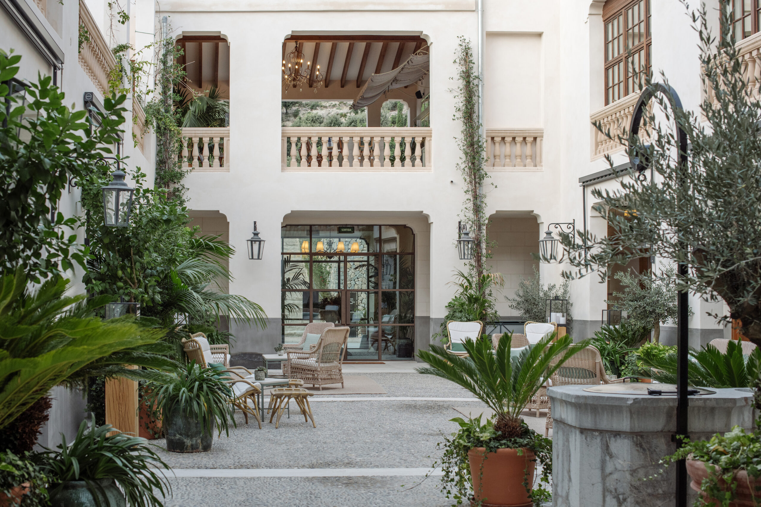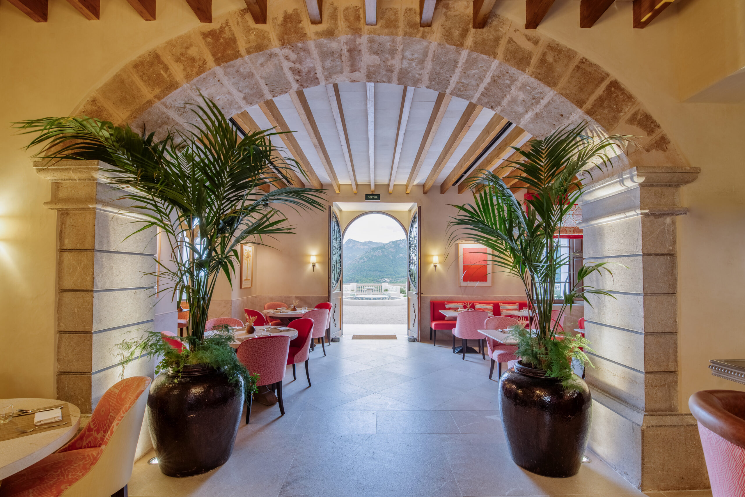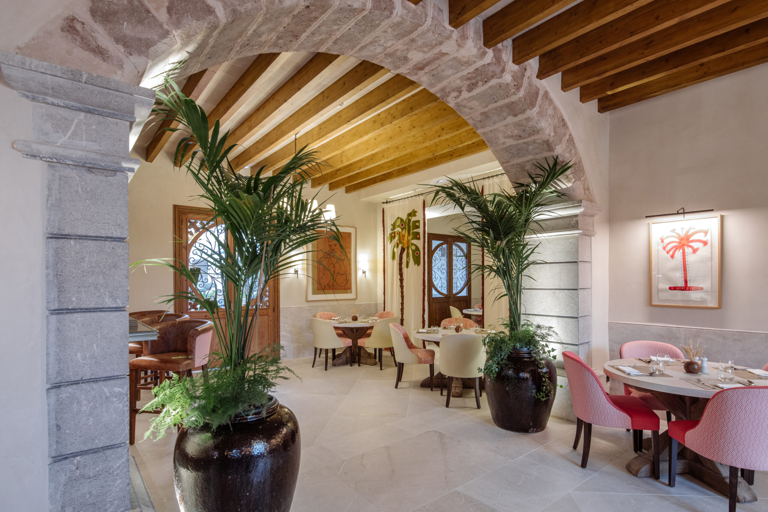 L’hôtel allie héritage et modernité, avec des matériaux traditionnels majorquins, des poutres apparentes et des arches en pierre restaurées, sublimées par un design contemporain signé Rialto Living.
