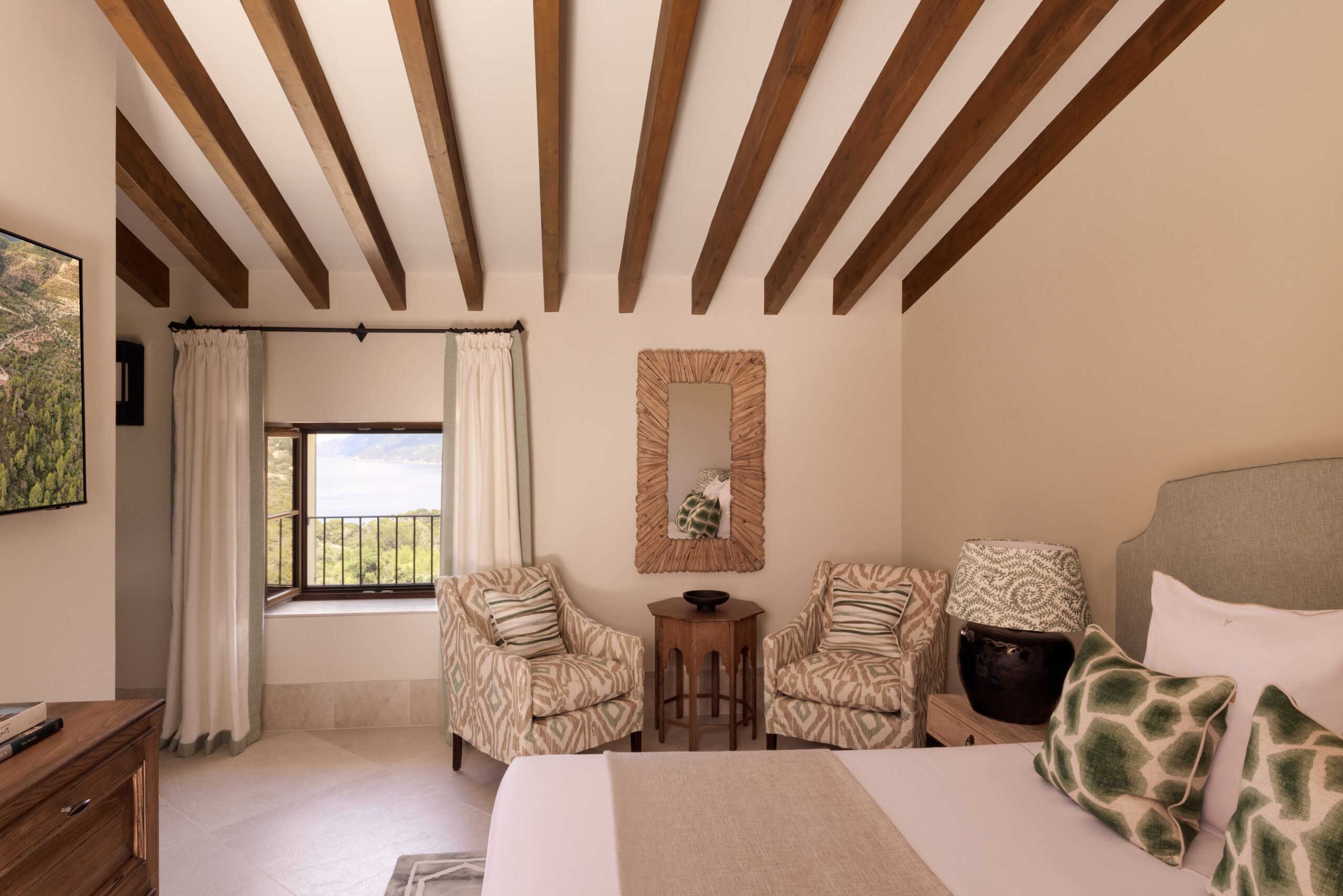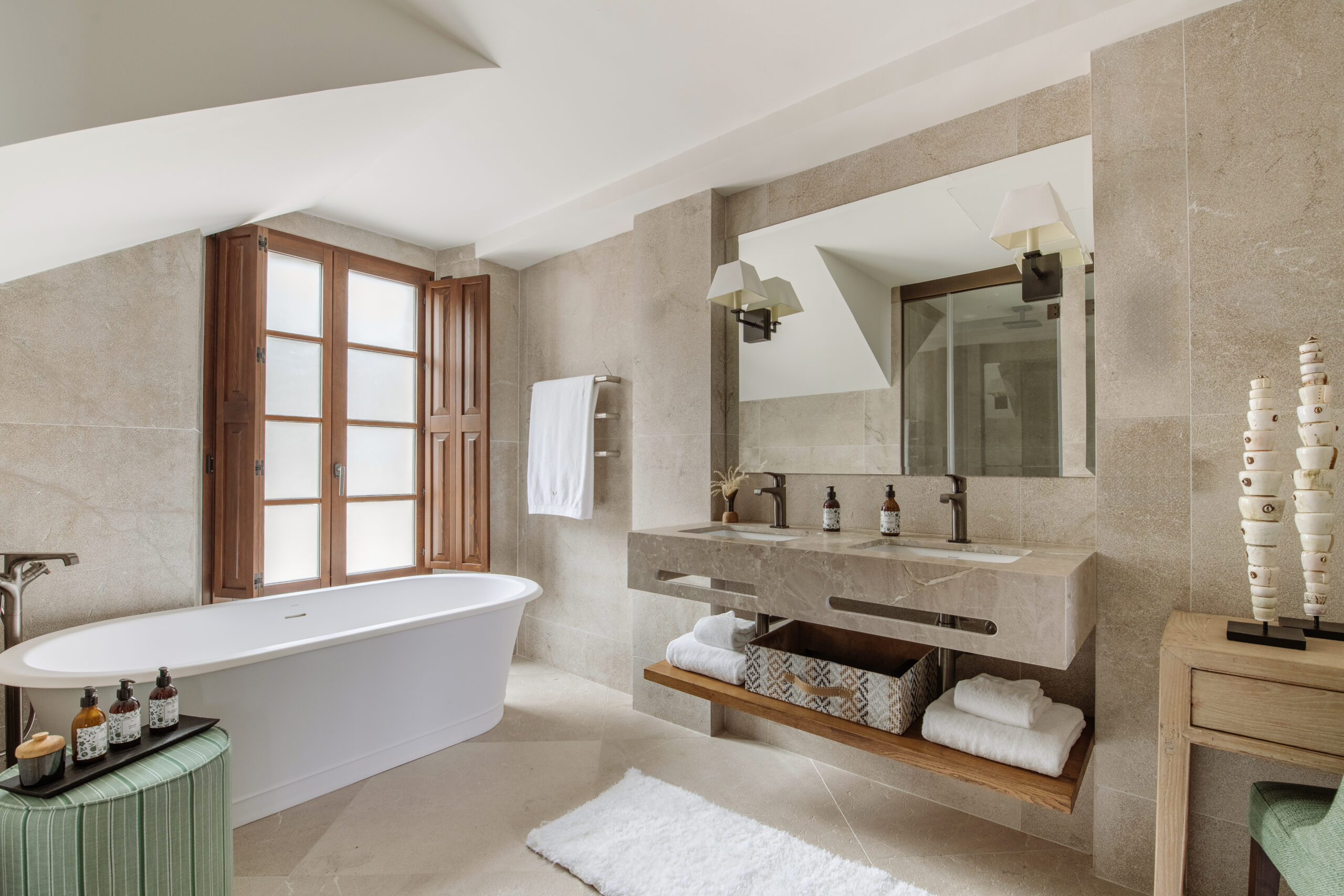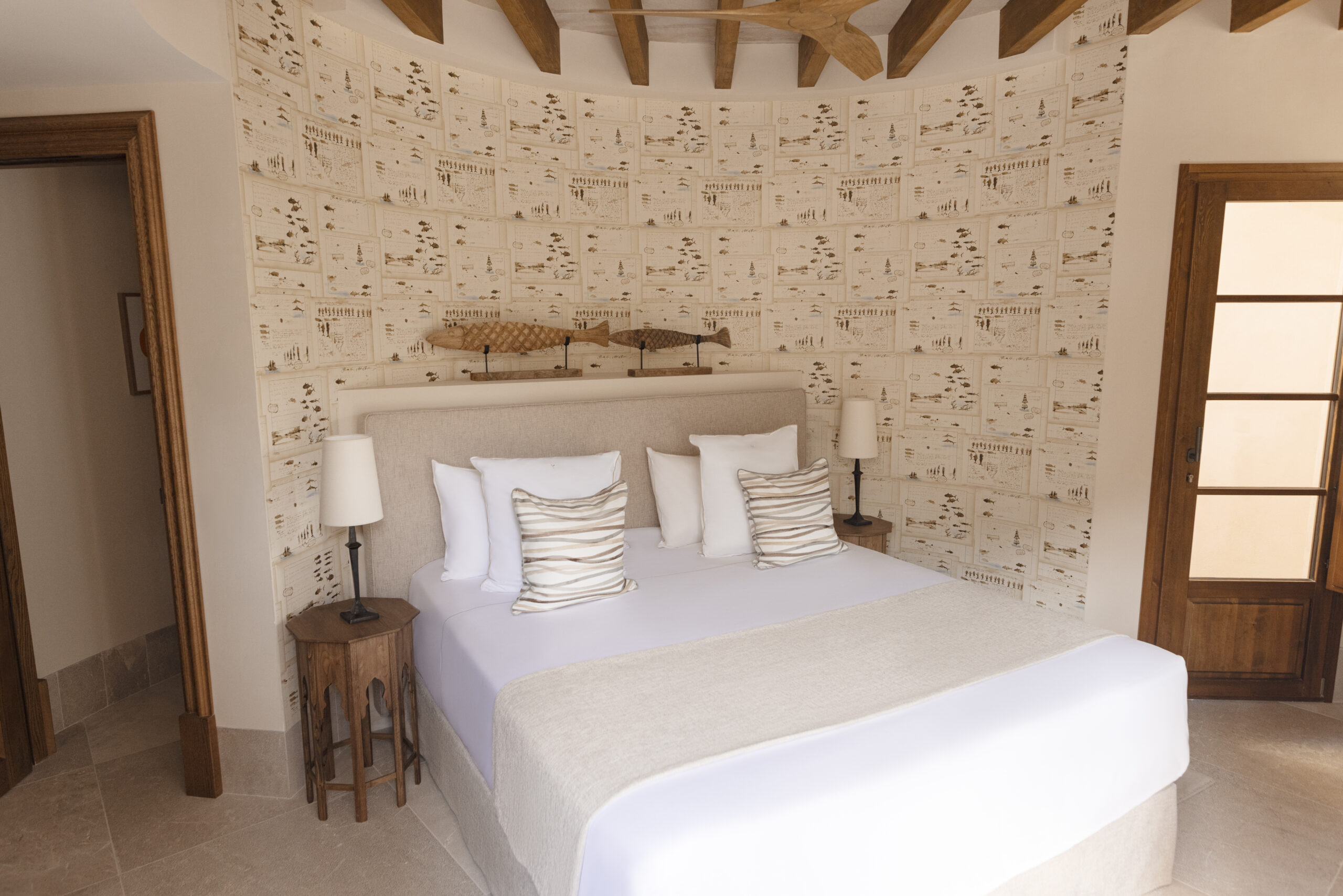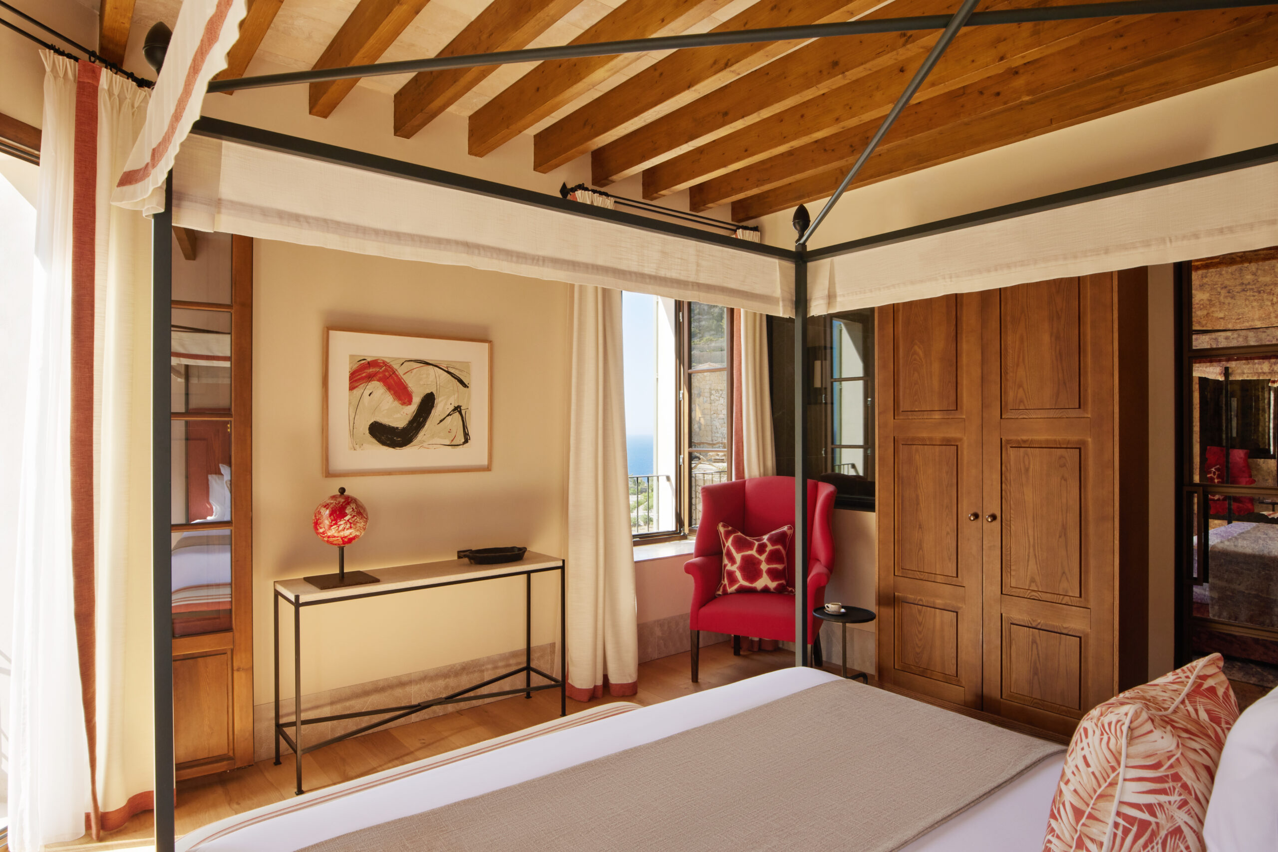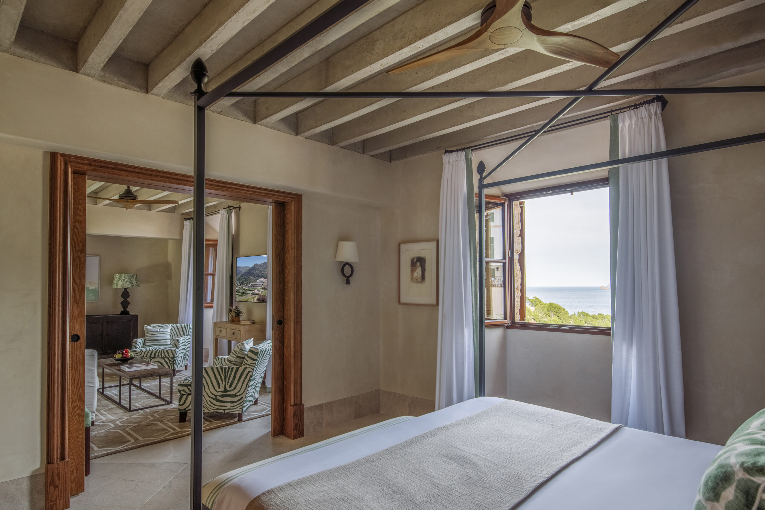 L’hôtel allie héritage et modernité, avec des matériaux traditionnels majorquins, des poutres apparentes et des arches en pierre restaurées, sublimées par un design contemporain signé Rialto Living.