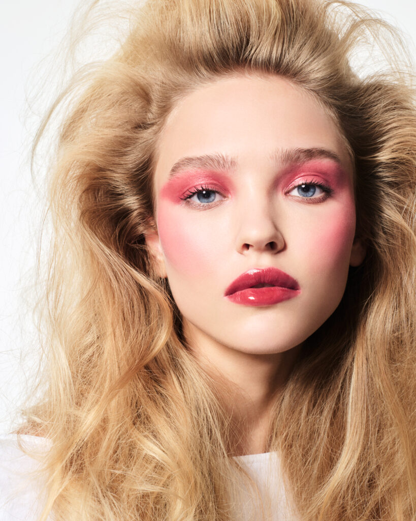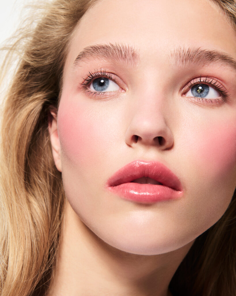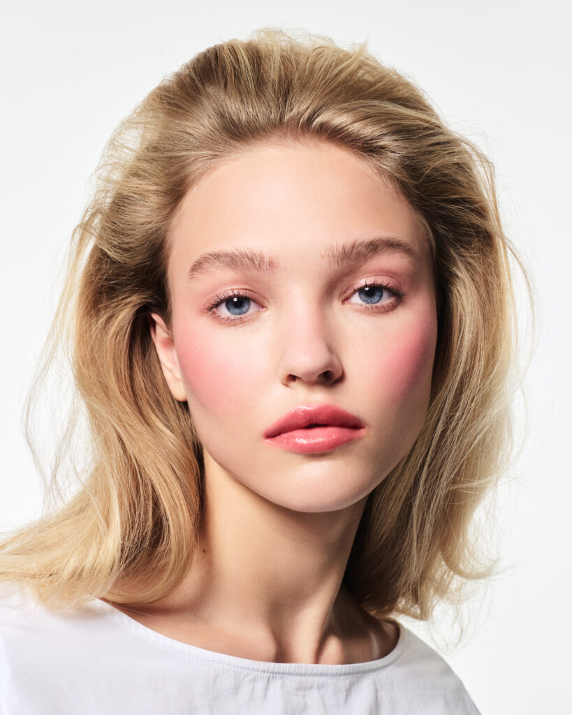 Les lèvres, sublimées par le Lush Lipstick Hibiscus, affichent un éclat exotique et sensuel. Les yeux, à peine effleurés par une touche de mascara, jouent la carte de la transparence. Pour intensifier cet effet “flushed”, le blush s’étire jusqu’aux tempes et fusionne avec la paupière mobile, conférant une cohérence chromatique en parfaite symbiose avec l’éveil printanier.