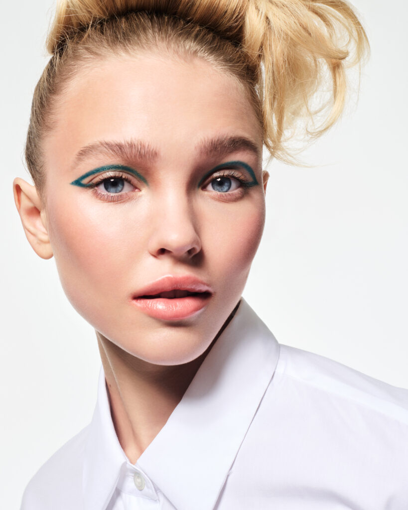 L’association du Automatic Pencil for Eyes K31 Teal, au fini métallique, souligne le regard d’une teinte bleu-vert chatoyante, à la manière d’un bijou précieux. Sur les lèvres, l’abricot lumineux du Lush Lipstick Misty Melon apporte une douceur équilibrante à cette explosion chromatique. Ici, le maquillage s’affranchit des règles : les couleurs sont posées avec un enthousiasme plus intuitif que maîtrisé.
