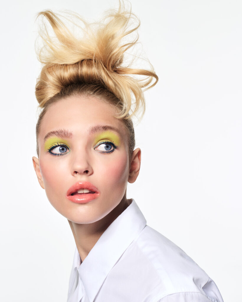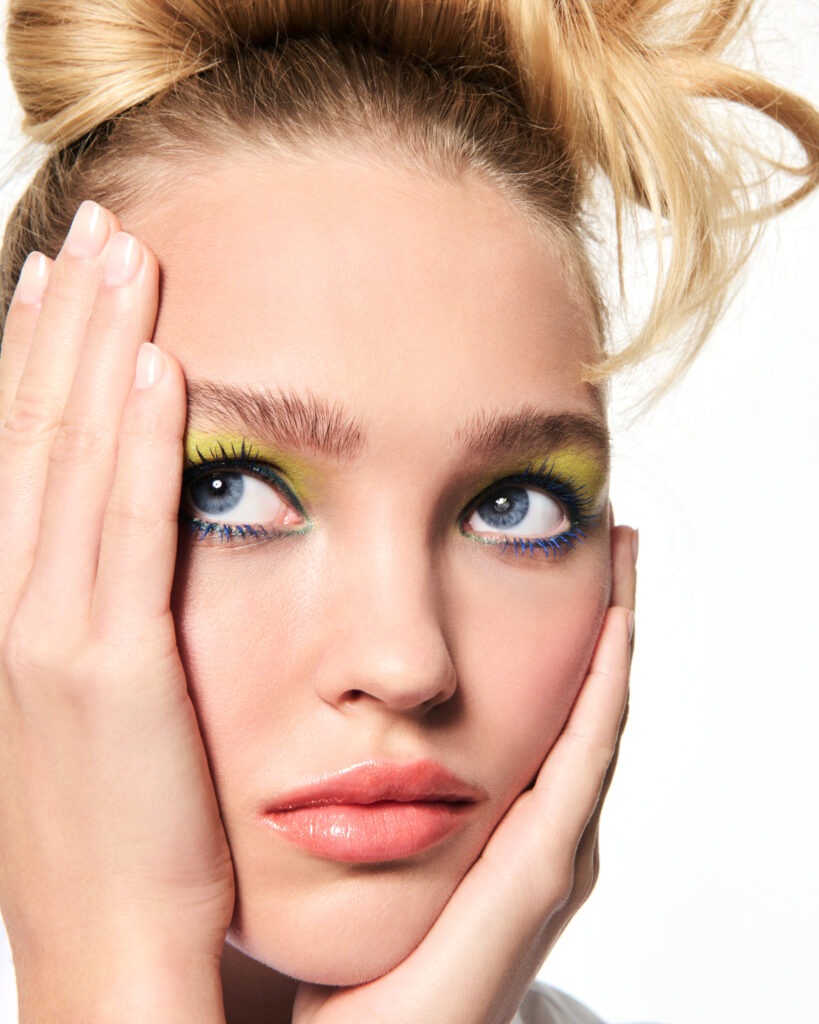 Impossible de ne pas succomber à l’énergie de ce look, où la couleur est reine. Le Automatic Pencil for Eyes K30 Sun irradie d’un jaune solaire vibrant, tandis que le Perfect Volume Mascara Cornflower enrobe les cils d’un bleu hypnotique.