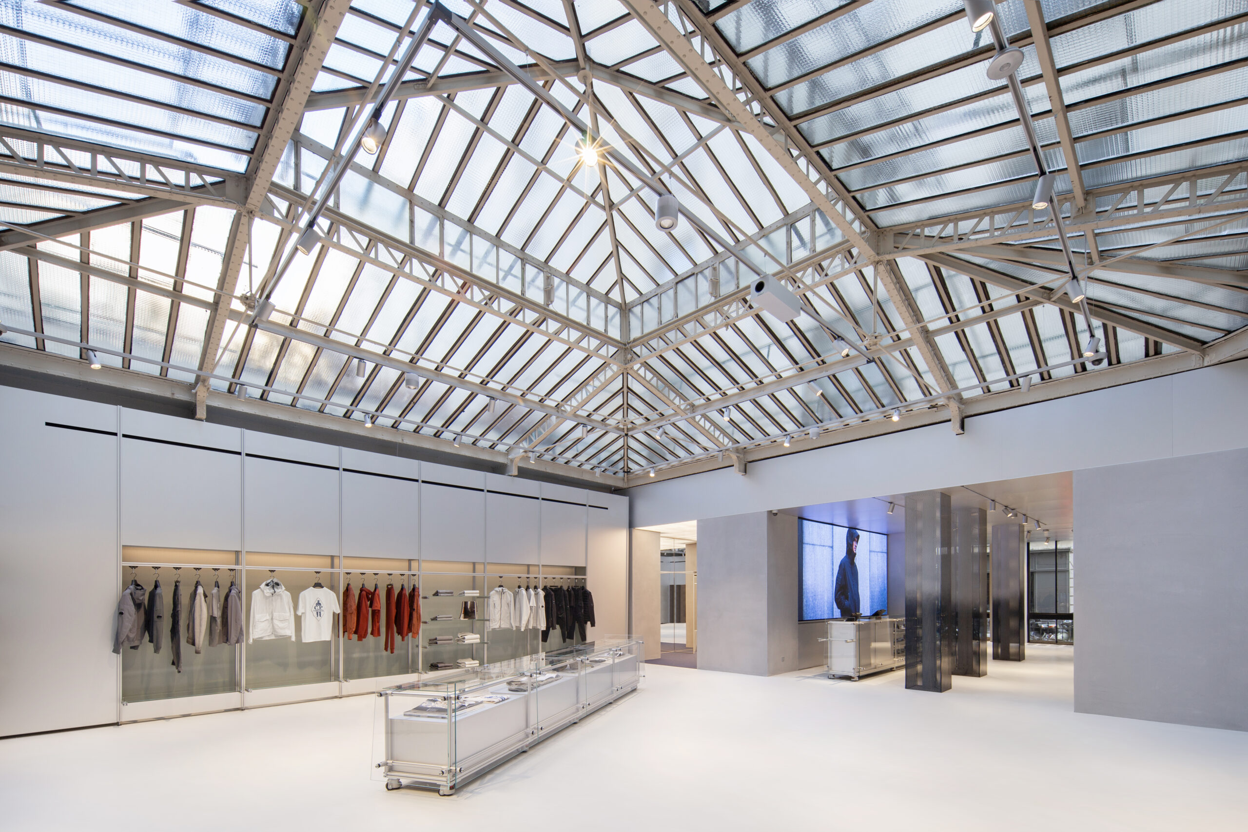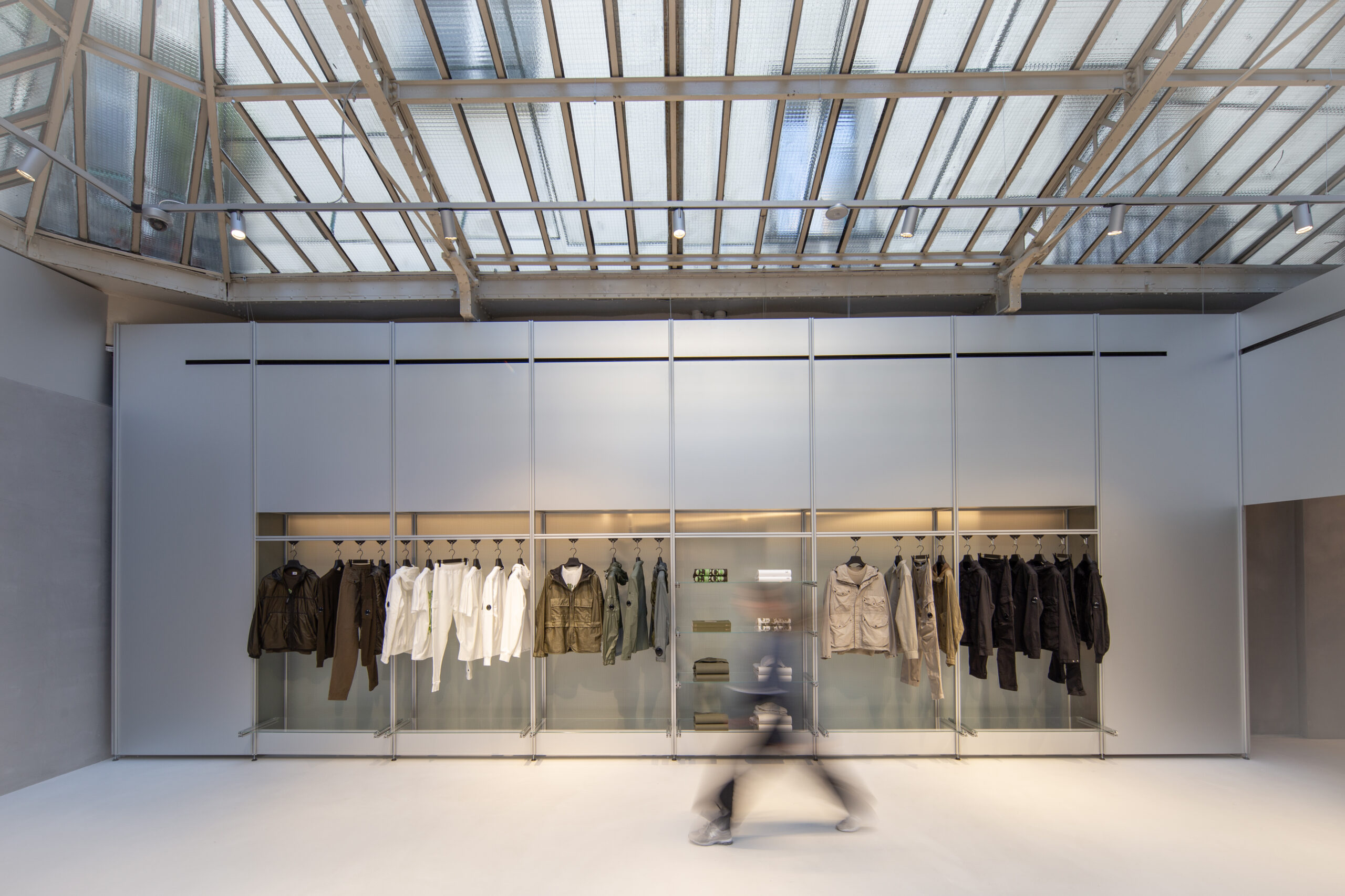 Réparti sur 300 mètres carrés, ce nouveau Flagship offre un écrin spacieux qui illustre la relation étroite de C.P. Company avec l’innovation et l’esthétique fonctionnelle. Le projet architectural, confié à Andrea Caputo Studio, fait la part belle à la lumière naturelle grâce à une verrière en verre et métal qui coiffe l’espace de vente. Ce dispositif met en valeur non seulement la structure du bâtiment, mais aussi l’agencement des collections, subtilement éclairées par les rayons du jour.