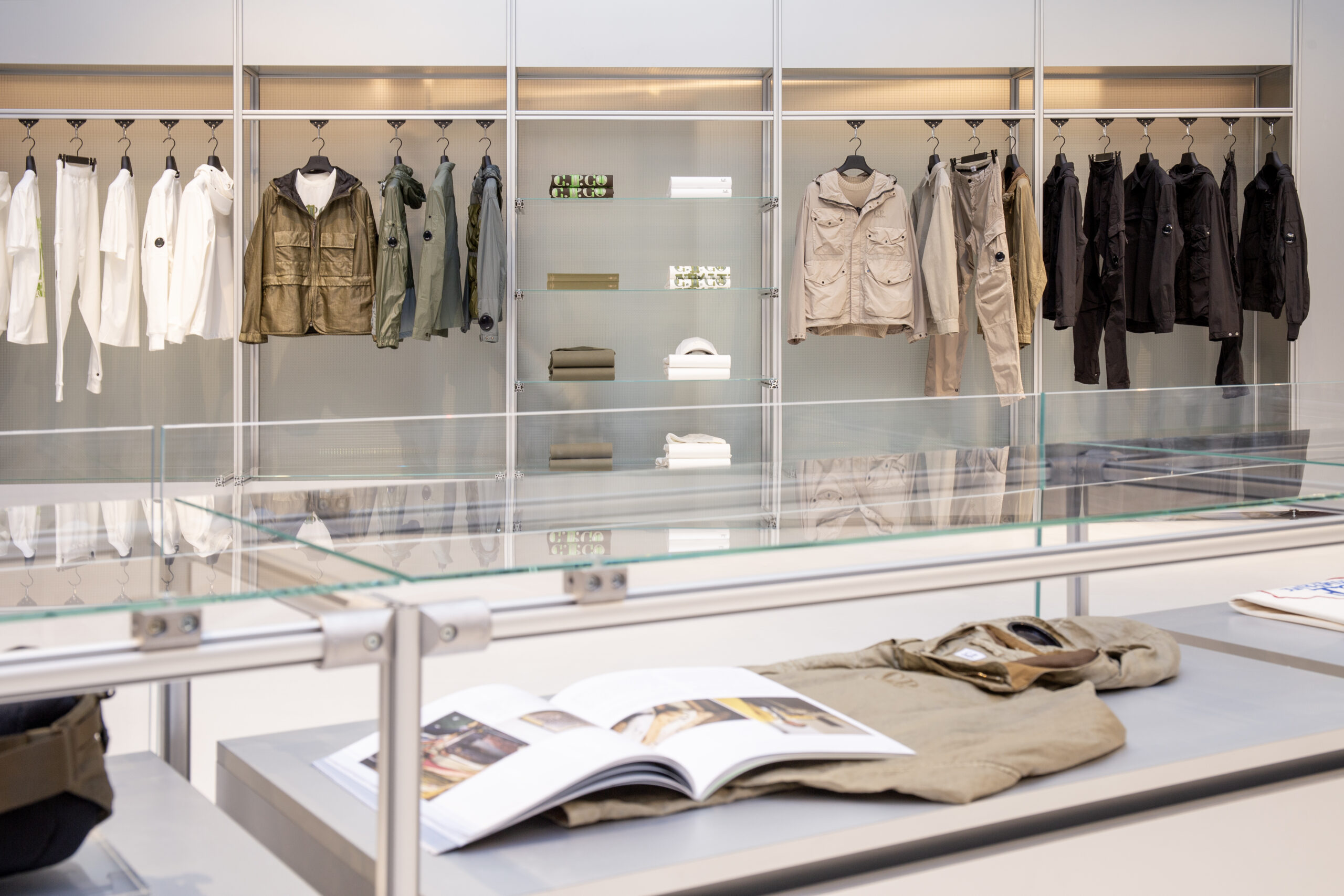 Une attention particulière est portée à la scénographie : des présentoirs en matériaux bruts, tels que le métal et le bois, rythment l’espace et rappellent les valeurs utilitaires chères à C.P. Company. Les teintes sobres du lieu sont rehaussées de touches de couleur qui reflètent l’héritage graphique de la marque, née à Bologne sous le nom de Chester Perry avant de devenir C.P. Company en 1978.