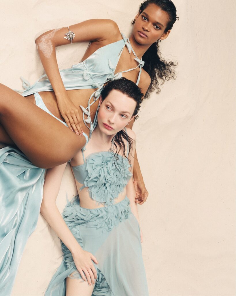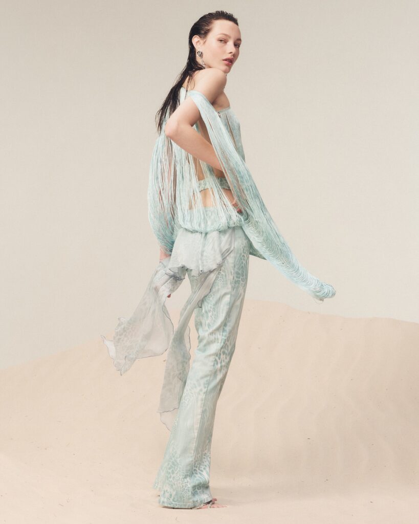 Les silhouettes se déclinent avec une audace raffinée. Des slips-dresses languissantes semblent émerger des flots, parées de sequins liquides translucides et bordées de franges cristallines qui capturent et reflètent la lumière du soleil. Des touches florales – bouquets de fleurs aux teintes ensoleillées, appliqués sur des décolletés délicats ou réinterprétés en imprimés subtils – apportent une douceur romantique, contrastant avec l’éclat métallique des teintes pâles de bleu ou de jaune acidulé qui rappellent le scintillement de l’eau.