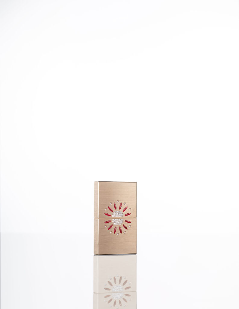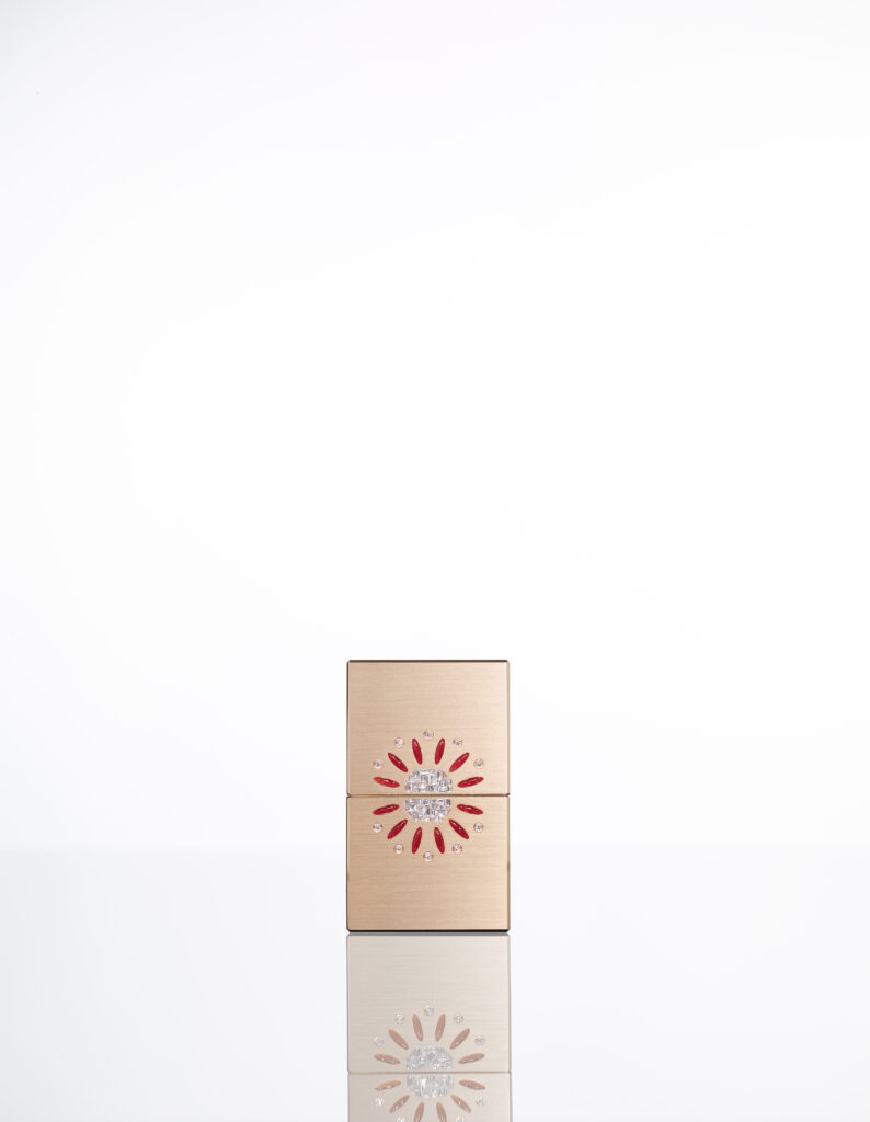 Enfin, le modèle Fleur incarne une délicate floraison solaire. Inspirée des motifs botaniques de l’Art Déco, cette création se compose de 12 cabochons ovales de cornaline, entourés de 10 gouttes de rosée en diamants, le tout convergeant vers un cœur mosaïque de 46 baguette diamonds, le tout logé dans une structure en or rose 18 carats. Ce modèle, véritable ode à la romance et au raffinement, capture l’essence d’un art de vivre où chaque détail raconte une histoire d’excellence.