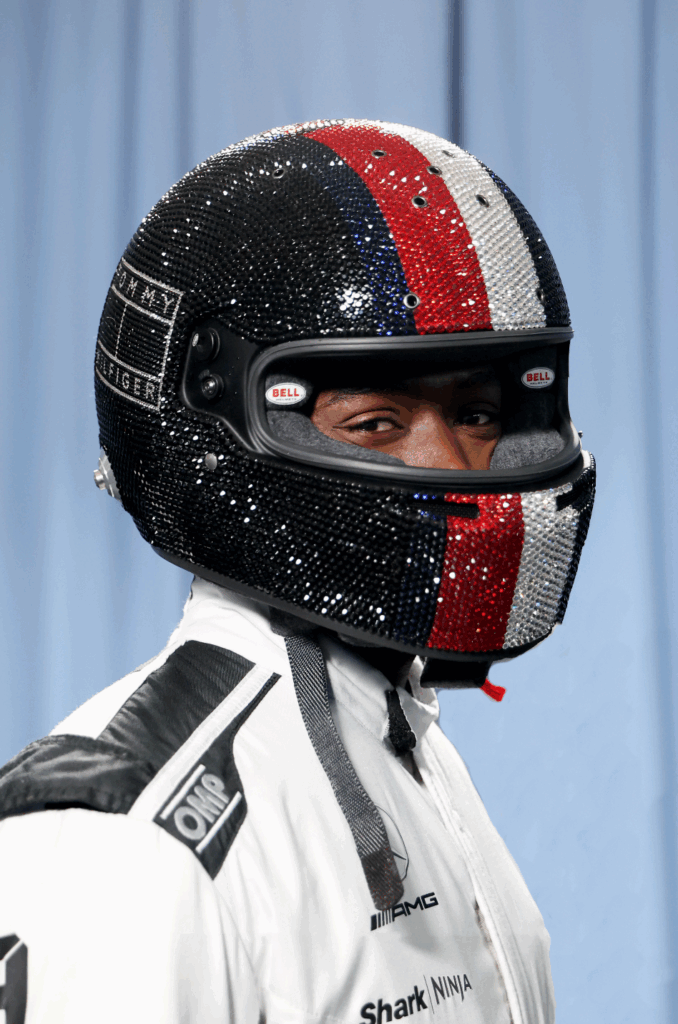 Tommy Hilfiger, fidèle à son esthétique pop-américaine, a transformé Damson Idris en pilote d’élite pour le tapis rouge, clin d’œil direct au prochain film F1 dans lequel l’acteur joue. Vêtu d’une combinaison de course personnalisée et d’un casque orné de 20 000 cristaux Swarovski rouges, bleus et blancs, l’ensemble fusionne showbiz, sport et brillance millimétrée.