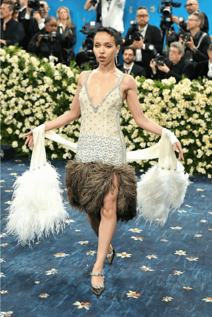 Wales Bonner s’est illustrée avec deux silhouettes sublimes, portées respectivement par FKA Twigs et Omar Apollo. Ces tenues, brodées par le prestigieux atelier Lesage, sont un hommage aux savoir-faire conjoints français et autrichien. 10 200 cristaux aux tailles mixtes (goutte, feuille, perle et rond) illuminent ces créations d’une aura mystique, entre héritage et avant-garde.