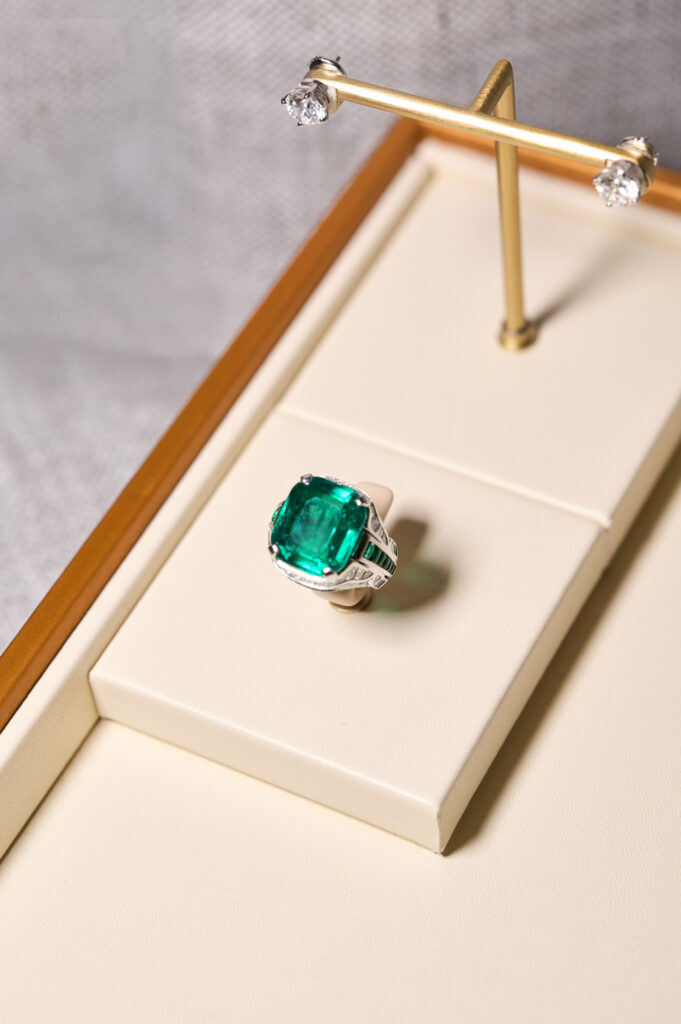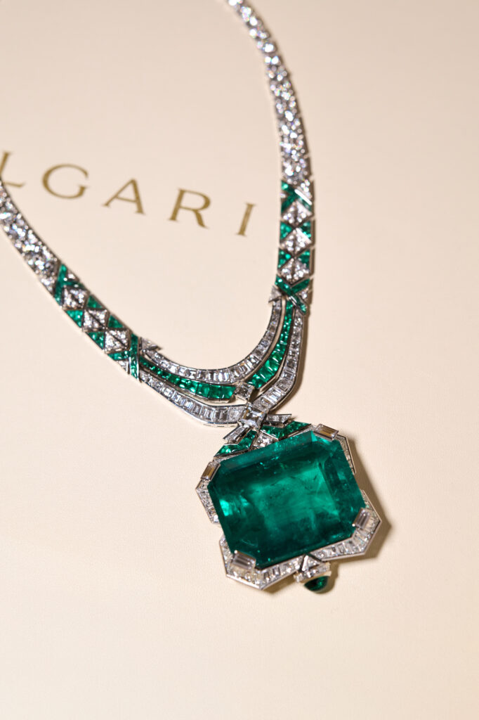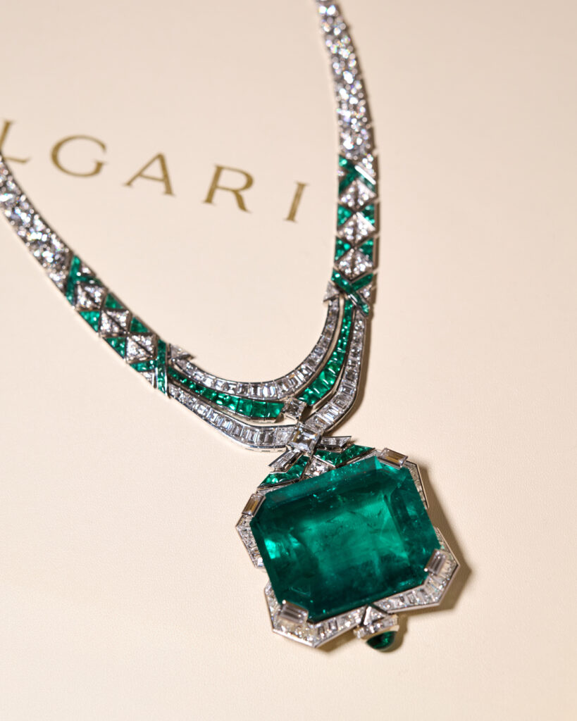 Au centre de ce chef-d’œuvre : une émeraude facettée de 241,06 carats, la plus imposante jamais sertie par la maison romaine. Riche de nuances profondes et d’une pureté hypnotique, cette pierre historique fait du collier une œuvre d’art bijoutière, à la croisée de l’exception et de l’héritage.