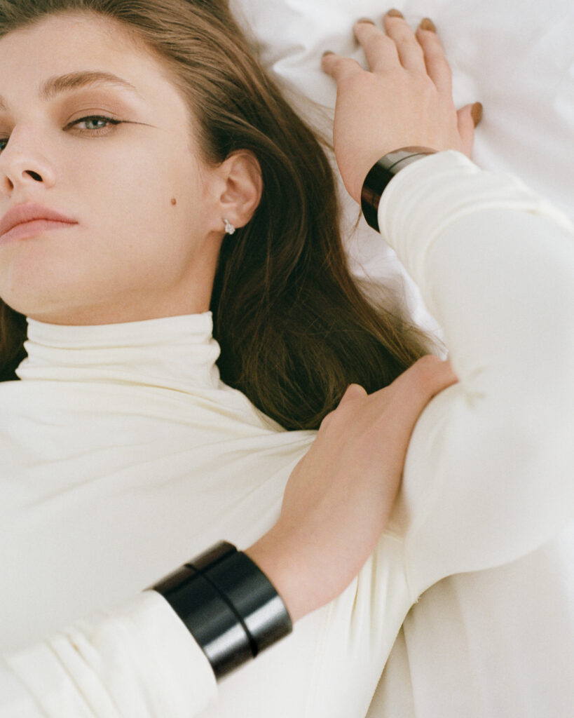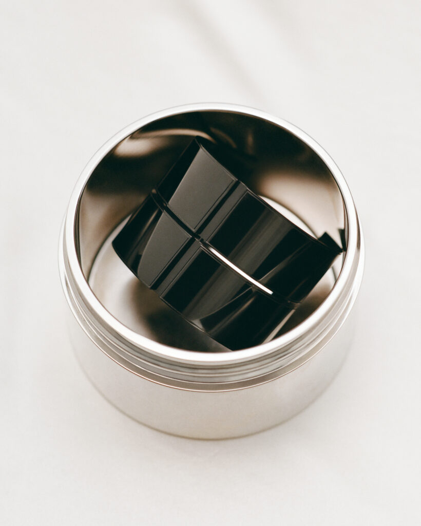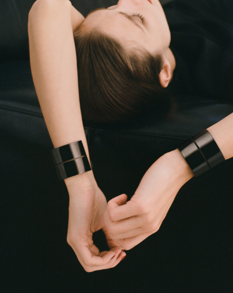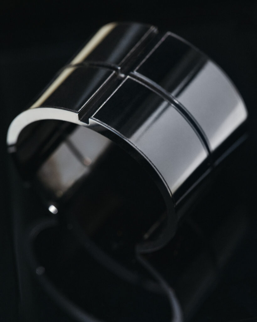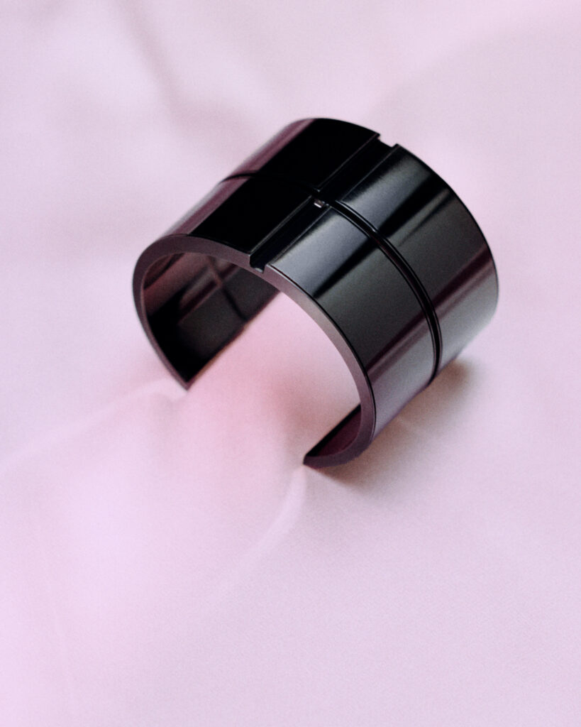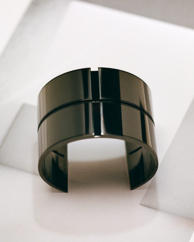 Ce jeu de lumière et d’ombre confère au bracelet une dimension presque cinétique. En mouvement, il alterne éclats et opacité, silence et résonance, comme une sculpture vivante sur la peau. Un bijou pensé pour interagir avec son environnement, se transformant au fil des reflets et de l’instant.
