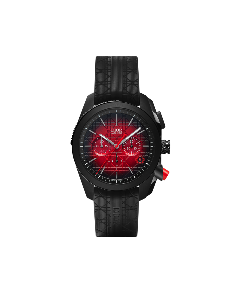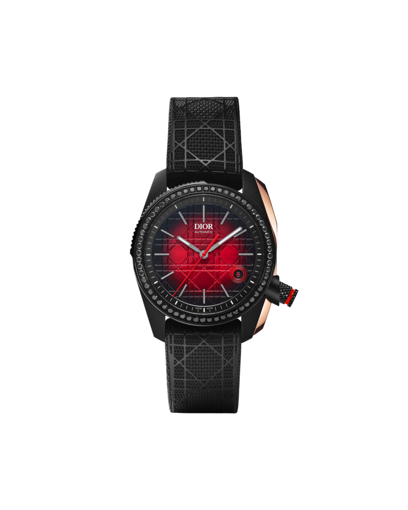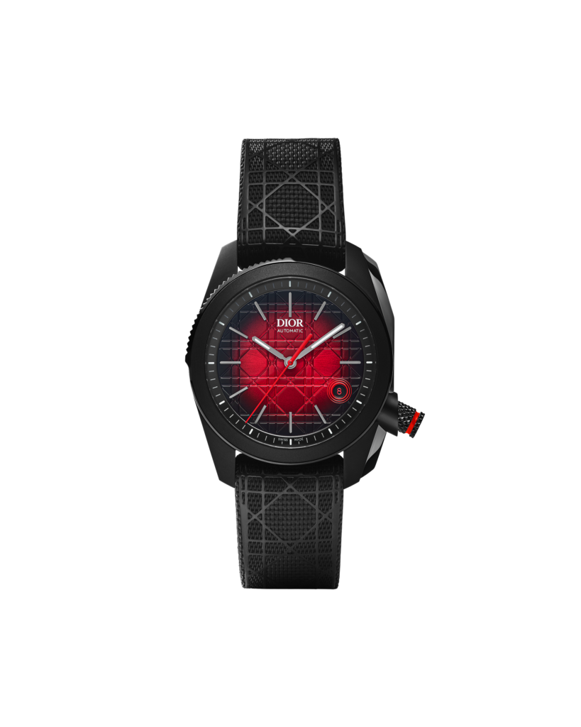 - Des cadrans en dégradé rouge et noir, avec une finition soleil aux reflets vibrants, rappelant les effets de lumière sur les tissus Dior.