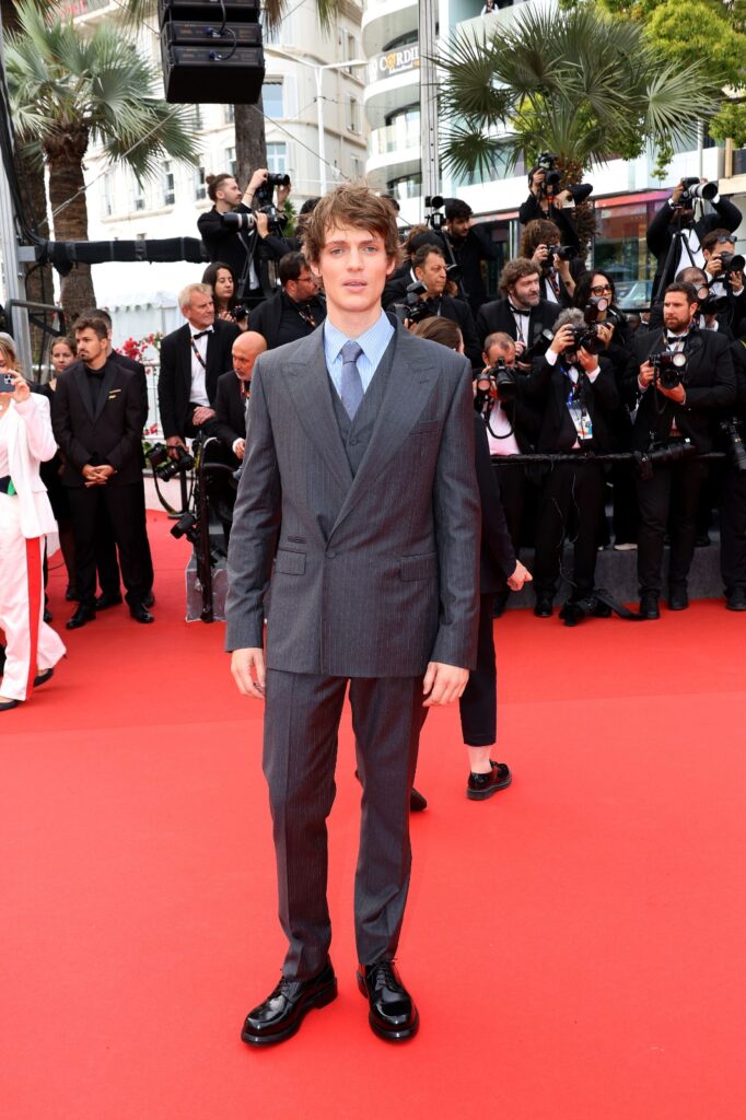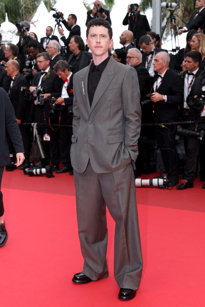 - Finnegan Oldfield s’est illustré dans un costume en laine grise à revers en pointe, sobrement associé à une chemise noire et des souliers Carlo en cuir noir – une allure intemporelle à l’élégance muette.