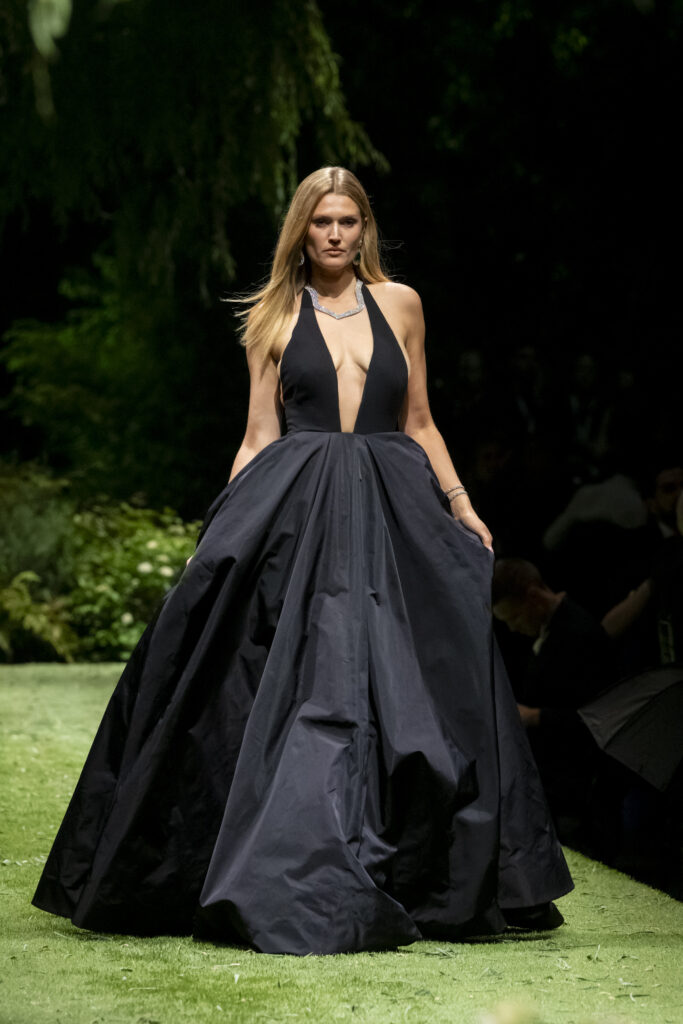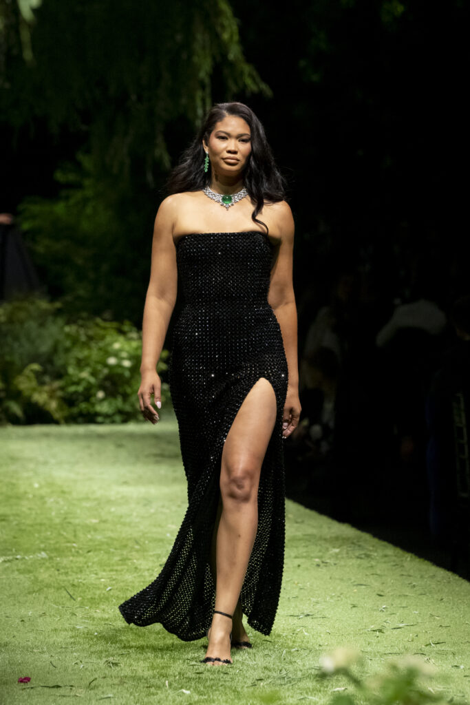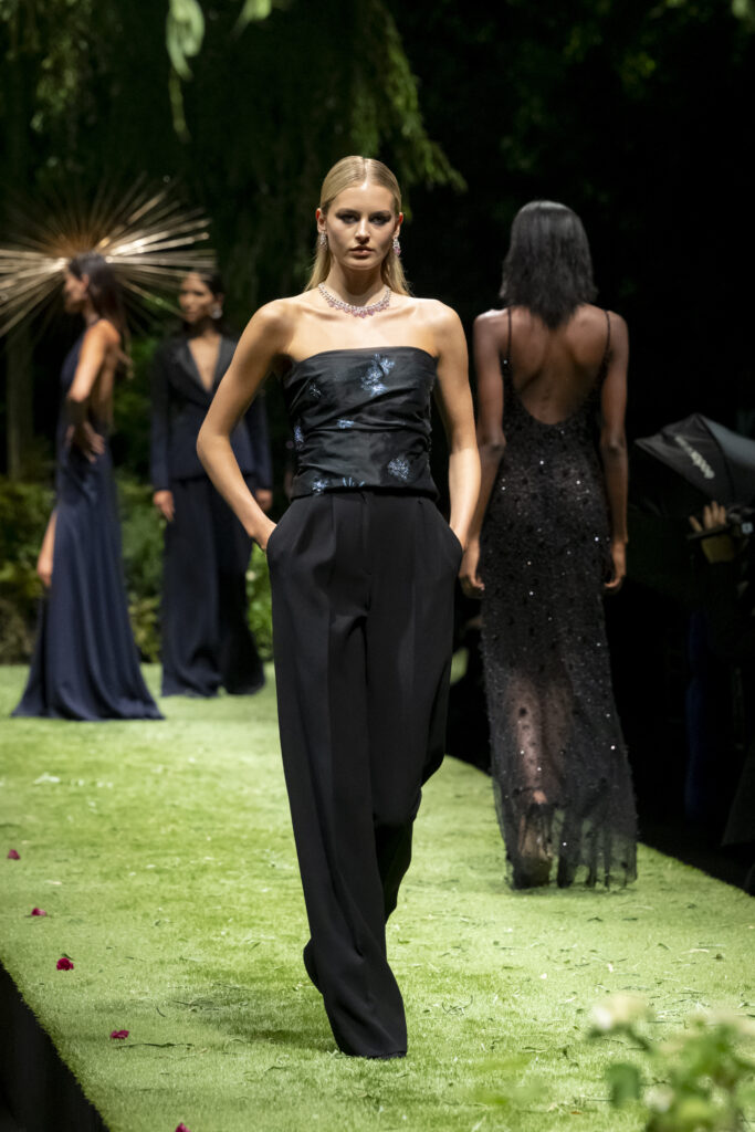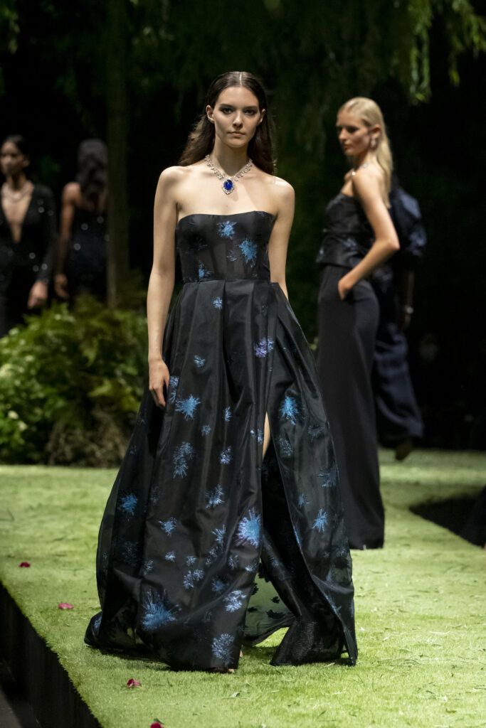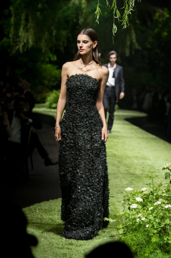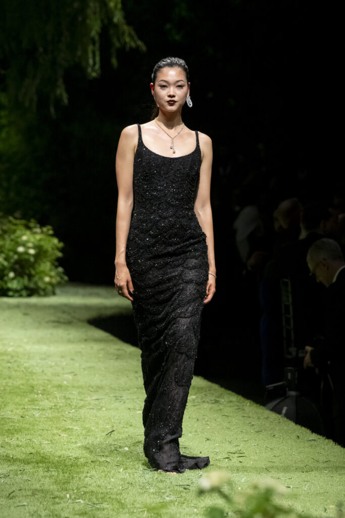 Clin d’œil à l’ADN de Chopard, les signatures joaillières iconiques telles que les collections Happy Hearts et Ice Cube ponctuent discrètement les tenues, tissant le lien entre Haute Joaillerie et Haute Couture.