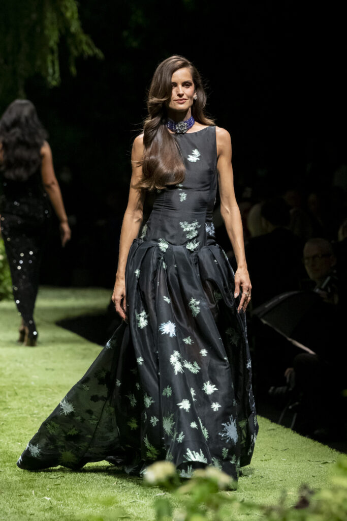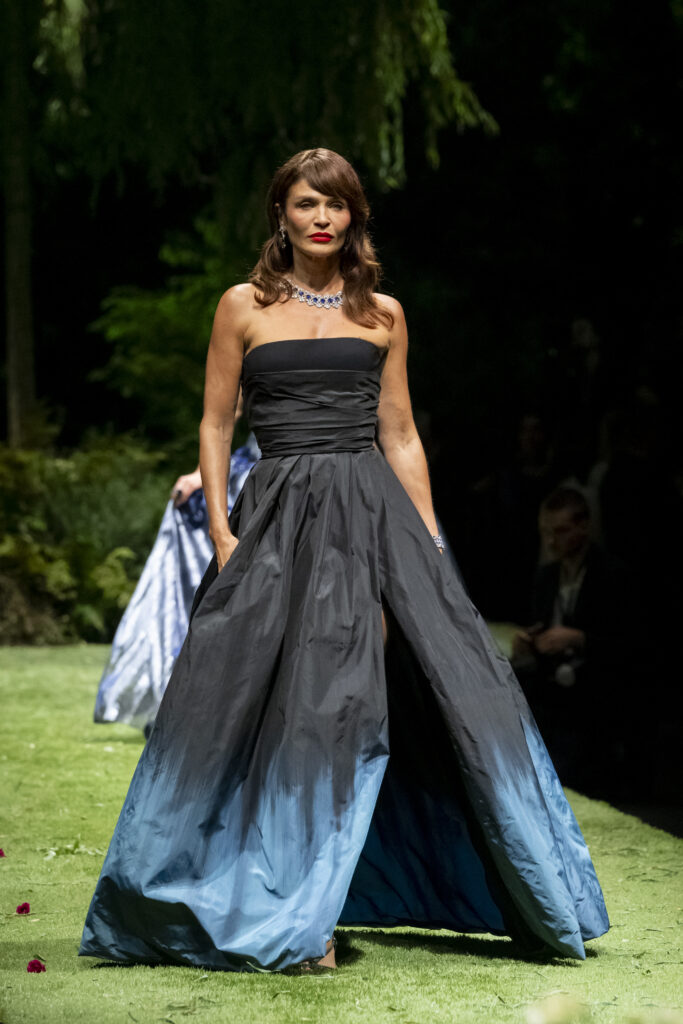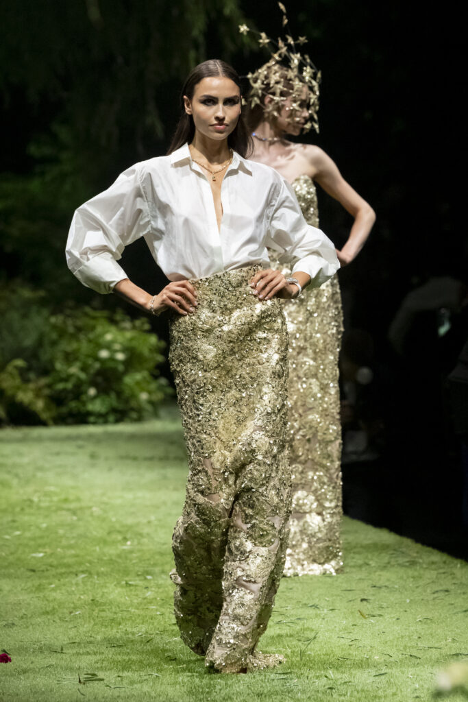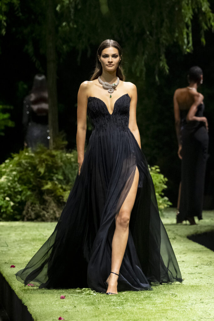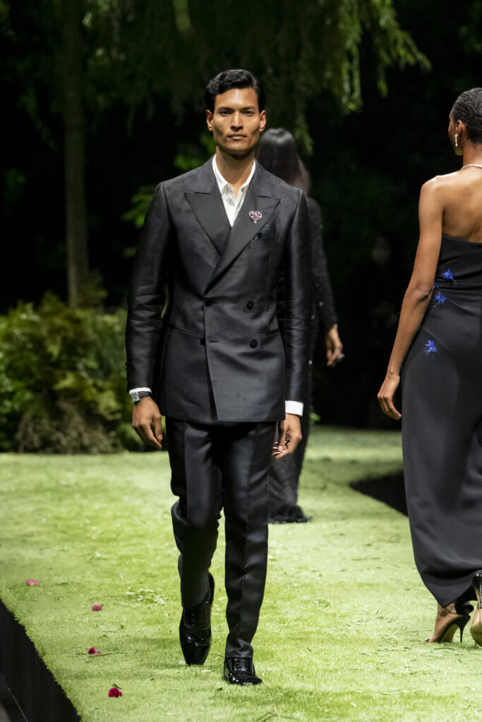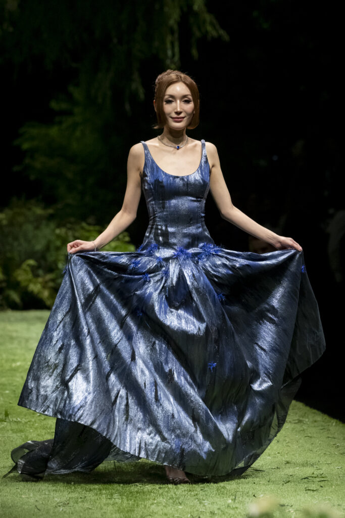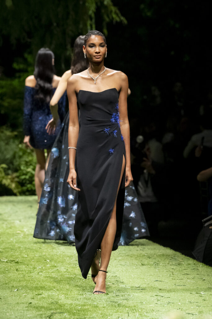 Clin d’œil à l’ADN de Chopard, les signatures joaillières iconiques telles que les collections Happy Hearts et Ice Cube ponctuent discrètement les tenues, tissant le lien entre Haute Joaillerie et Haute Couture.