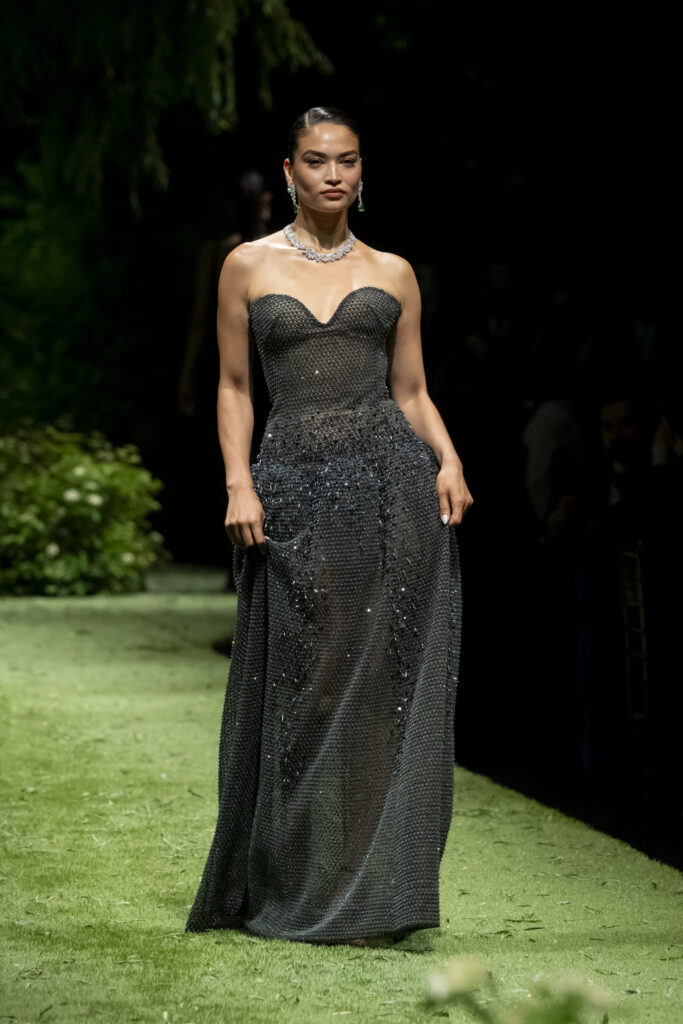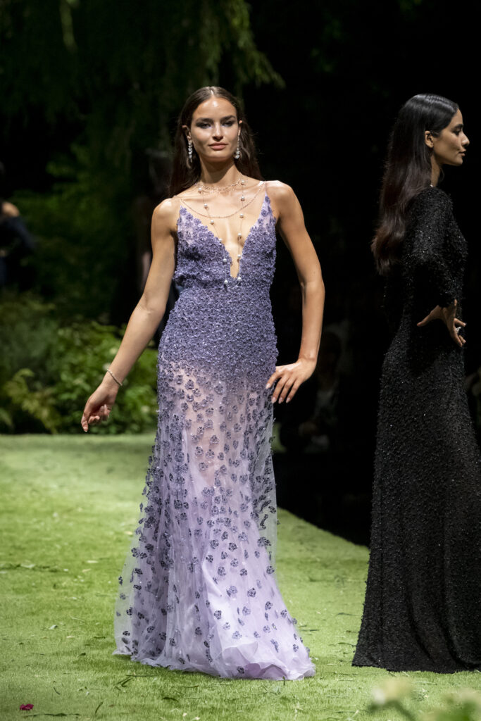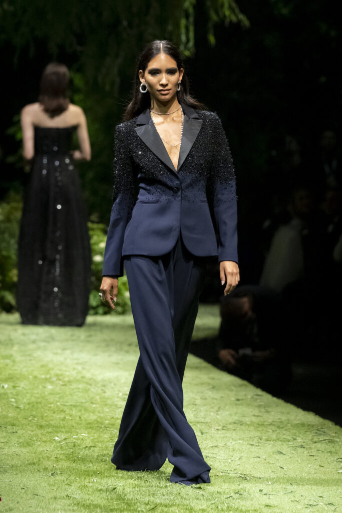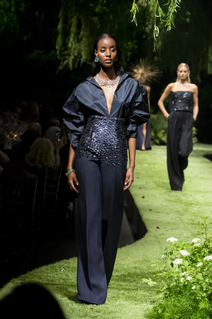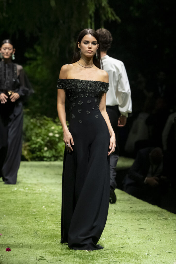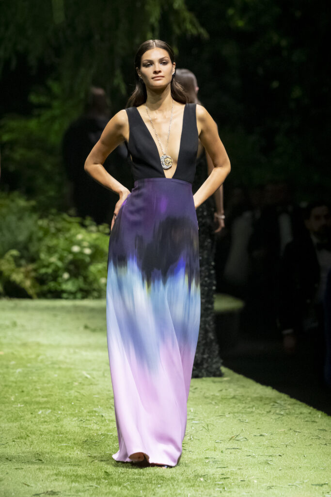 Clin d’œil à l’ADN de Chopard, les signatures joaillières iconiques telles que les collections Happy Hearts et Ice Cube ponctuent discrètement les tenues, tissant le lien entre Haute Joaillerie et Haute Couture.