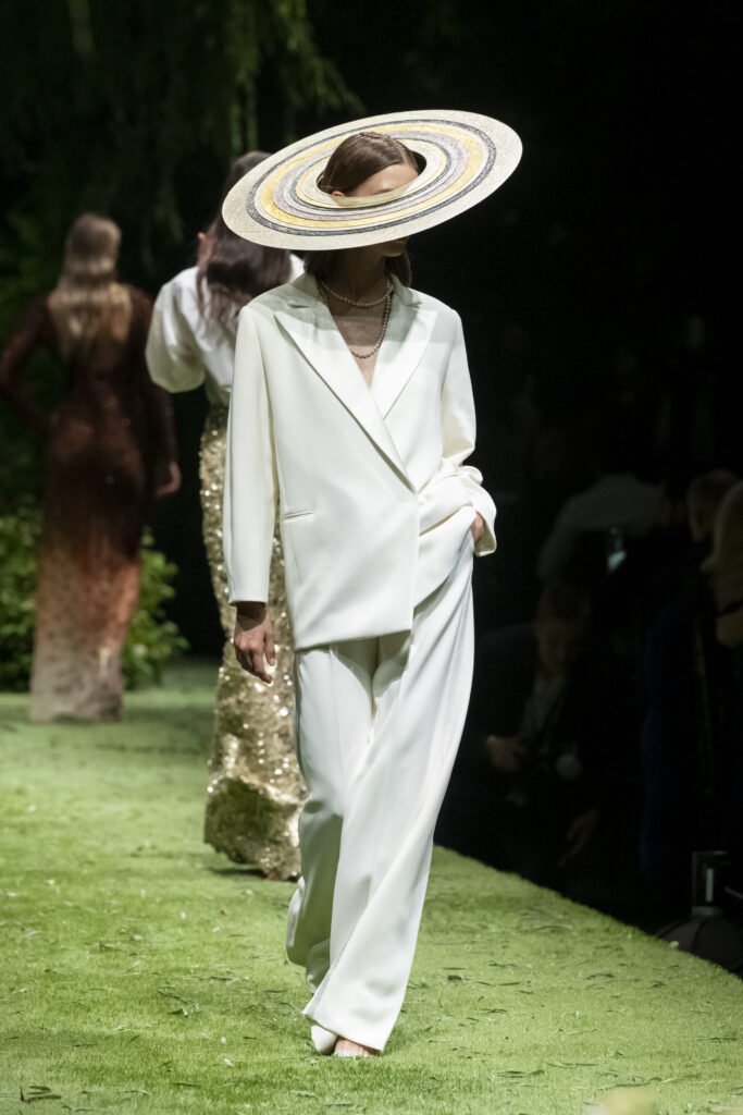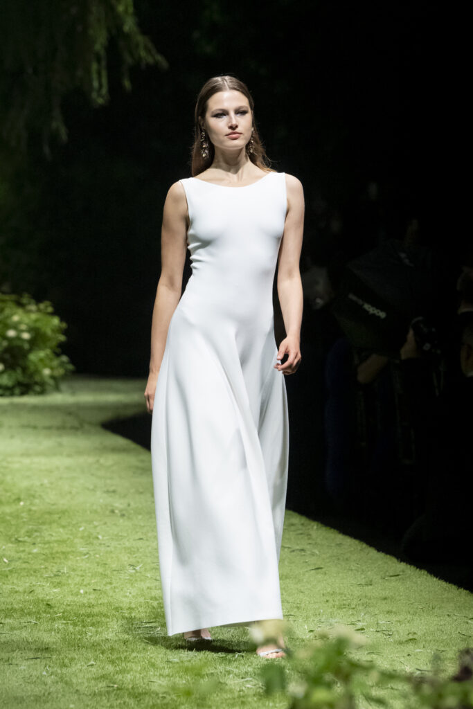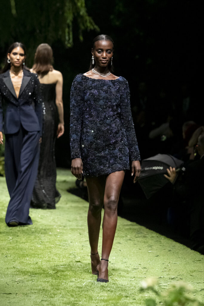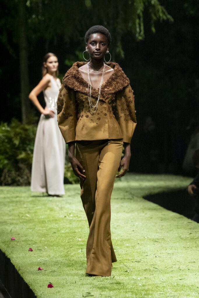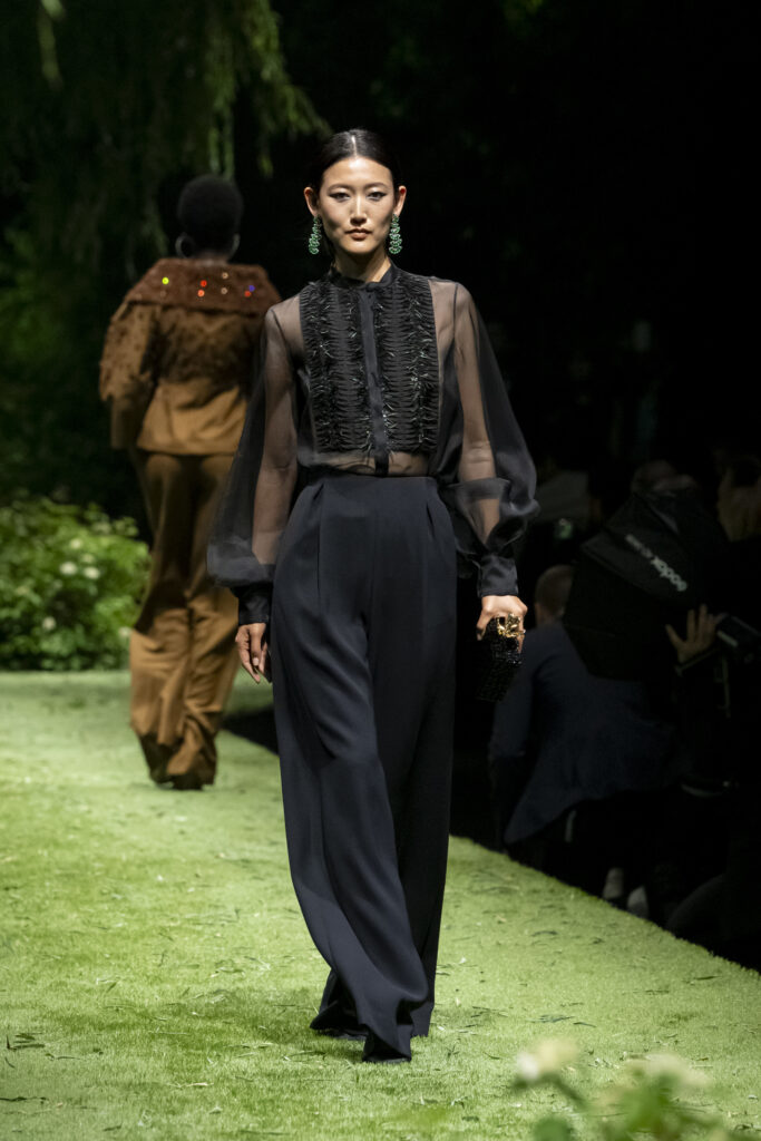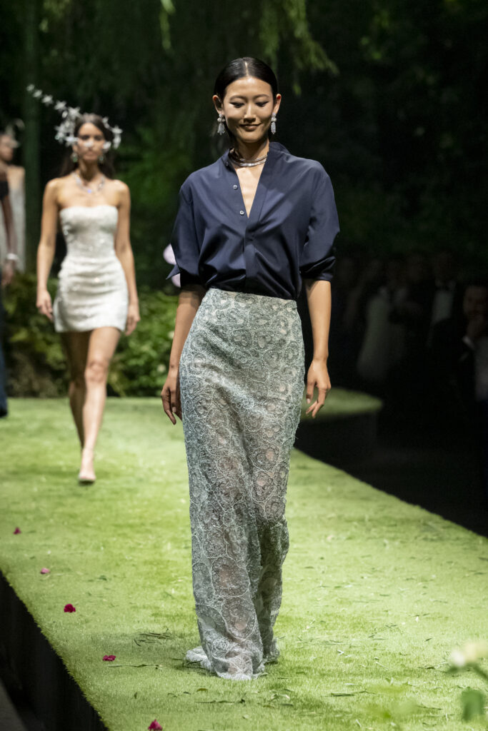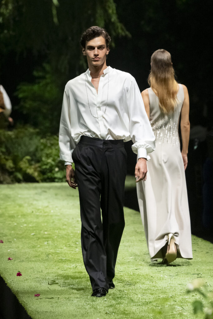 - Casadei, pour une ligne exclusive de sandales réalisées dans les tissus et broderies de la collection, finalisant chaque silhouette avec gravité et légèreté.