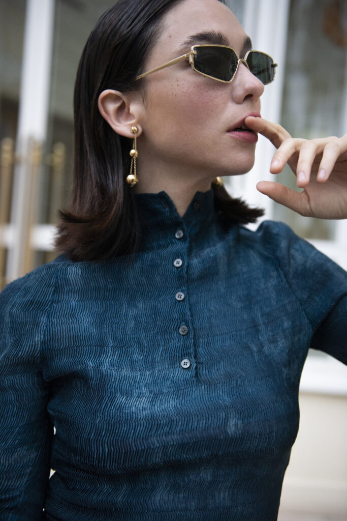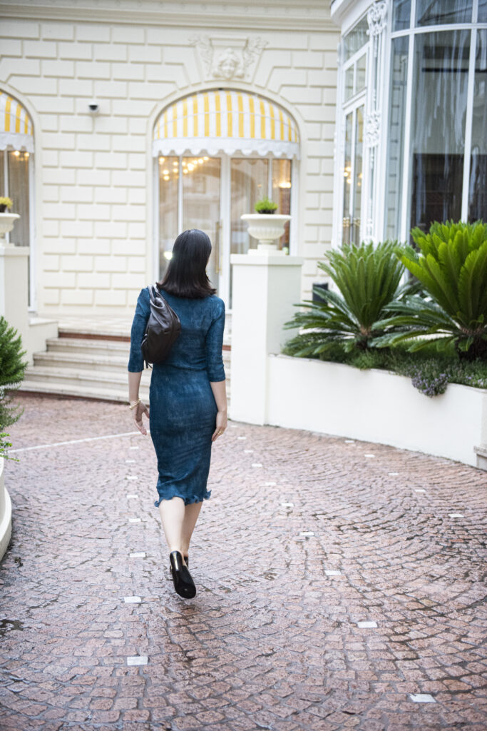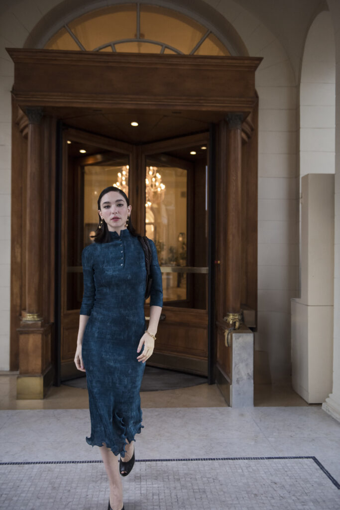 La comédienne a opté pour une robe stretch bleu pétrole, fluide et structurée, issue de la collection FENDI automne-hiver 2025-26, conjuguant modernité urbaine et sensualité discrète. Elle l’associe à des mules noires épurées, des lunettes de soleil FENDI au design graphique, et surtout à l’accessoire phare de la saison : le nouveau Spy Bag en cuir brun, réinterprétation subtile d’une icône de la Maison.