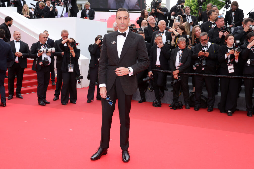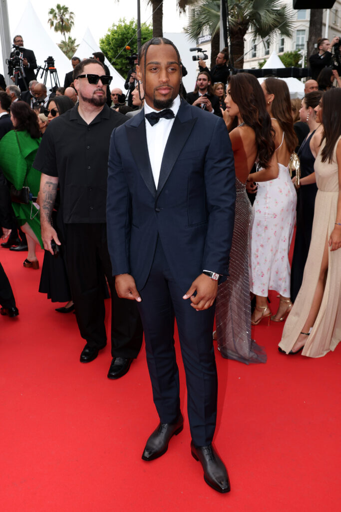 De son côté, Kyler Gordon a choisi un costume en mohair bleu marine et satin, agrémenté d’une chemise blanche à poignets mousquetaires, d’un nœud papillon en satin de soie bleu nuit, et de souliers Alessandro Demesure patinés en cuir Venezia Nero Grigio. Une interprétation fraîche et lumineuse du smoking classique, idéale pour la Croisette.